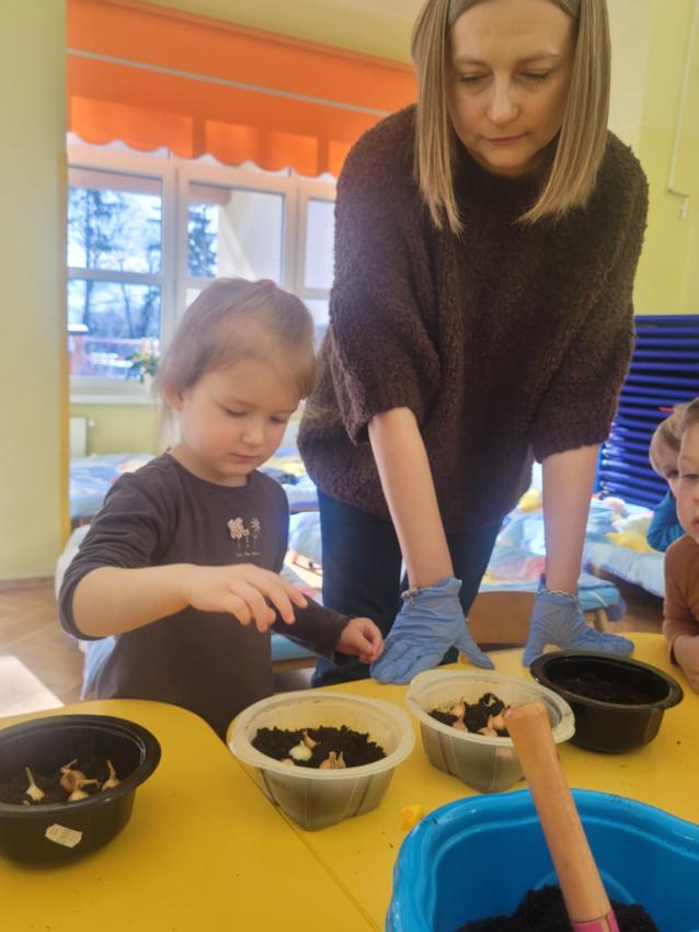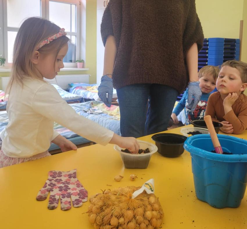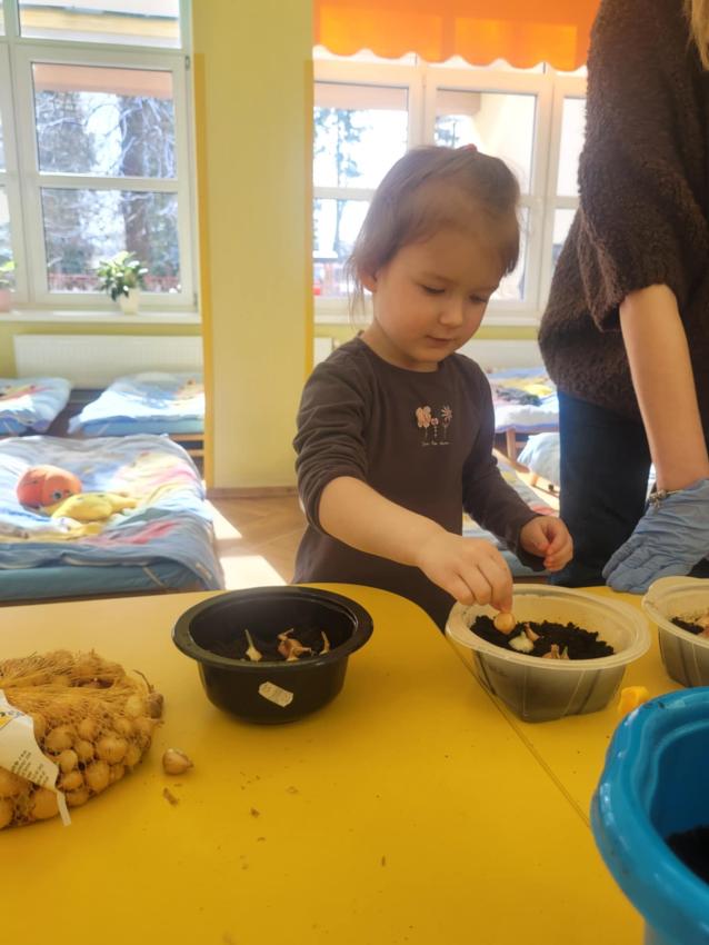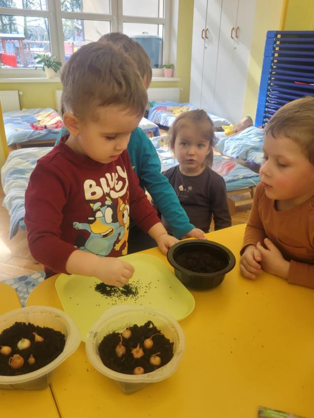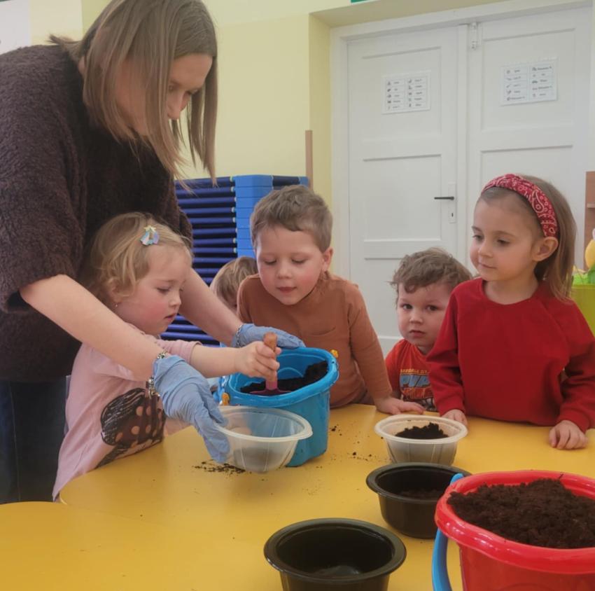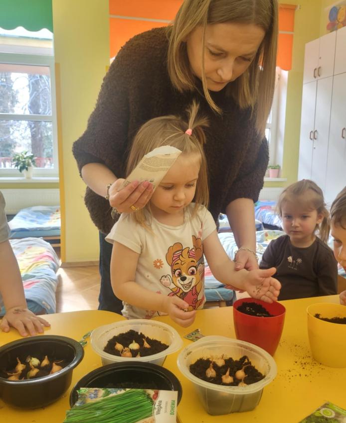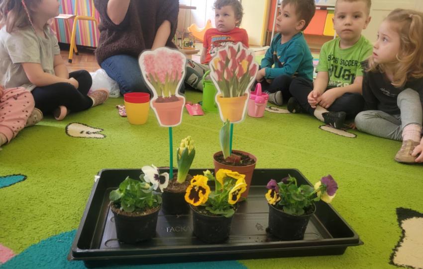 Świat dookoła robi się coraz bardziej zielony - w końcu nadeszła wiosna. Pracowite Pszczołki również chciały, aby ich sala zazieleniła się, więc postanowiły założyć wiosenny kącik. Dzieci samodzielnie napełniały doniczki ziemią, po czym przystąpiły do sadzenia wiosennych kwiatów m.in. tulipanów, hiacyntów, bratków oraz posadziły cebulki na szczypiorek, zasiały koperek i pietruszkę. Dzieci wysłuchały także kolejnego opowiadania o Kici Koci pt. Wiosna.