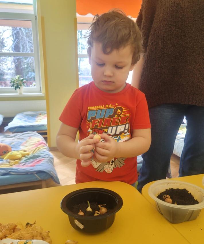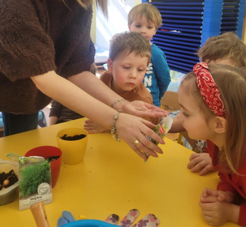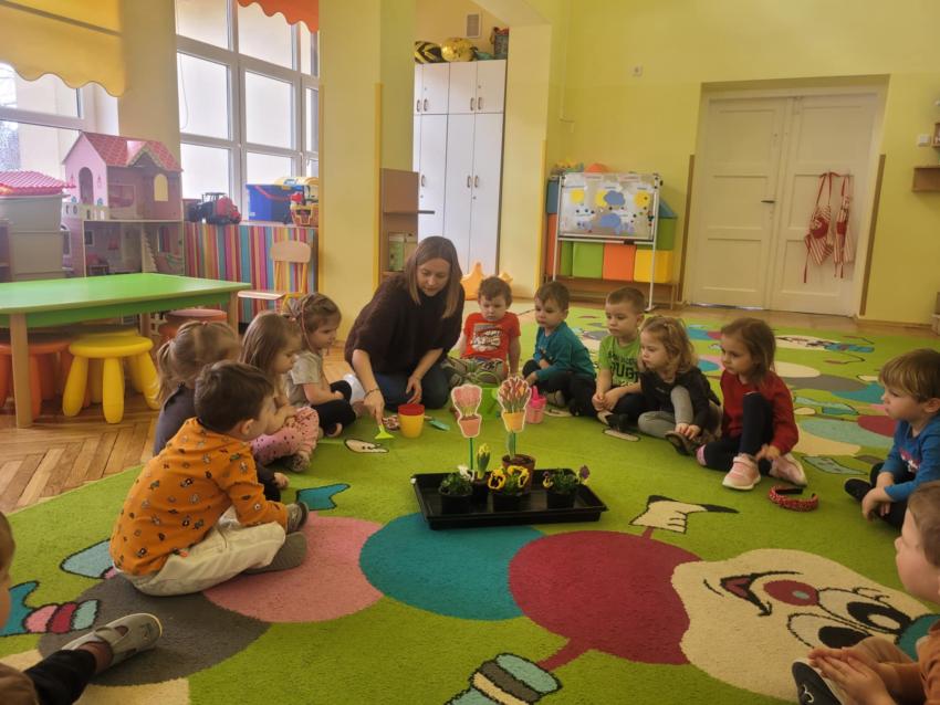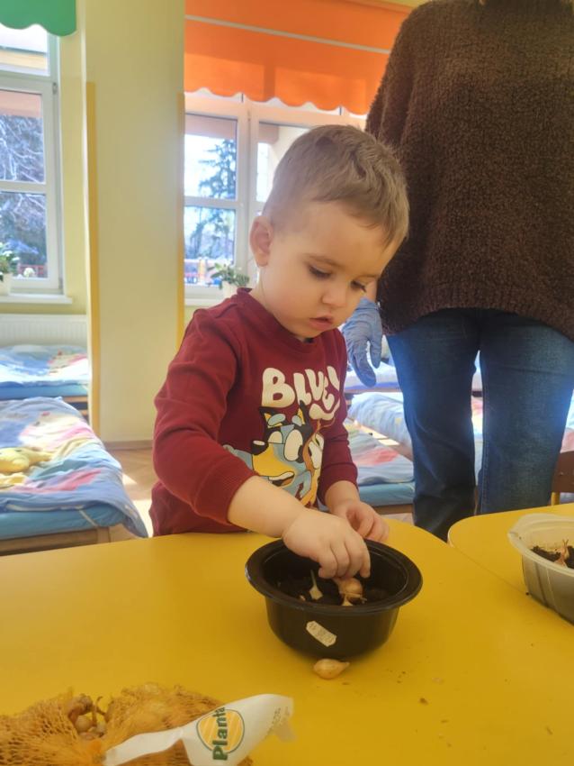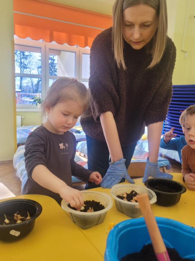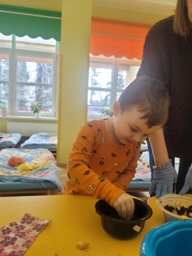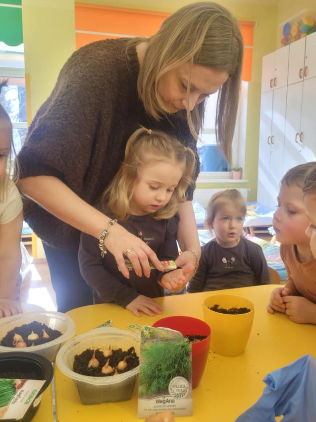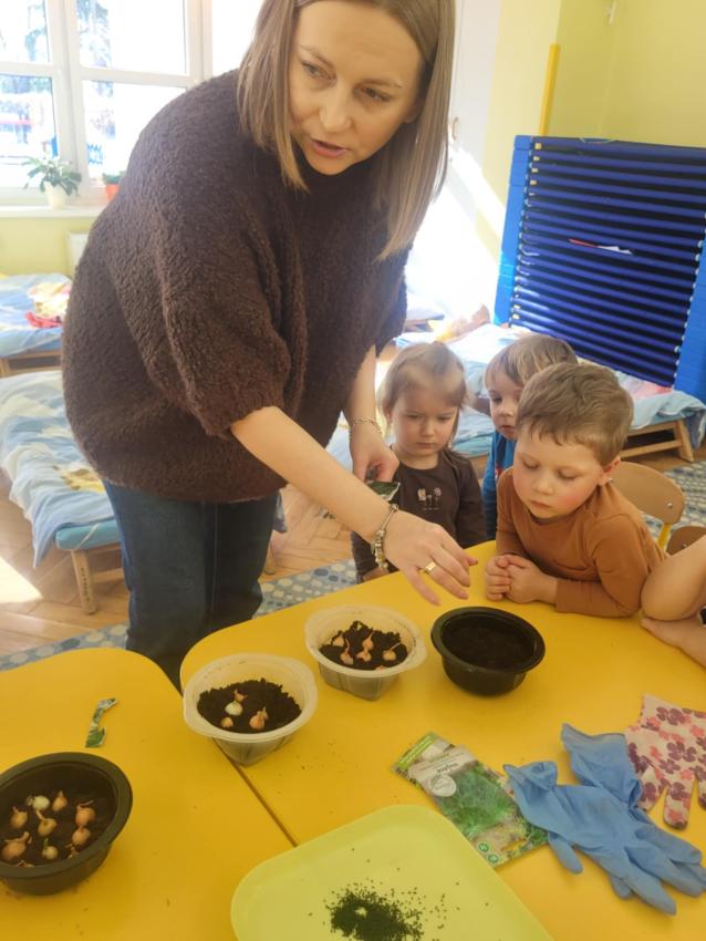Świat dookoła robi się coraz bardziej zielony - w końcu nadeszła wiosna. Pracowite Pszczołki również chciały, aby ich sala zazieleniła się, więc postanowiły założyć wiosenny kącik. Dzieci samodzielnie napełniały doniczki ziemią, po czym przystąpiły do sadzenia wiosennych kwiatów m.in. tulipanów, hiacyntów, bratków oraz posadziły cebulki na szczypiorek, zasiały koperek i pietruszkę. Dzieci wysłuchały także kolejnego opowiadania o Kici Koci pt. Wiosna.
