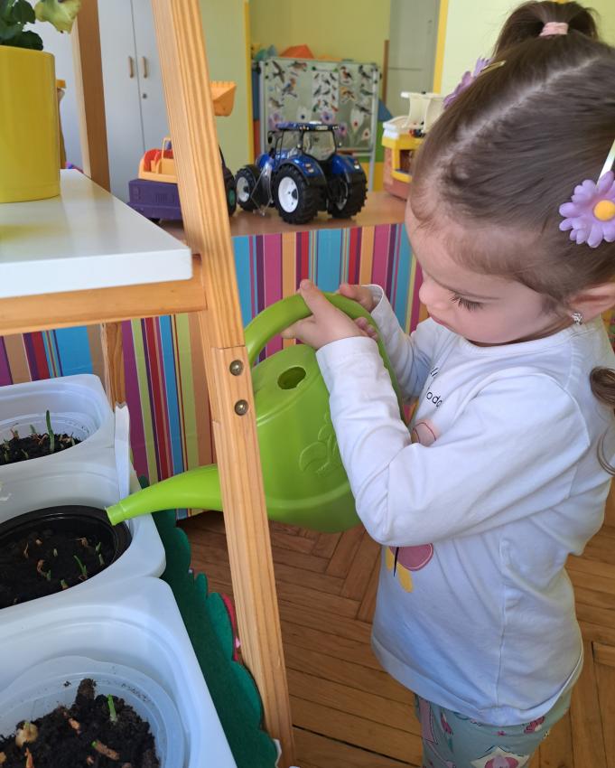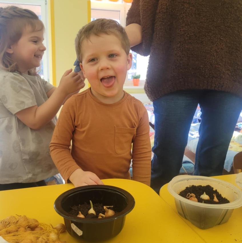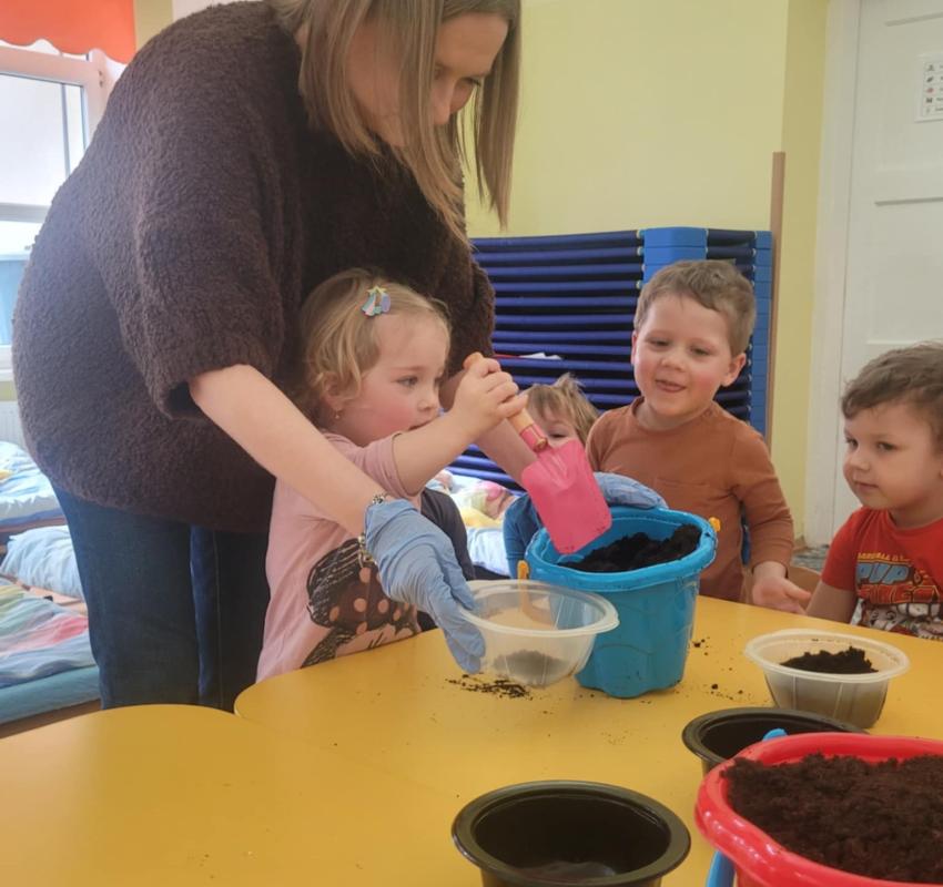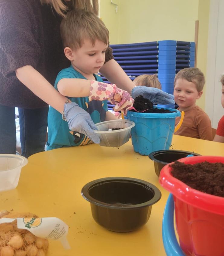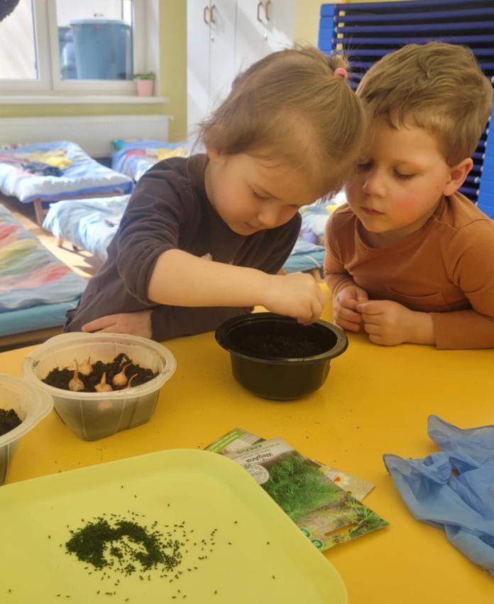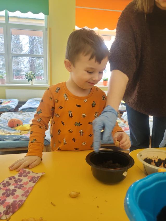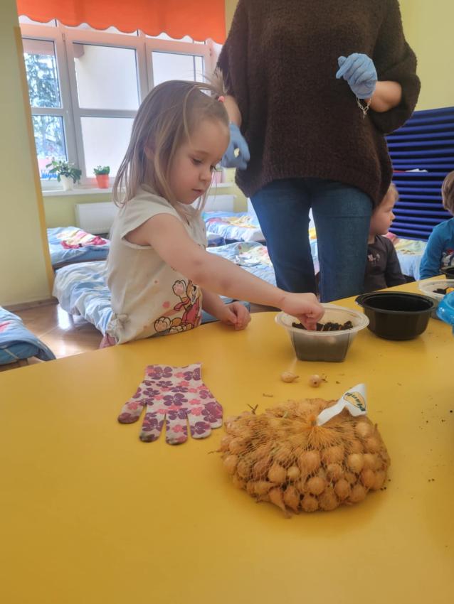 Świat dookoła robi się coraz bardziej zielony - w końcu nadeszła wiosna. Pracowite Pszczołki również chciały, aby ich sala zazieleniła się, więc postanowiły założyć wiosenny kącik. Dzieci samodzielnie napełniały doniczki ziemią, po czym przystąpiły do sadzenia wiosennych kwiatów m.in. tulipanów, hiacyntów, bratków oraz posadziły cebulki na szczypiorek, zasiały koperek i pietruszkę. Dzieci wysłuchały także kolejnego opowiadania o Kici Koci pt. Wiosna.