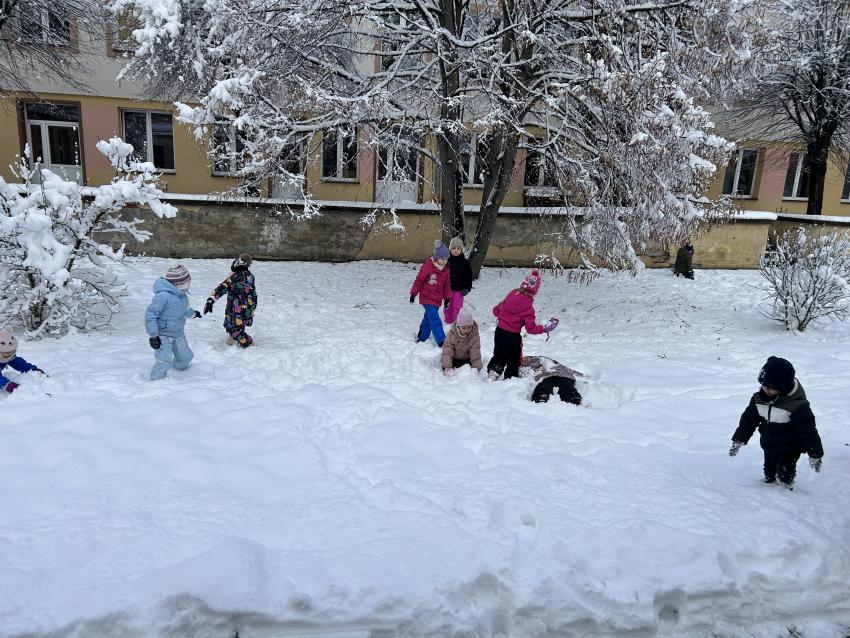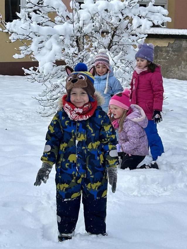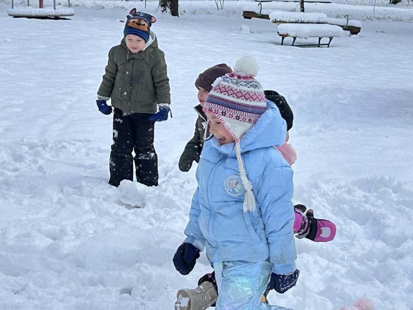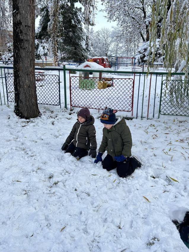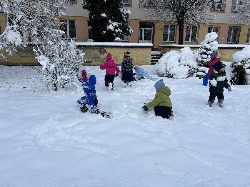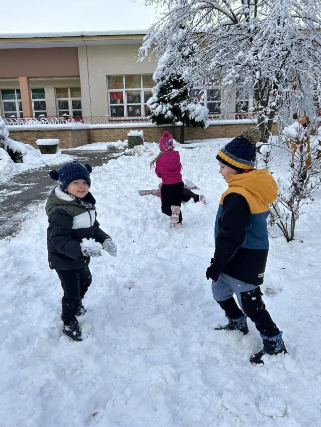 Przedszkolaki z radością biegają po śniegu, lepią bałwana i rzucają się śnieżkami, tworząc wesołą zimową zabawę. Z entuzjazmem robią aniołki na śniegu i z dumą prezentują swoje zimowe dzieła ? śnieżne kule, bałwanki i małe budowle, ciesząc się każdą chwilą spędzoną na świeżym powietrzu.