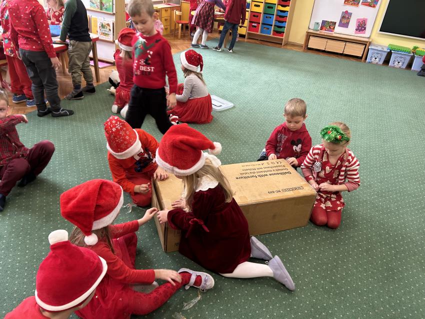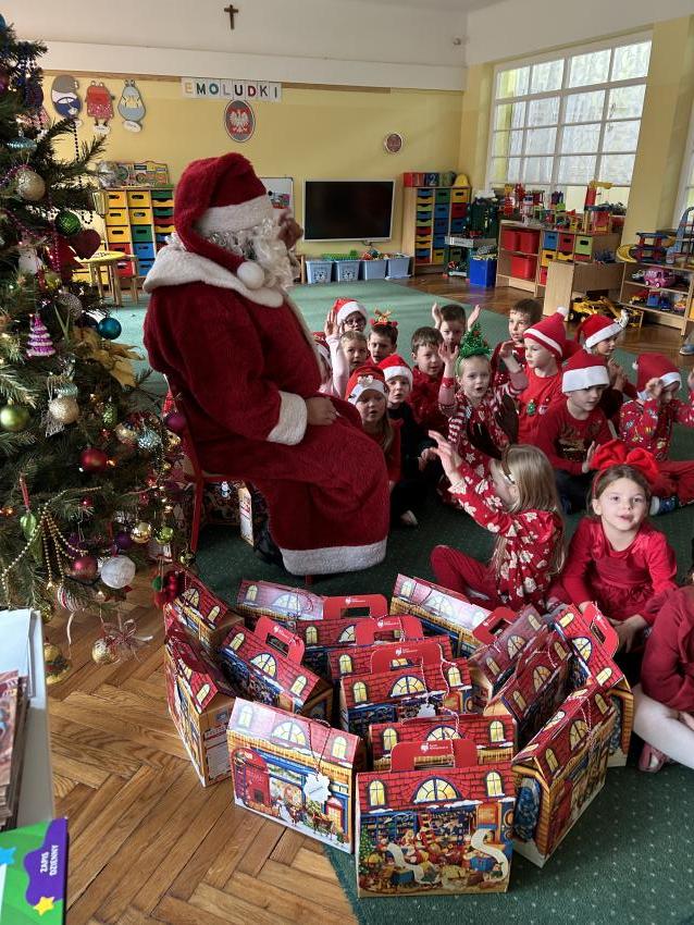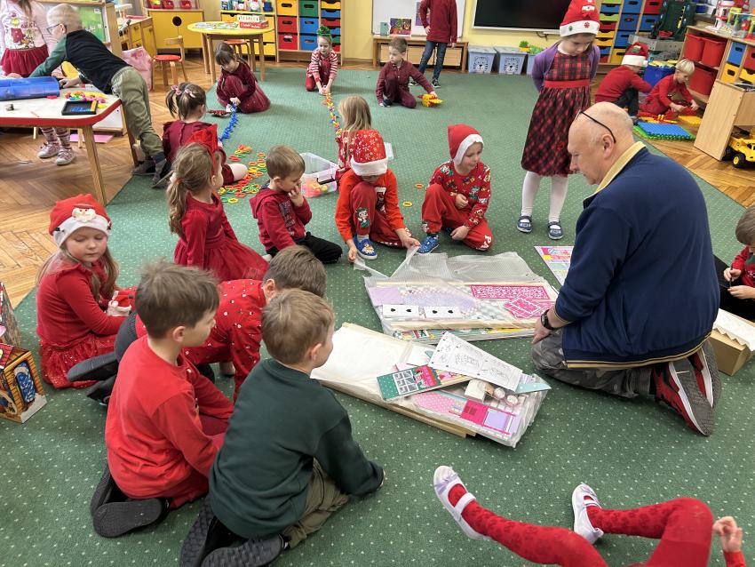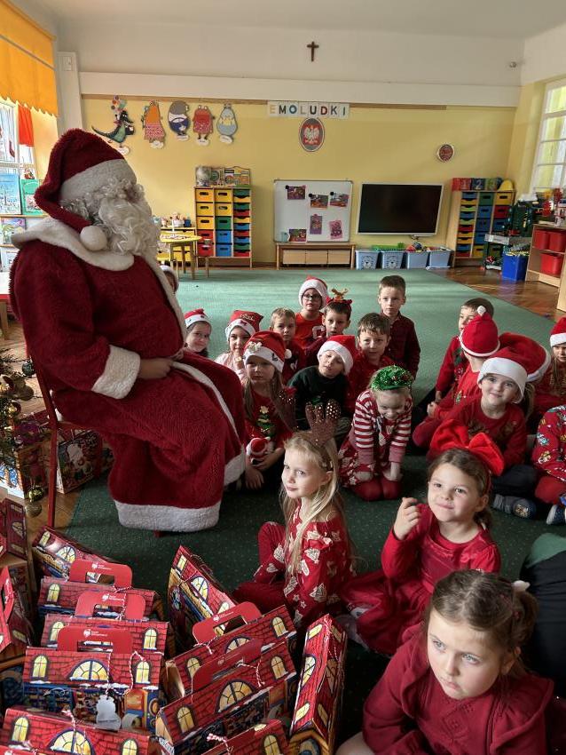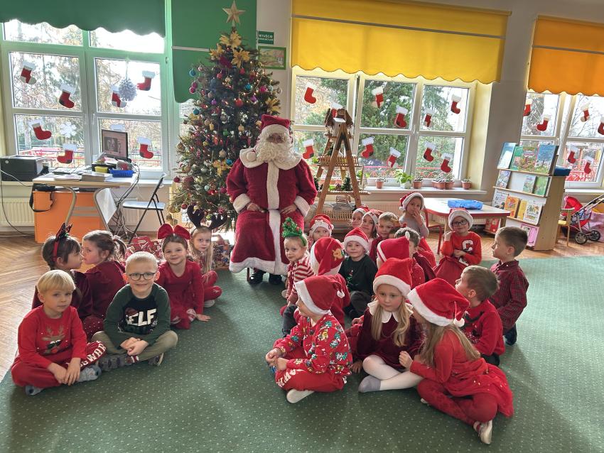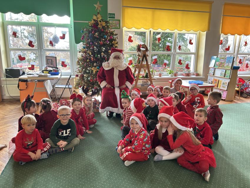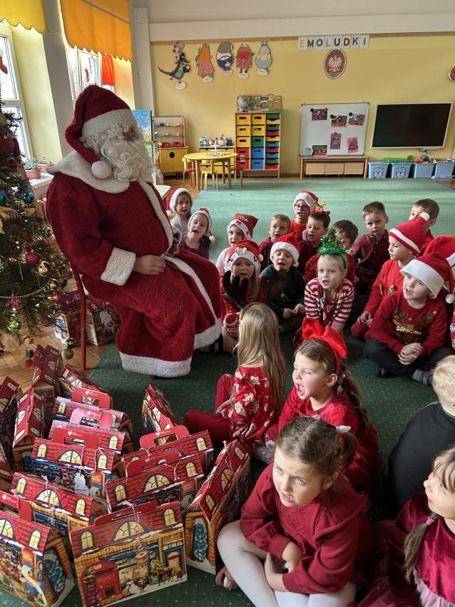 W przedszkolu panowała dziś wyjątkowo radosna atmosfera, ponieważ dzieci odwiedził długo wyczekiwany gość ? Święty Mikołaj. Już od rana maluchy z niecierpliwością wypatrywały jego przybycia, a gdy tylko pojawił się w sali, na ich twarzach od razu zagościły szerokie uśmiechy.