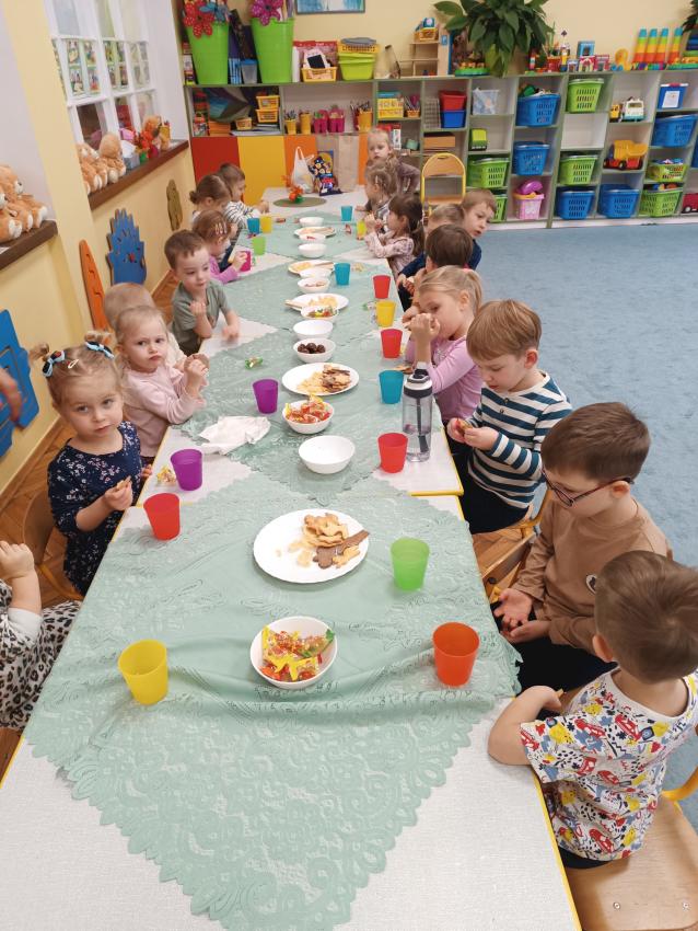 Od samego rana w przedszkolu rozbrzmiewały kolędy. Dzieci odświętnie ubrane oczekiwały na przedszkolną wigilię. Wcześniej jednak uczestniczyły w ciekawym przedstawieniu świątecznym przygotowanym przez gr. V oraz  w rozstrzygnięciu konkursu /słodkie ozdoby choinkowe/. Dużą niespodziankę sprawiła nam wizyta Pani Moniki, z którą śpiewaliśmy kolędy, dzielili opłatkiem i zasiedli do wspólnego stołu, na którym królował barszczyk, rybka oraz kompot z suszu. Atmosfera była bardzo przyjemna.