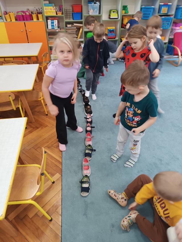 Podczas zajęć, dotyczących różnych rodzajów butów i rozmowy na temat  ich zastosowania, przeprowadzono zabawę z wykorzystaniem pantofli / Układamy pociąg z butów/  Dzieci porównywały długości, a także ćwiczyły spostrzegawczość.