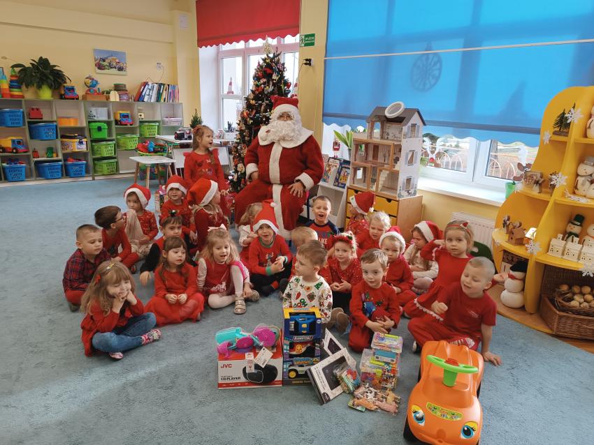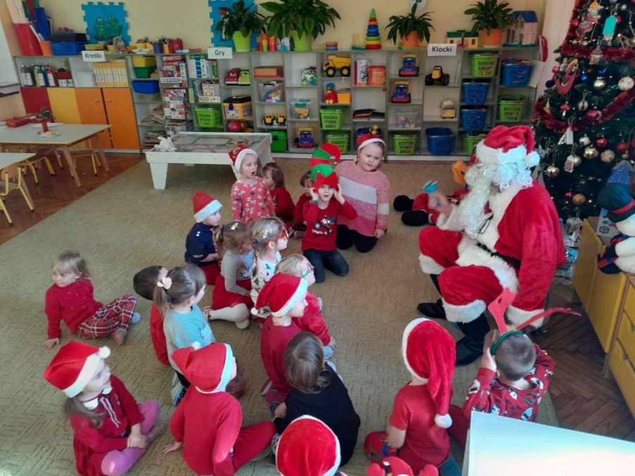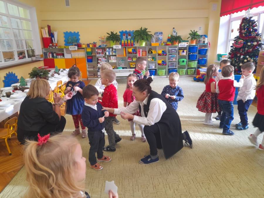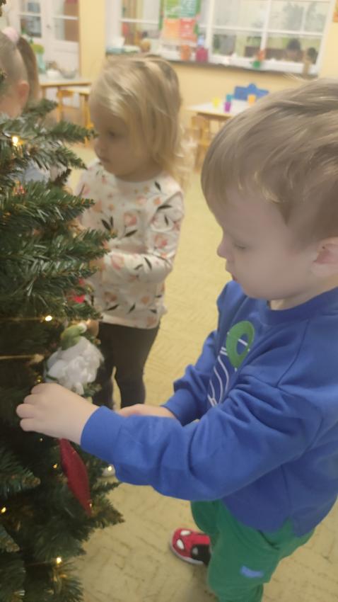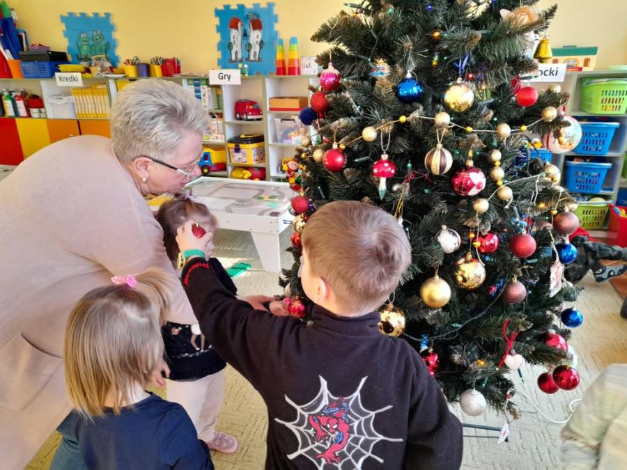 Był to dzień wyjątkowy. Dzieci z wielkim zaangażowaniem i radością zawieszały ozdoby na choince. Pięknie przybrane drzewko, przypomina nam, że Święta Bożego Narodzenia już tuż, tuż. Na choince zawisły też prezenciki od rodziców, które muszą poczekać (na zjedzenie) aż do Świąt.