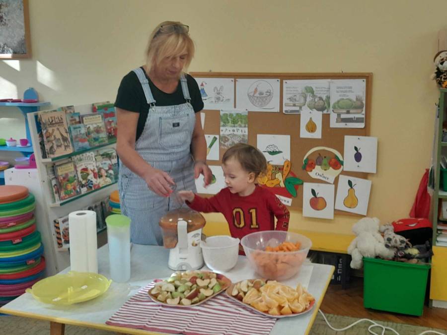 Miło było patrzeć, jak wszystkie dzieci degustują soki zrobione przez nich samych. Z wielkim zaangażowaniem asystowały przy produkcji soku, wiedząc jak działa sokowirówka. Zwrócono uwagę, że one same jeszcze nie mogą jej uruchamiać tylko w obecności dorosłej osoby. Nie obyło się też bez pogadanki na temat zdrowego odżywiania. Ciekawe zajęcie zainspirowało nas opiekunów do powstania ładnych prac plastyczno-technicznych z wykorzystaniem farb gwaszowych, plasteliny oraz kredek.