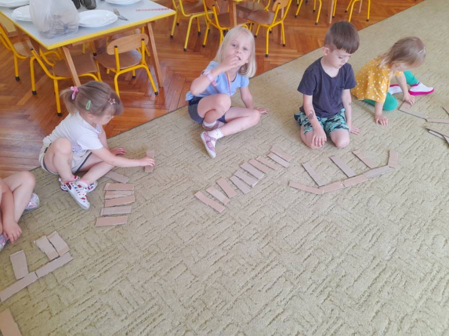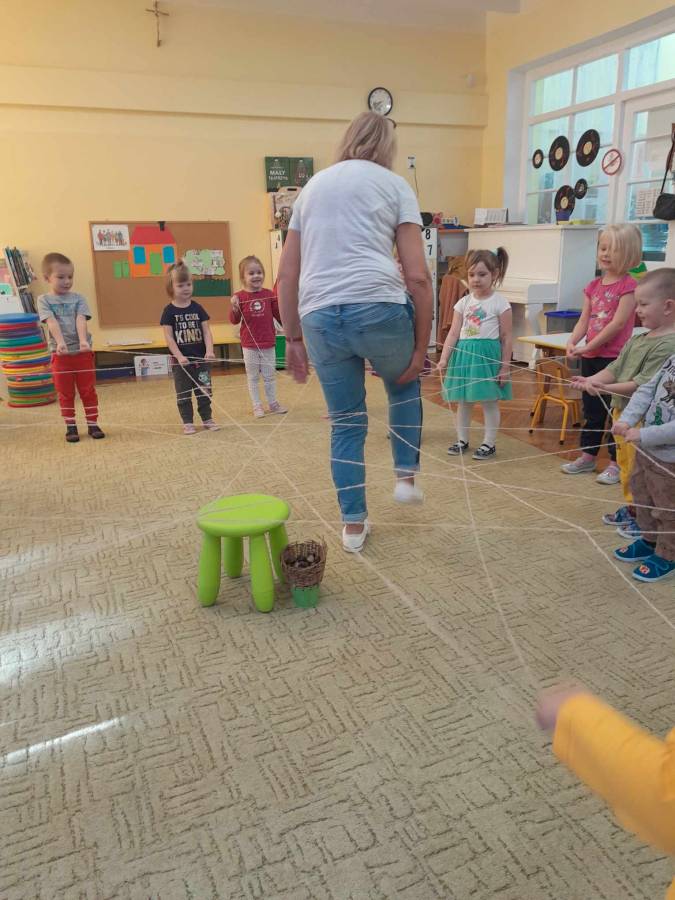Dzieci chętnie podejmują zabawy matematyczne. Podczas tych zajęć dzieci porządkowały domki od najmniejszego do największego i na odwrót. Dzieci starsze pięknie przeliczały, używając liczebników porządkowych. Zabawa z wykorzystaniem motka wełny i zrobienie wspólnie pająka to kreatywna zabawa. Objaśniono dzieciom na czym ono polegało (kto trzyma motek opowiada o swoim domu). Dzieci zwróciły uwagę, że podczas robienia pająka wyszło wiele trójkątów. Cieszyło ich bardzo uwięzienie w sieci pani.