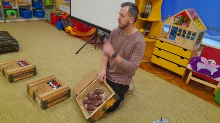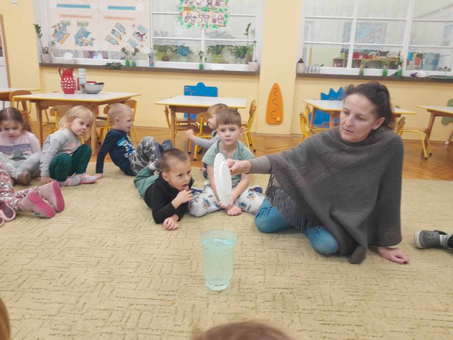 Za pomocą pojemnika z gorącą wodą oraz talerzyka z lodem objaśniono dzieciom skąd bierze się deszcz.