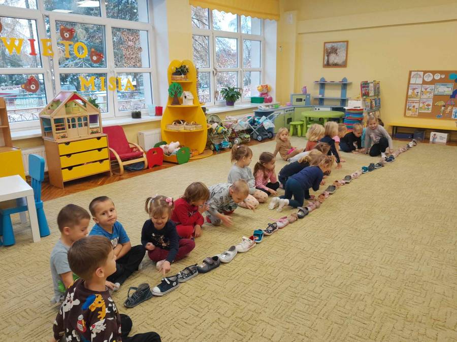 Podczas zajęć, dotyczących różnych rodzajów butów i rozmowy na temat ich zastosowania, przeprowadzono zabawę z wykorzystaniem pantofli / Układamy pociąg z butów/ Dzieci porównywały długości, a także ćwiczyły spostrzegawczość.