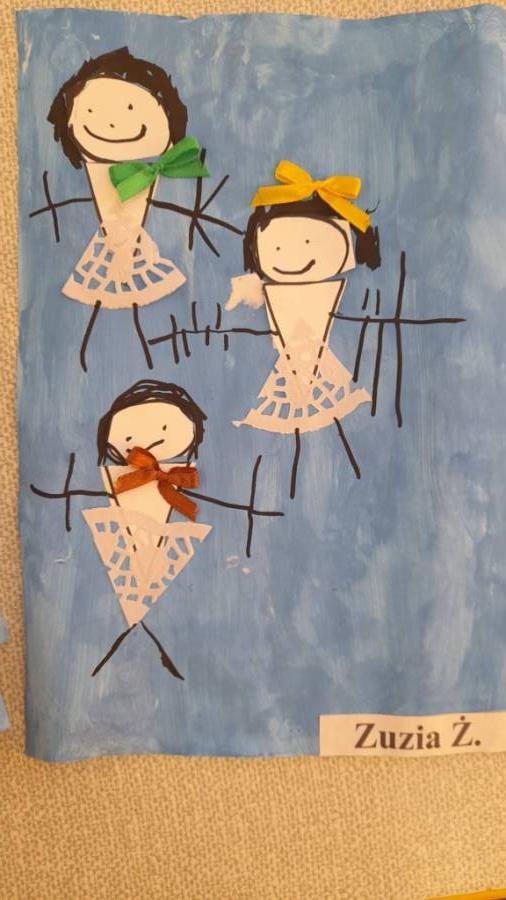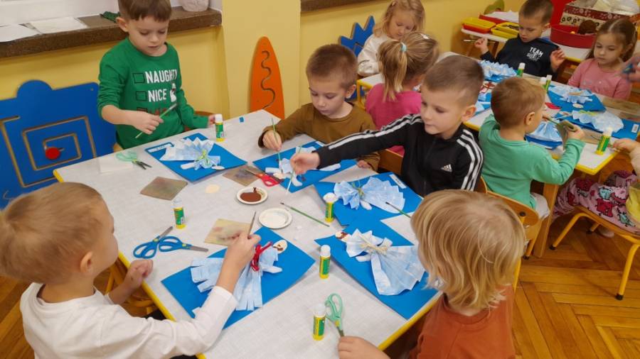 Zima zawitała mroźna, ale nam mróz nie straszny! Rozgrzewamy się tańcząc przy muzyce, naśladując tańczące baletnice z wiersza J. Czernickiej / Śnieżne baletnice/. Wiersz był kolejną inspiracją twórczą. Praca polegała na wycinaniu kształtu trójkąta i koła, naklejaniu na kartkę. Następnie dzieci domalowywały części ciała. Prace odznaczają się dużą ikonografią, są bardzo estetyczne i piękne.