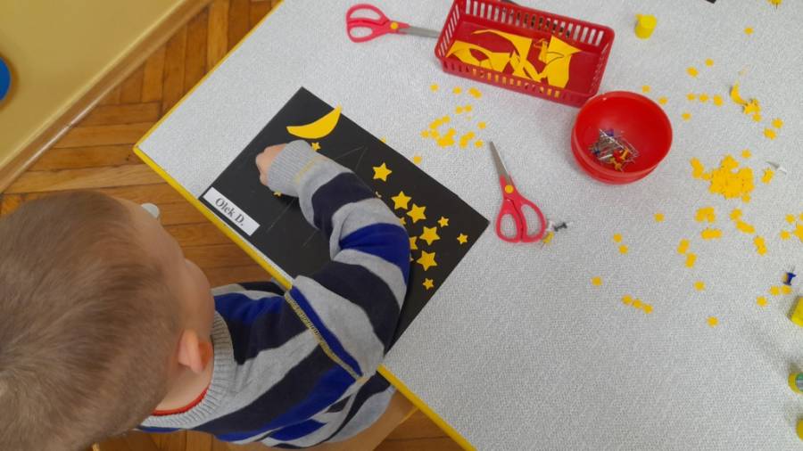 Zajęcia poświęcone omawianiu planet krążących wokół Słońca. Dzieci oglądały książki i ilustracje związane z Kosmosem. Z uwagą słuchały opowiadania Joanny Papuzińskiej pt. /Jak mama zreperowała księżyc/, popartej historyjką obrazkową. Powstały ilustracje wykonane nową techniką. Za pomocą pinezki dzieci wydrapywały domy i wieże miast. Na koniec wycinały Księżyc i łącznie z gwiazdkami naklejały na kartkę. Innym zadaniem, było malowanie gwiazd i księżyca, na który leci rakieta. Zajęcia połączone były z zabawami ruchowymi przy muzyce /w Kosmosie/