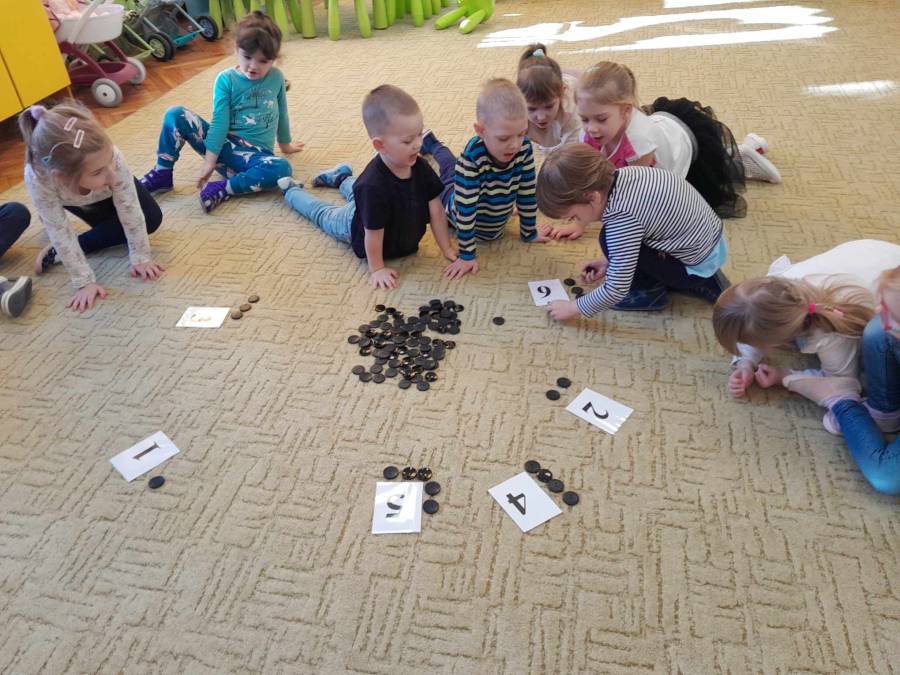 Omawiając temat Krawcowej, do zabawy posłużyły nam guziki. Dzieci, zwłaszcza starsze bardzo dobrze liczą, a nawet niektóre potrafią przyporządkować guziki do odpowiedniej cyfry. Brawo!