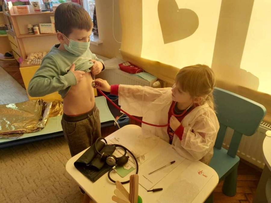 Nasza sala zamieniła się dziś w przychodnię lekarską. Kącik cieszył się dużym zainteresowaniem. Dzieci leczyły, opatrywały rany, wypisywały recepty, pod czujnym okiem pań.