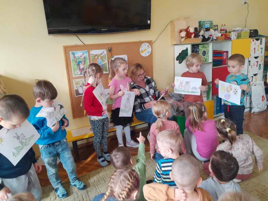 Dzieci poznały zwyczaje związane z Wielkanocą. Wysłuchały opowiadania o zajączku, poparte historyjkami obrazkowymi. Chętnie pomagały w prowadzeniu zajęć, a na pytania dotyczące treści opowiadania, odpowiadały całym zdaniem. Malowanie jajek i wykonanie świątecznych obrazków przyniosły dzieciom wiele radości.