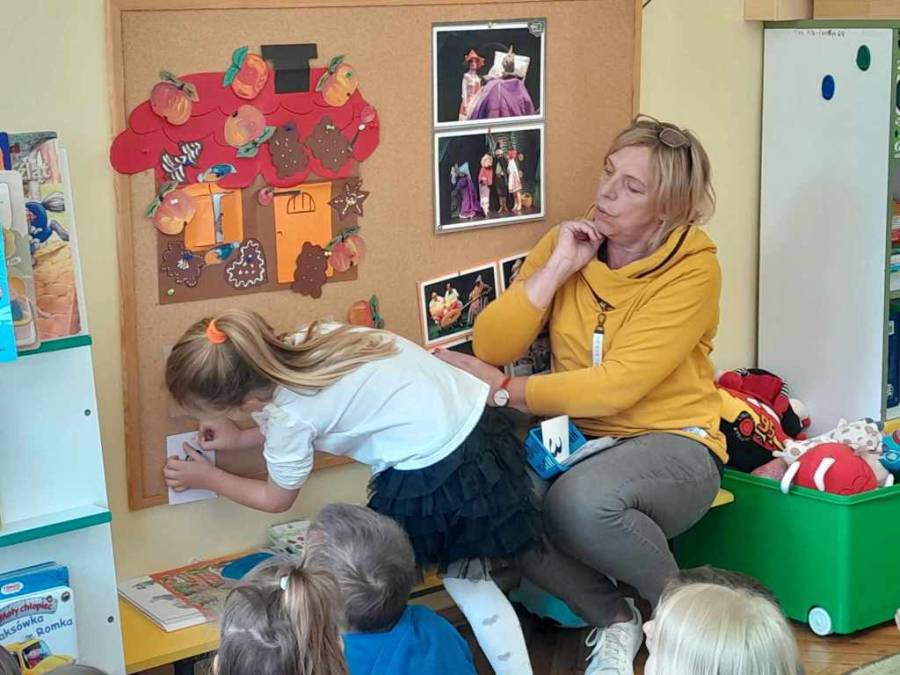 /Kraina bajek i baśni/ to temat, który dzieci bardzo lubią. Poszerzono go o zabawę dydaktyczną i twórczą. Znając dobrze treść bajki /Jaś i Małgosia/, dzieci odpowiadały na zadane pytania, wyszukiwały i przeliczały elementy znajdujące się na domku Baby Jagi. Chętnie zilustrowały bajkę, wykorzystując farby gwaszowe oraz sylwety postaci. Stoliki po pracy nie wyglądały najlepiej - jak to w pracowni plastycznej. Natomiast obrazy można podziwiać - są estetyczne, odznaczają się bogatą wyobraźnią i wrażliwością.