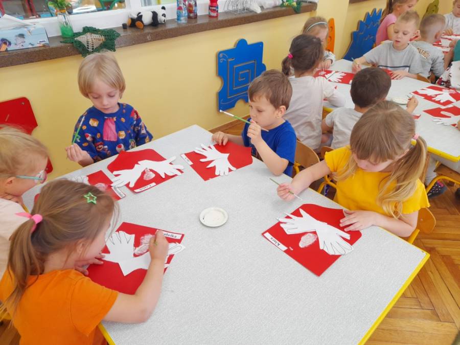 W związku z nadchodzącymi Świętami: 1, 2 i 3 Maja, dzieci zapoznały się z Symbolami Narodowymi. Wiedzą, jak wygląda polska flaga, godło i znają słowa Hymnu Narodowego. Wprowadzeniem do tematu był wiersz Czesława Janczarskiego /Barwy ojczyste/ oraz wiersze Władysława Bełzy: /Flaga/, /Godło/, /Hymn/. Po zapoznaniu z wyglądem godła, dzieci wykonały pracę techniczno-plastyczną.