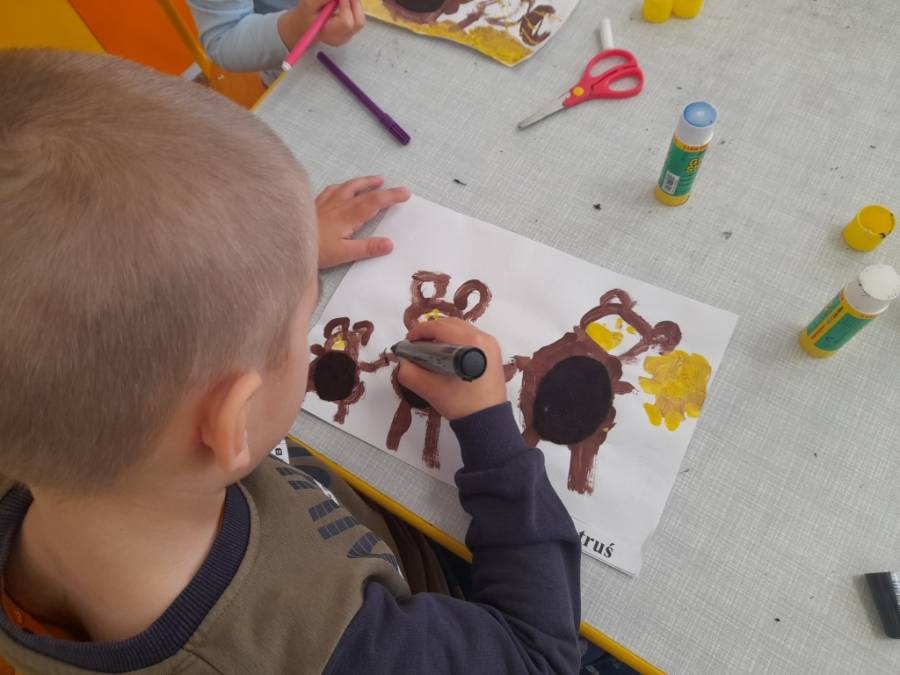 Na poprawę humoru jest zawsze dobra zabawa, kiedy za oknem szarość i słota. Dzieci w rytm deszczowej piosenki uderzały w kartki, imitując padający deszcz, tańczyły na wietrze i chodziły pod parasolami /kartkami/. Poznały nową technikę malarską, chętnie malując gąbką. Powstały ciekawe prace zatytułowane /Deszczowa pogoda/. Ćwiczyły też rączkę, kreśląc po śladzie. Był również czas na swobodną zabawę w kącikach zainteresowań.