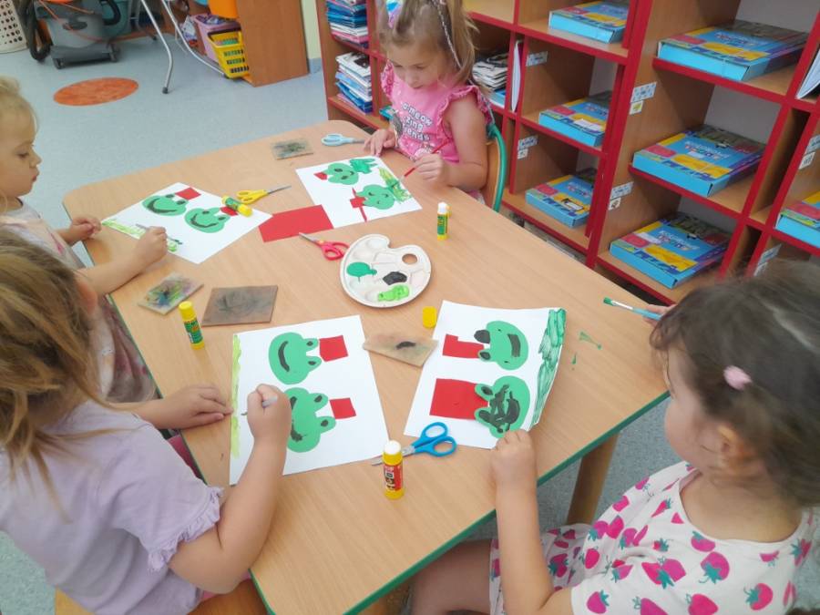 Dzieci poznały co to są barwy ochronne zwierząt. Chętnie wysłuchały opowiadania Heleny Bechlerowej / O żabkach w czerwonych czapkach/ . Z dużym zaangażowaniem przystąpiły do pracy plastyczno-technicznej.