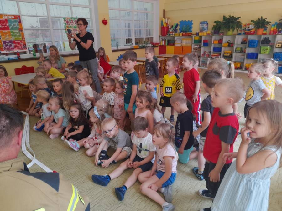 Dzięki uprzejmości Taty Filipka z grupy Żabek, który gościł w przedszkolu, dzieci miały okazję zapoznać się z pracą strażaka. Panowie pokazali dzieciom wyposażenie oraz urządzenia potrzebne przy gaszeniu pożaru. Utrwaliły również numery alarmowe. Dziękujemy za ciekawe spotkanie.