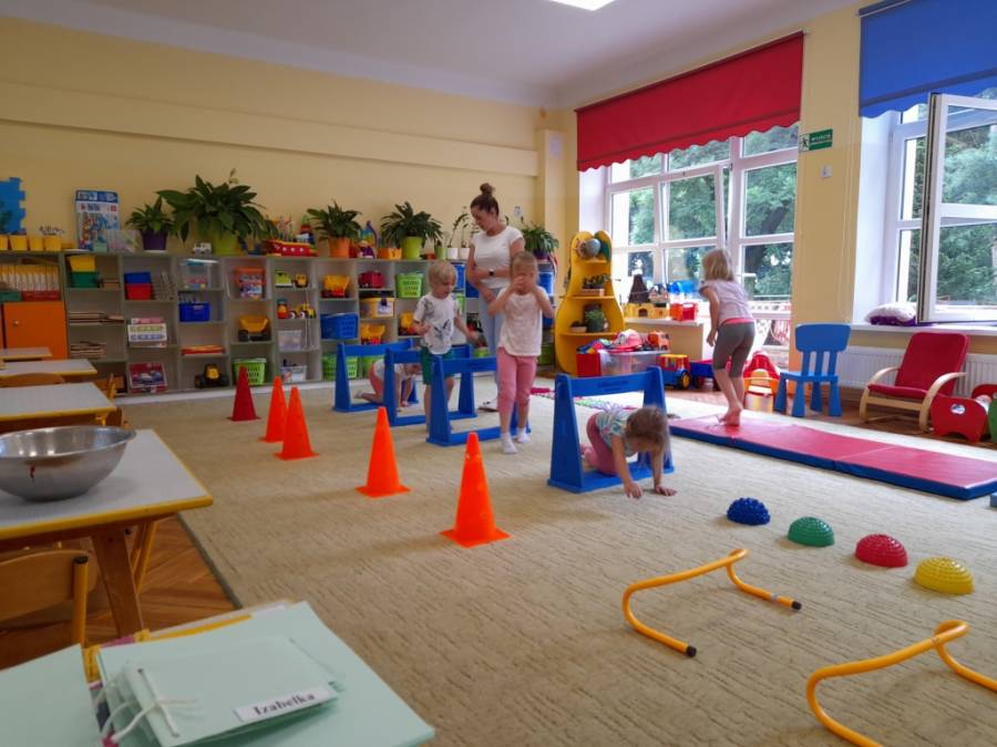 Tor przeszkód to to, co dzieci najbardziej lubią na zajęciach korekcyjnych pod czujnym okiem Pani Małgosi.