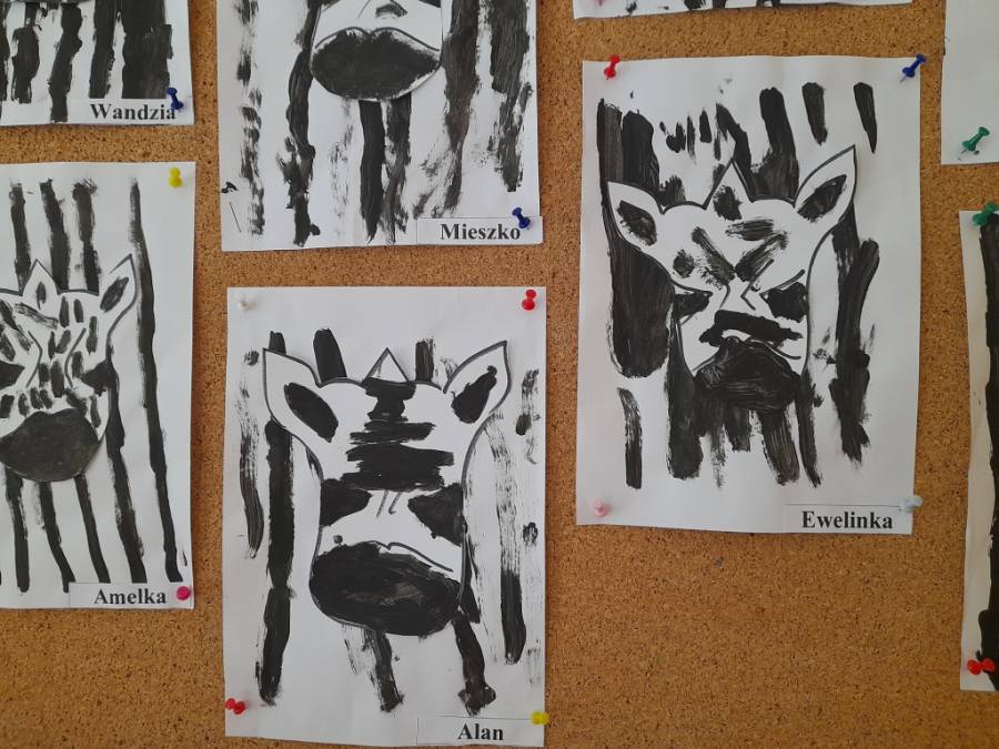 Głównym bohaterem dzisiejszych zajęć była zebra. Dzieci dowiedziały się o jej życiu i cechach charakterystycznych. Poznały też inne zwierzęta egzotyczne zamieszkujące Afrykę. Powstały ciekawe prace, a ćwicząc rękę wykonały zadanie grafomotoryczne związane z tematem.