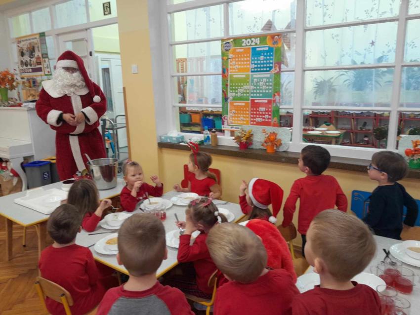 Od samego rana w przedszkolu rozbrzmiewały kolędy. Dzieci odświętnie ubrane oczekiwały na przedszkolną wigilię. Wcześniej jednak uczestniczyły w ciekawym przedstawieniu świątecznym przygotowanym przez gr. V oraz w rozstrzygnięciu konkursu /słodkie ozdoby choinkowe/. Dużą niespodziankę sprawiła nam wizyta Pani Moniki, z którą śpiewaliśmy kolędy, dzielili opłatkiem i zasiedli do wspólnego stołu, na którym królował barszczyk, rybka oraz kompot z suszu. Atmosfera była bardzo przyjemna.