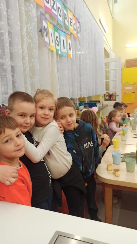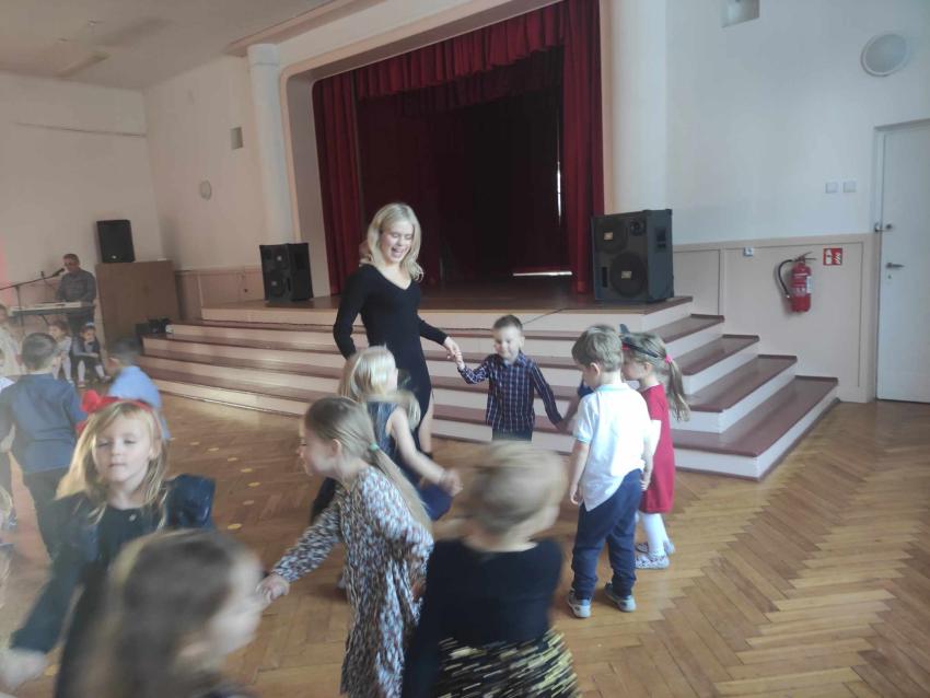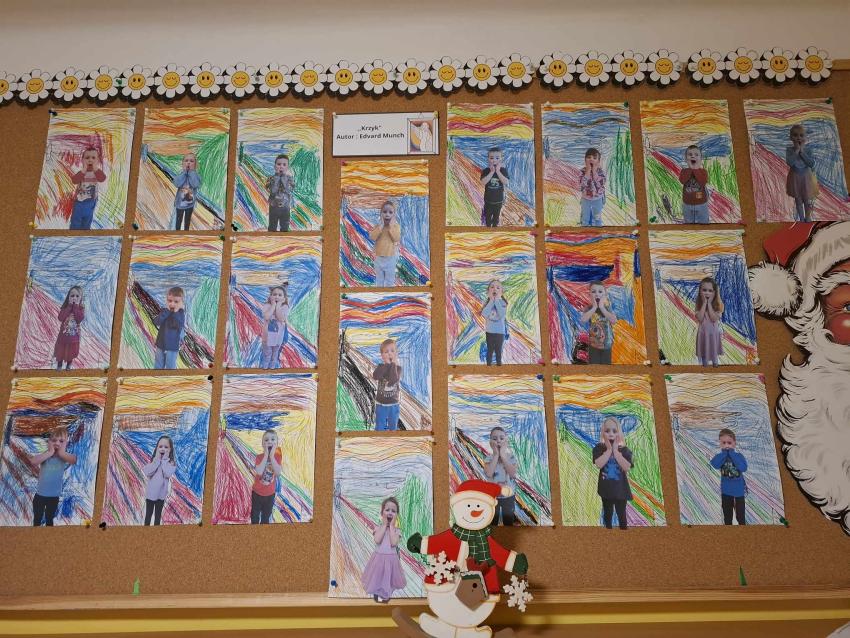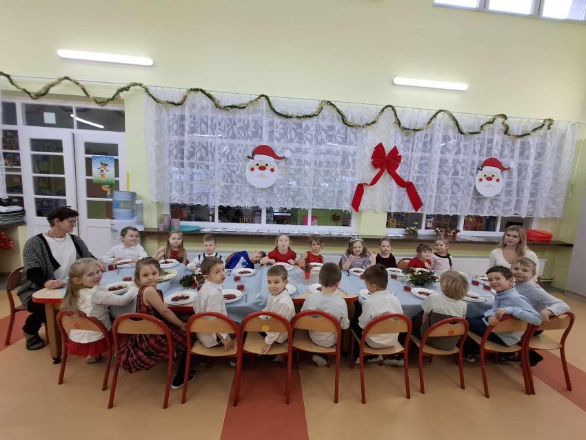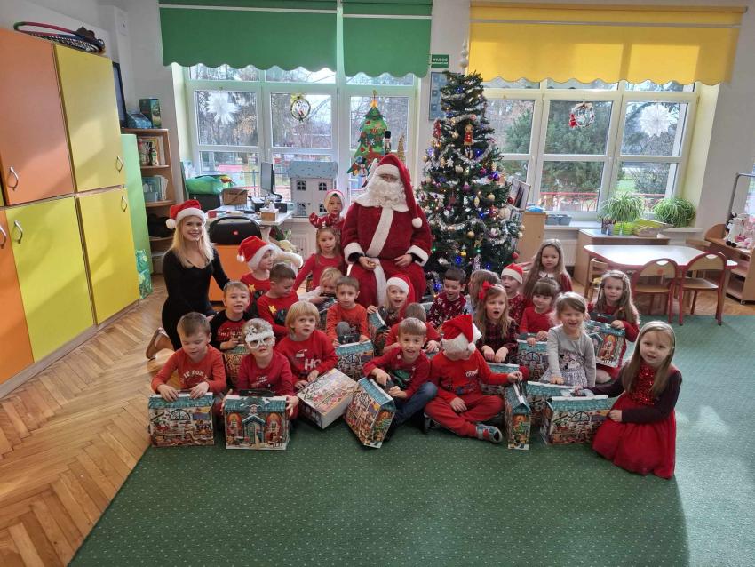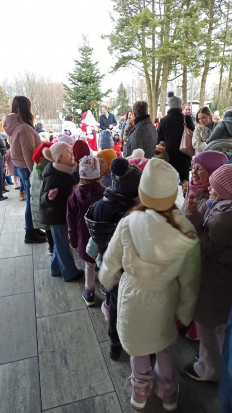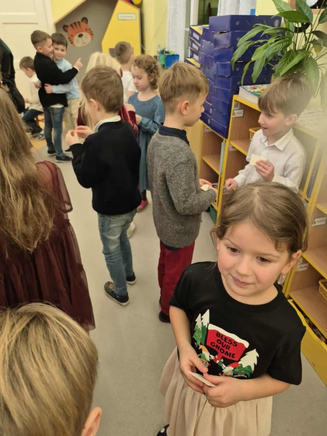 Następnie, ku naszej radości, zawitał do nas sam Święty Mikołaj! Na sali czekały na dzieci prezenty, a każdy miał okazję zrobić sobie zdjęcie z wyjątkowym gościem. Nie zabrakło także muzyki- zaśpiewaliśmy Mikołajowi piosenkę, czym wywołaliśmy na jego twarzy szeroki uśmiech.