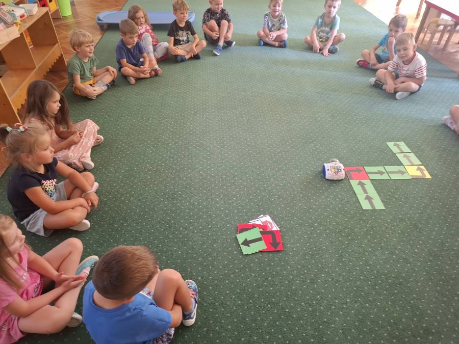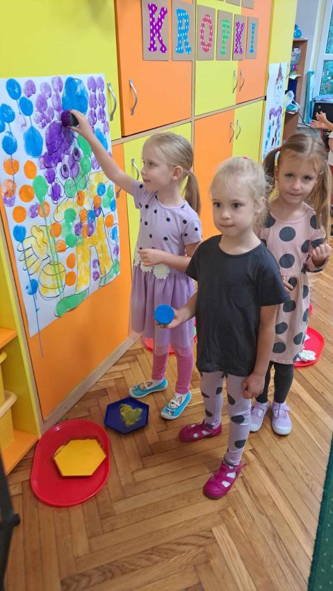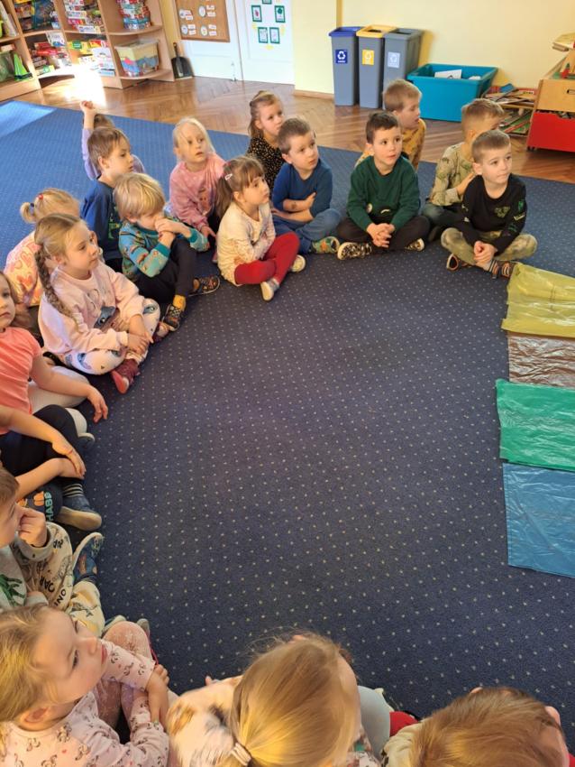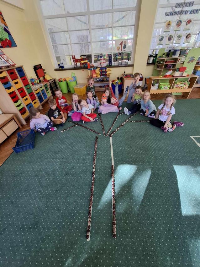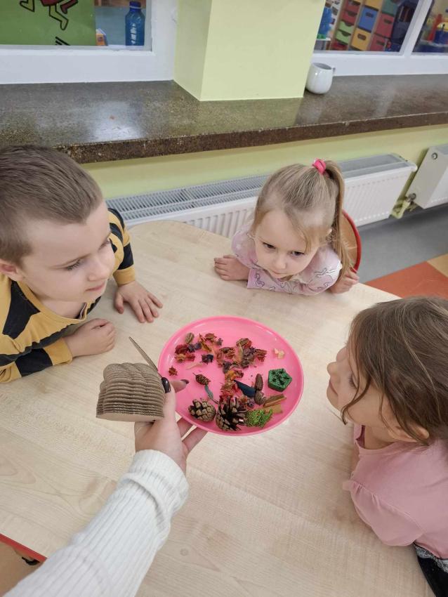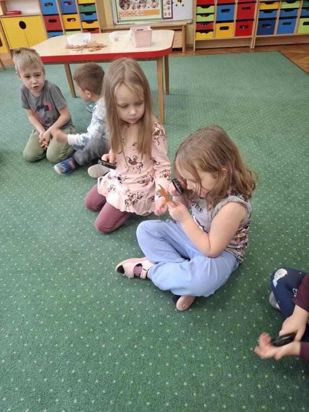 Pajacyki biorą udział w projekcie Mali Wielcy Odkrywcy w związku z tym przeprowadziły pierwsze doświadczenie z kolorowymi liśćmi " W jaki sposób oddychają drzewa" . Dzieci do przygotowanego pojemnika z wodą włożyły listek, przygniotły listek klockiem i postawiły pojemnik w nasłonecznionym miejscu. Po kilku minutach pojawiły się efekty ( bąbelki na liściu). Doświadczenia to świetna zabawa, która pozwala obserwować, wyciągać wnioski, analizować. Poznały również trudne słowa fotosynteza oraz chlorofil, a także dowiedziały się dlaczego liście zmieniają kolor jesienią. Dzieci wzięły udział w spacerze badawczym ,,polowanie na drzewa'', podczas którego poszukiwały drzew oraz obserwowały i porównywały kolory liści różnych drzew.