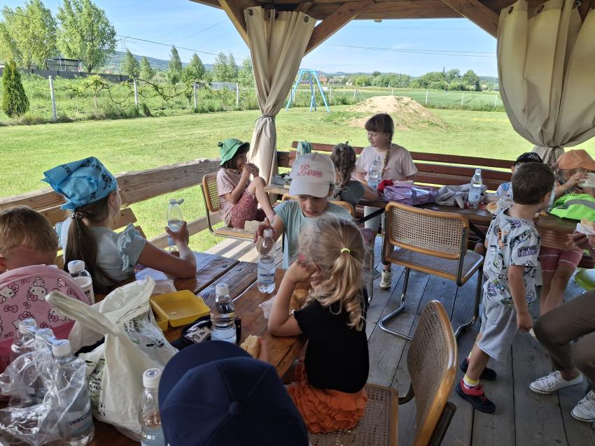 Mimo deszczu i niesprzyjającej pogody udało nam się wybrać do Wierzchosławic, aby w towarzystwie leśnika, Pana Karola Blicharza, przemierzyć ścieżkę edukacyjną i dowiedzieć się jakie zwierzęta i rośliny można napotkać spacerując po lesie. Rozmawialiśmy także o roli drzew i konieczności ochrony przyrody. Przejście całej ścieżki zajęło nam 1,5 godziny, a po tak intensywnym spacerze przyszedł czas na długo wyczekiwany piknik pod wiatą na polanie! Uśmiechnięci, zadowoleni i dotlenieni wróciliśmy bezpiecznie do przedszkola, gdzie zorganizowaliśmy sobie kolejny piknik!