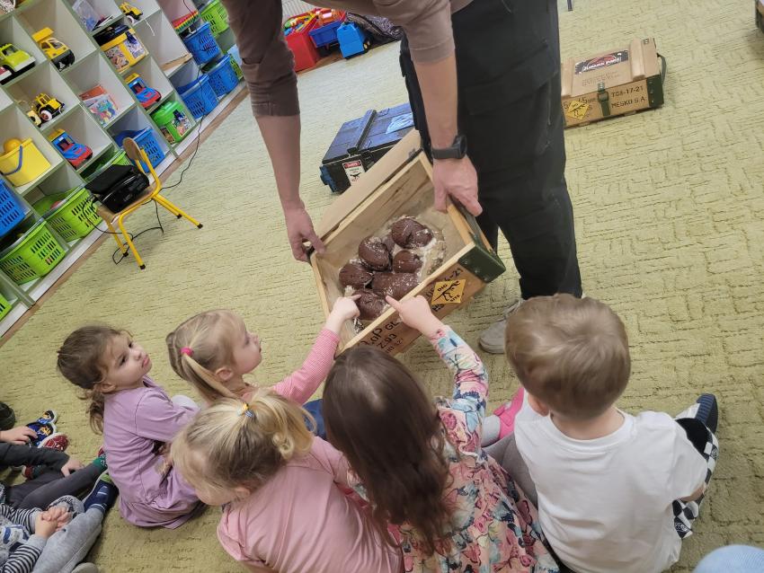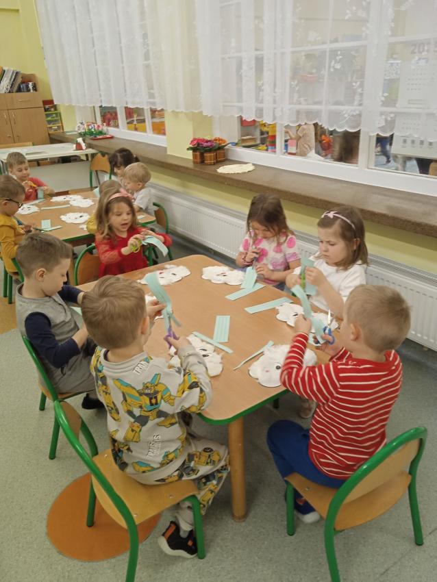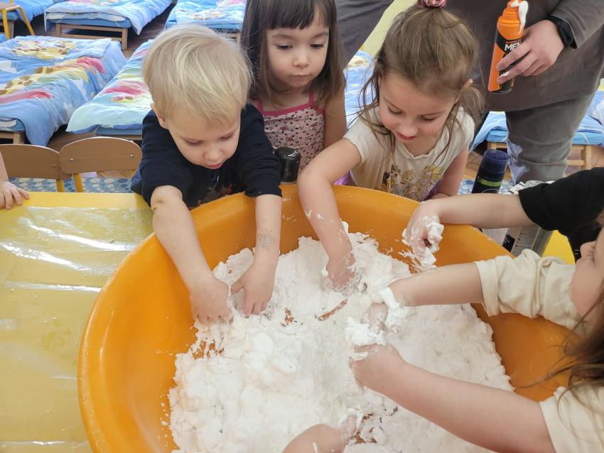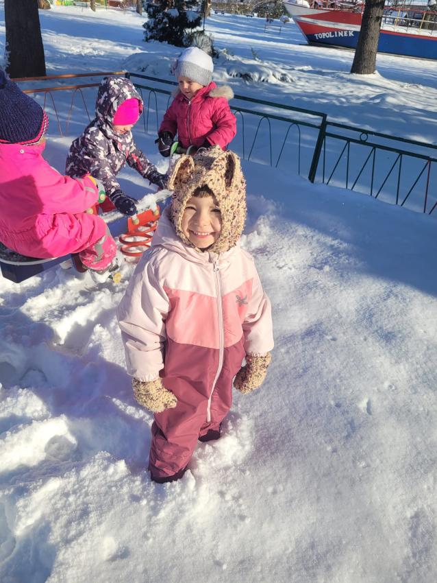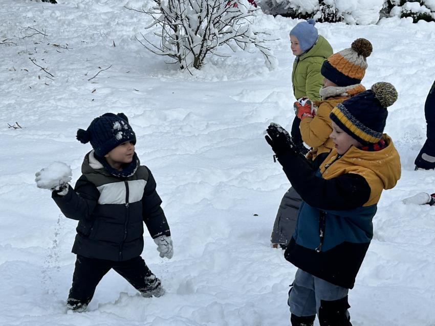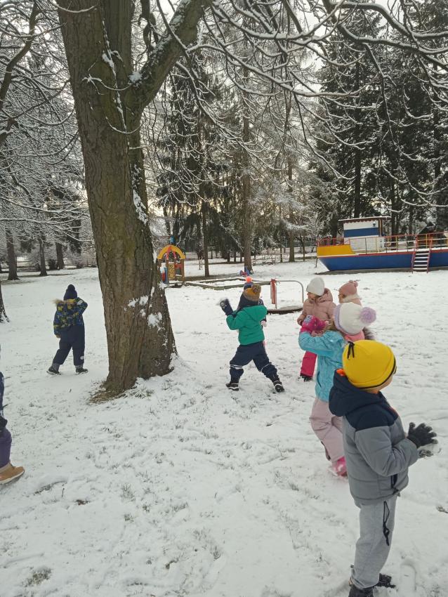Przedszkolaki z radością biegają po śniegu, lepią bałwana i rzucają się śnieżkami, tworząc wesołą zimową zabawę. Z entuzjazmem robią aniołki na śniegu i z dumą prezentują swoje zimowe dzieła ? śnieżne kule, bałwanki i małe budowle, ciesząc się każdą chwilą spędzoną na świeżym powietrzu.