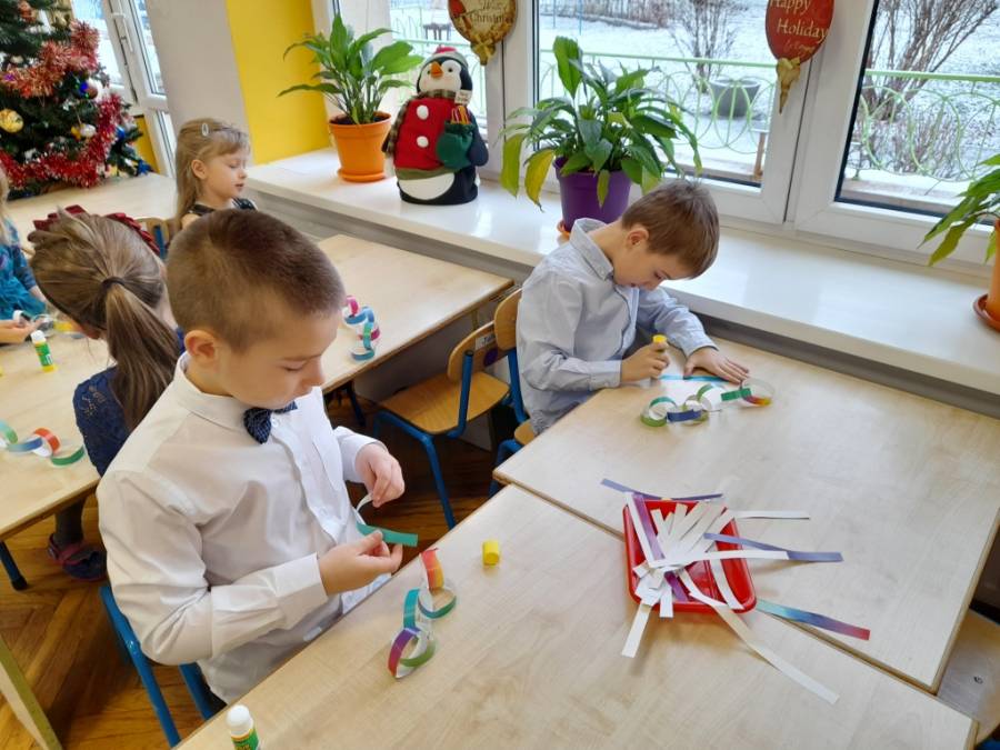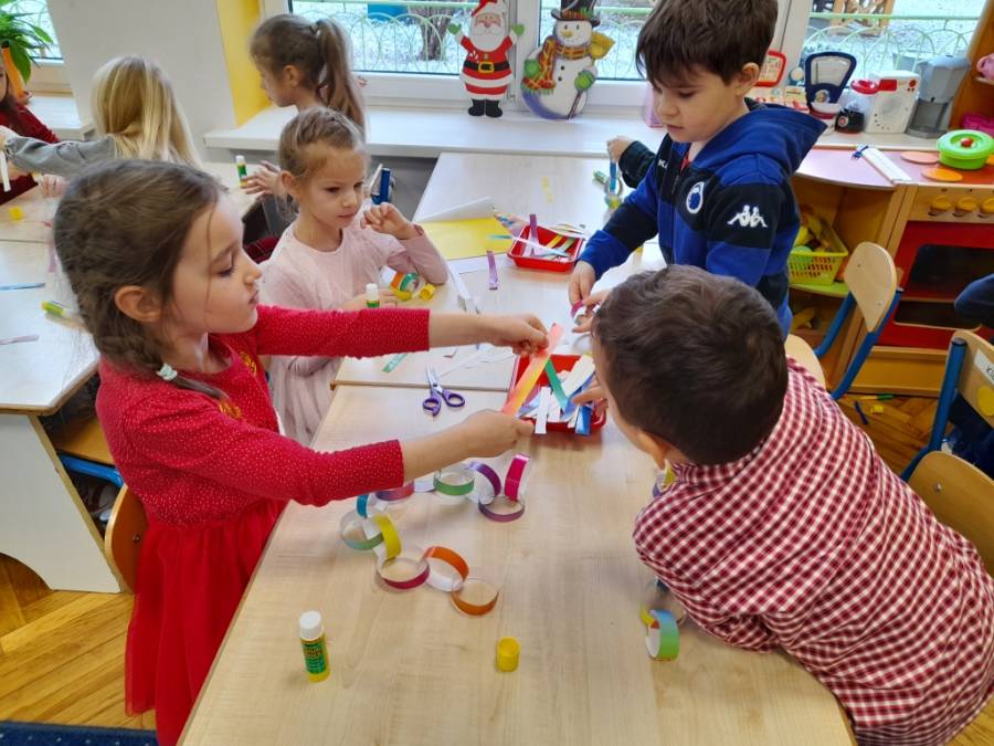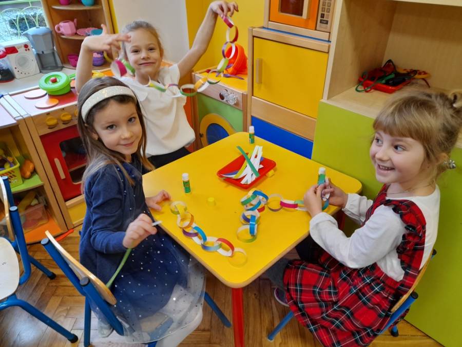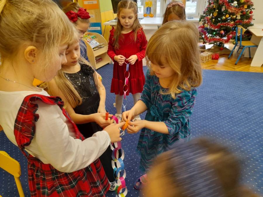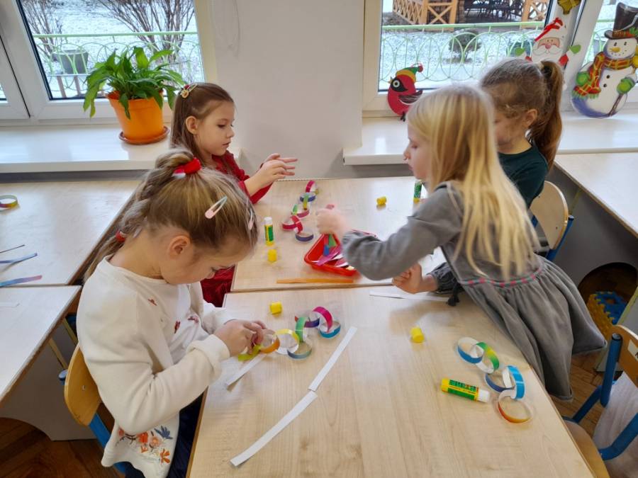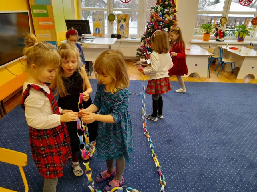 Przy dźwiękach kolęd tworzenie kolorowych łańcuchów. Okazjonalne porównywanie, który większy, który mniejszy. Ozdabianie nim choinki.