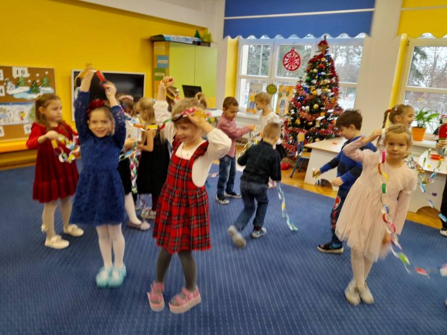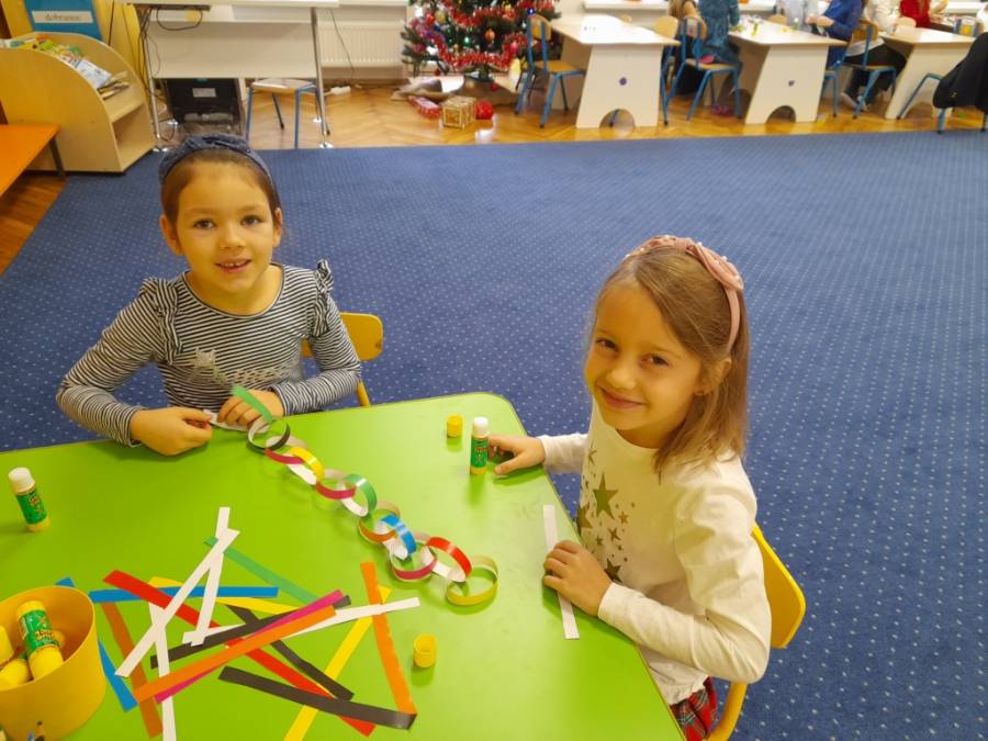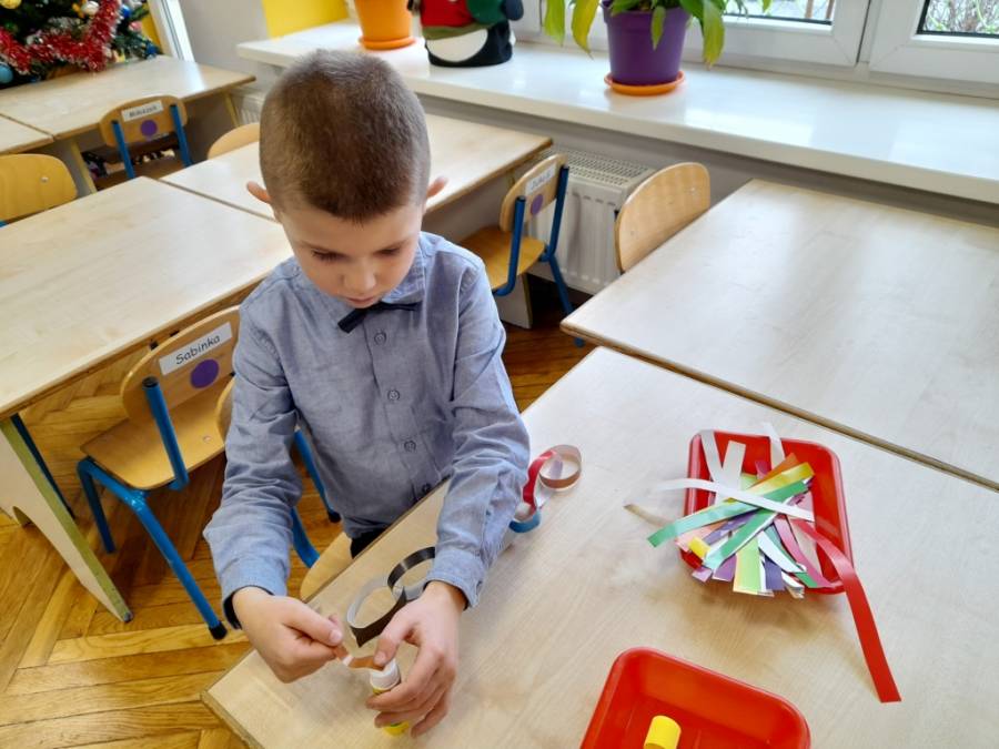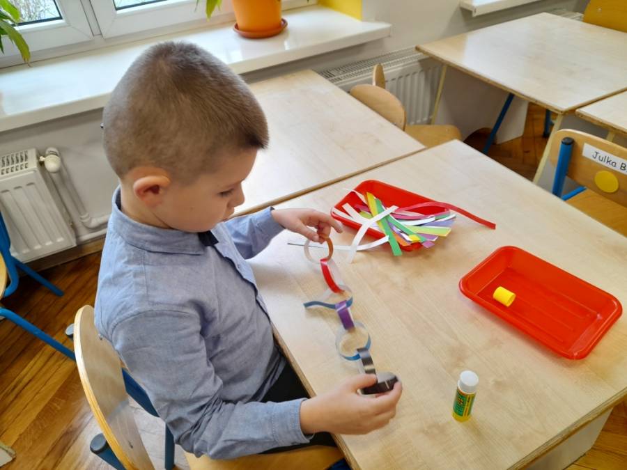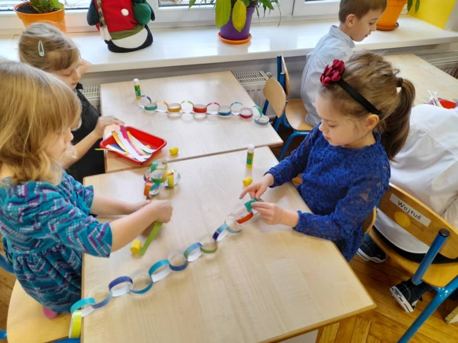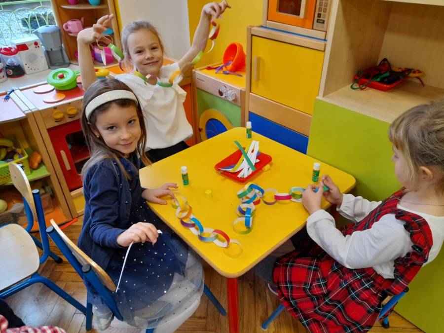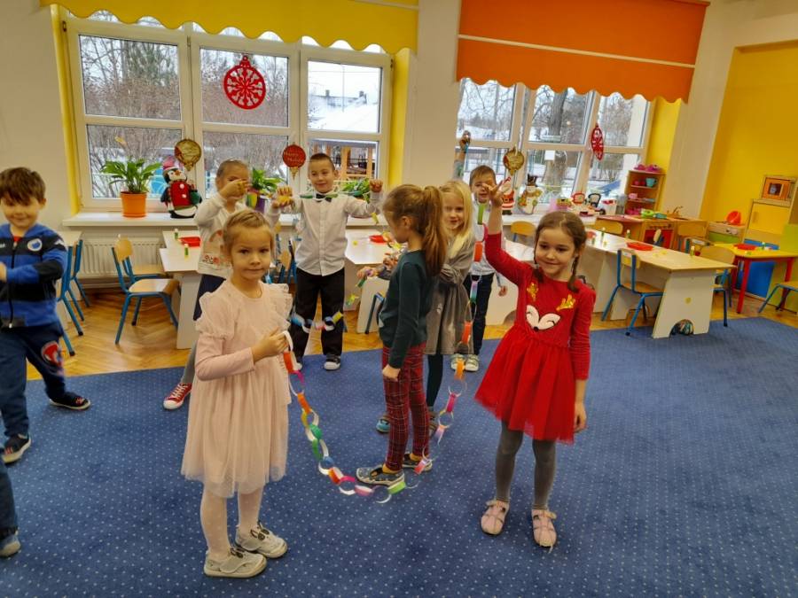 Przy dźwiękach kolęd tworzenie kolorowych łańcuchów. Okazjonalne porównywanie, który większy, który mniejszy. Ozdabianie nim choinki.