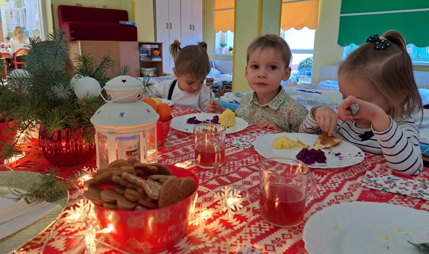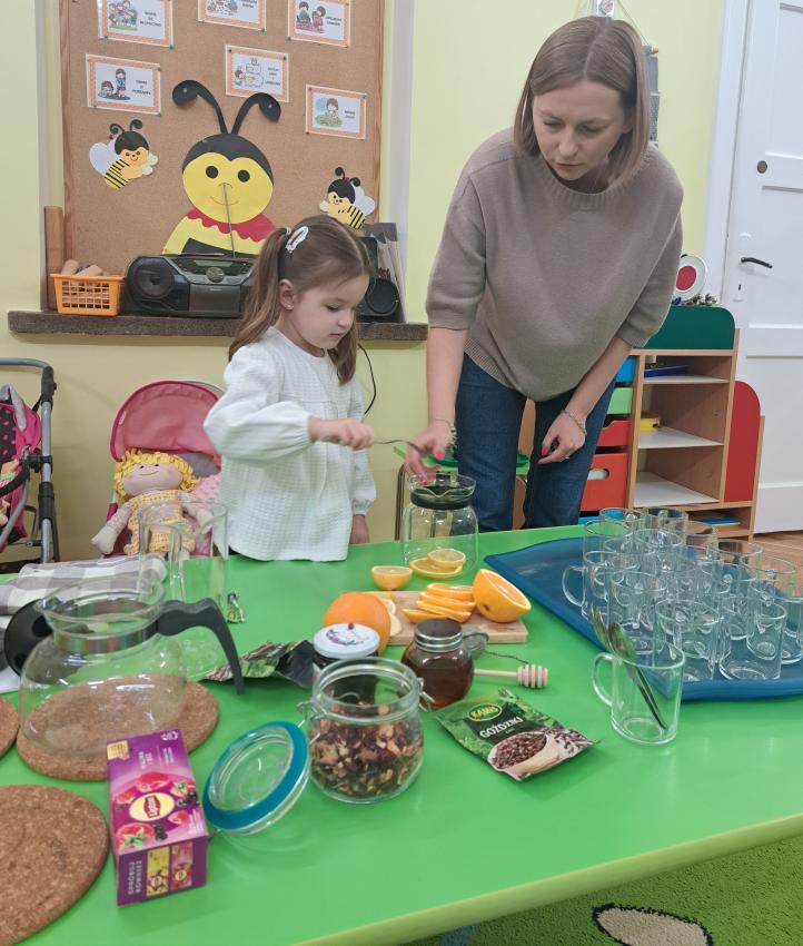 Pracowite Pszczółki tym razem przyrządziły zimową herbatkę. Dzieci orientowały się, co dodaje smaku i aromatu takim pysznym napojom i samodzielnie dodawały niektóre dodatki  do herbatki: pomarańcze, cytrynę, , goździki, sok malinowy i miód,  miały możliwość powąchać zapachy przypraw. Podczas zajęć zwrócono uwagę w jaki sposób bezpiecznie korzystać z czajnika. Wyjaśniono ,że dzieci nie mogą samodzielnie korzystać z urządzeń elektrycznych bez obecności dorosłego.