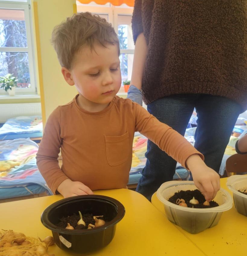 Świat dookoła robi się coraz bardziej zielony -  w końcu nadeszła wiosna. Pracowite Pszczołki  również chciały, aby ich sala zazieleniła się, więc postanowiły założyć wiosenny kącik. Dzieci samodzielnie napełniały  doniczki  ziemią, po czym przystąpiły do  sadzenia wiosennych kwiatów m.in. tulipanów, hiacyntów,  bratków oraz posadziły cebulki na szczypiorek, zasiały koperek i pietruszkę. Dzieci wysłuchały także kolejnego  opowiadania o Kici Koci pt. Wiosna.