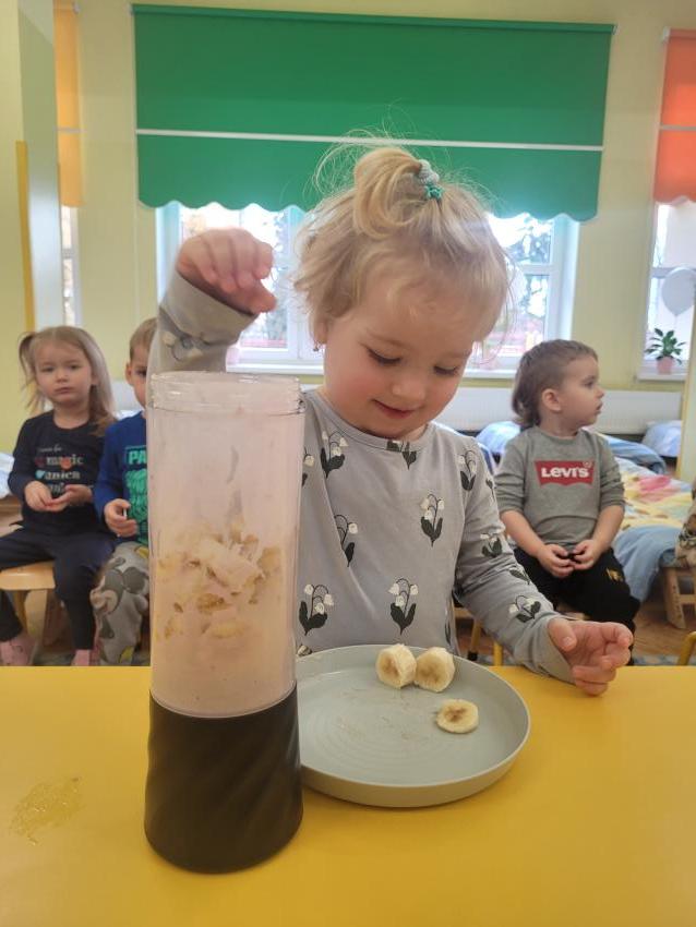 Dzieci  z myślą o witaminkach i zdrowym odżywianiu przygotowały koktajl owocowy z bananów i jogurtu owocowego. Przed przystąpieniem do pracy przedszkolaki umyły rączki  i zapoznały się z urządzeniem do robienia koktajlu. Gotowe do pracy zaczęły kroić owoce i wrzucać do blendera. Celem zajęć było zachęcenie dzieci do spożywania owoców i zapoznanie dzieci z możliwością spożywania owoców w innej postaci. Na koniec wszystkich czekała degustacja. Okazało się, że dzieci chętnie smakowały i prosiły o kolejną porcję koktajlu.