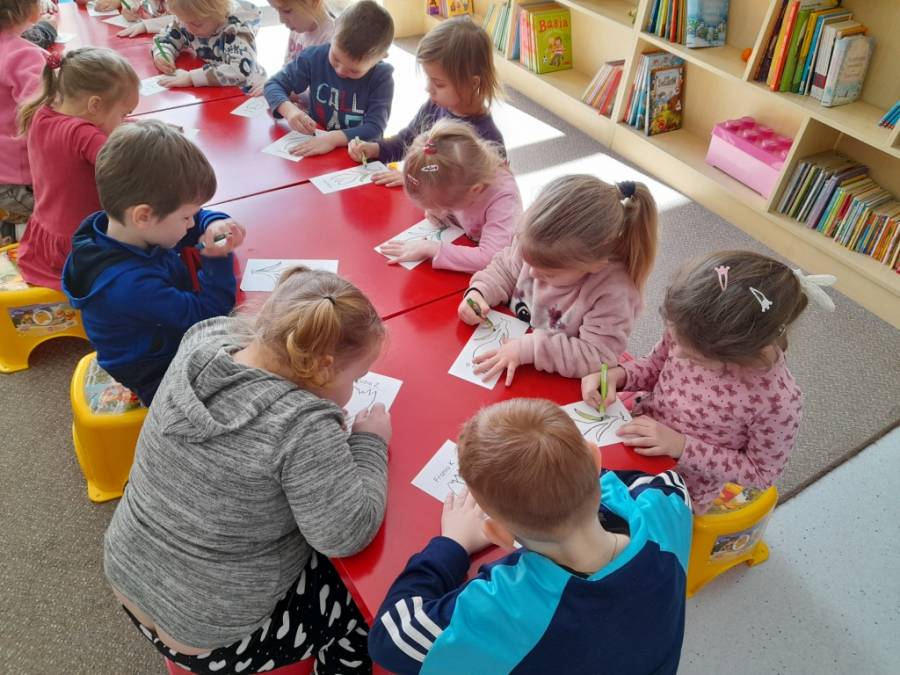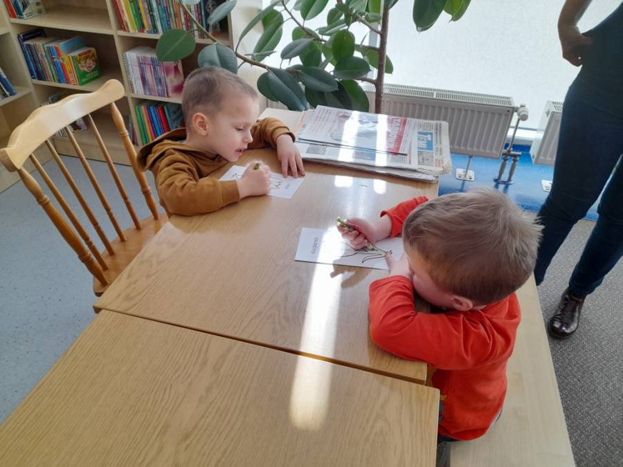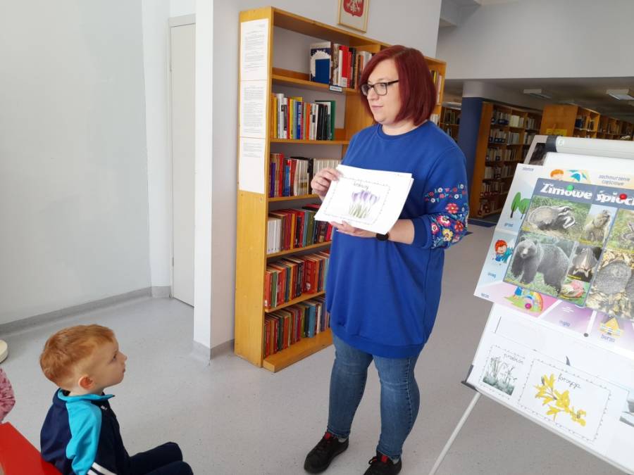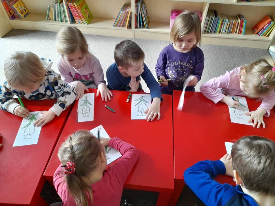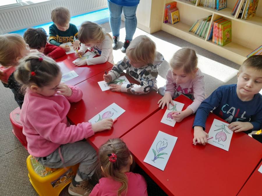 Dzisiejsze spotkanie poświęcone było wiośnie. Pani Agnieszka utrwaliła z dziećmi wiadomości dotyczące charakterystycznych cech wiosny, przylotu ptaków, budzenia się zwierząt oraz pierwszych kwiatów. Na zakończenie dzieci kolorowały krokusy. Pożyczyliśmy również książeczki, zachęcając dzieci do korzystania z biblioteki.