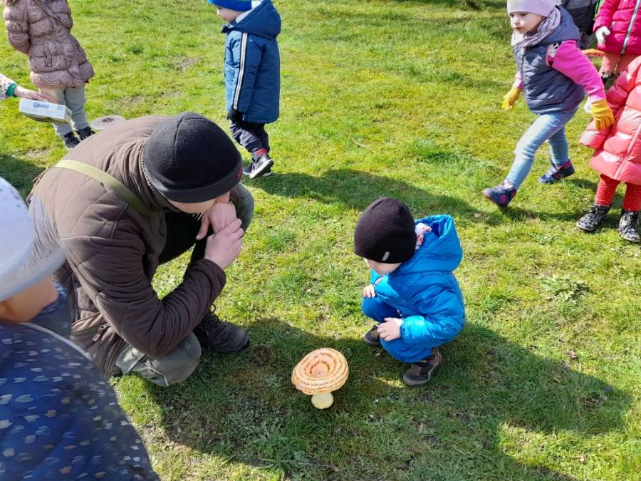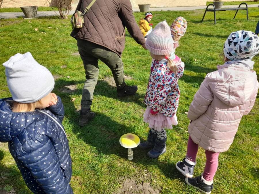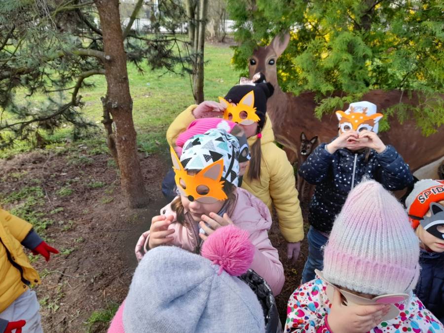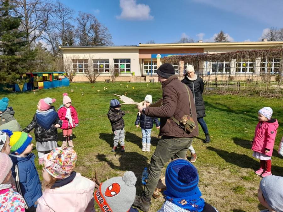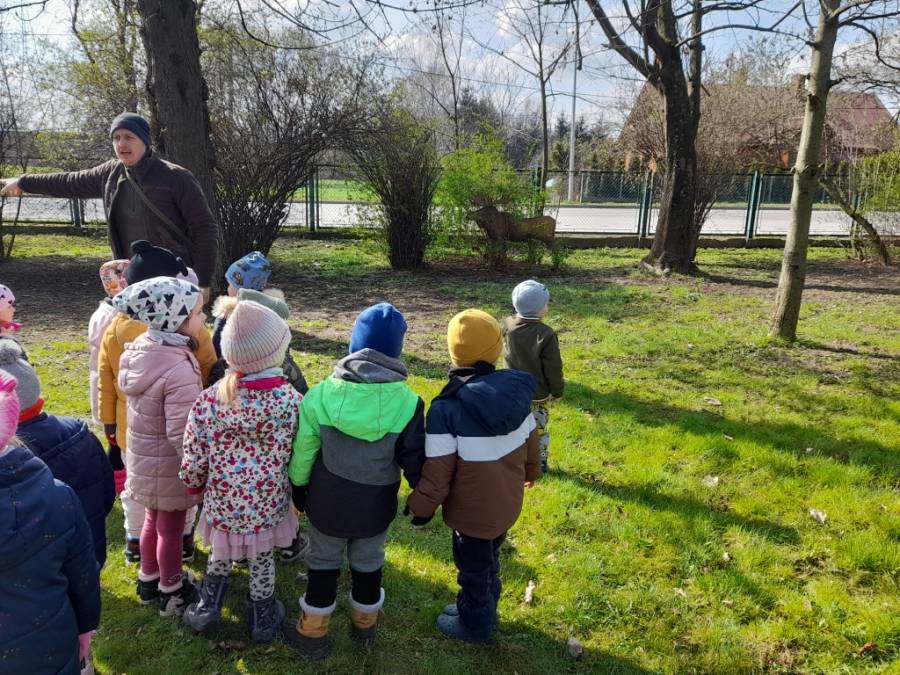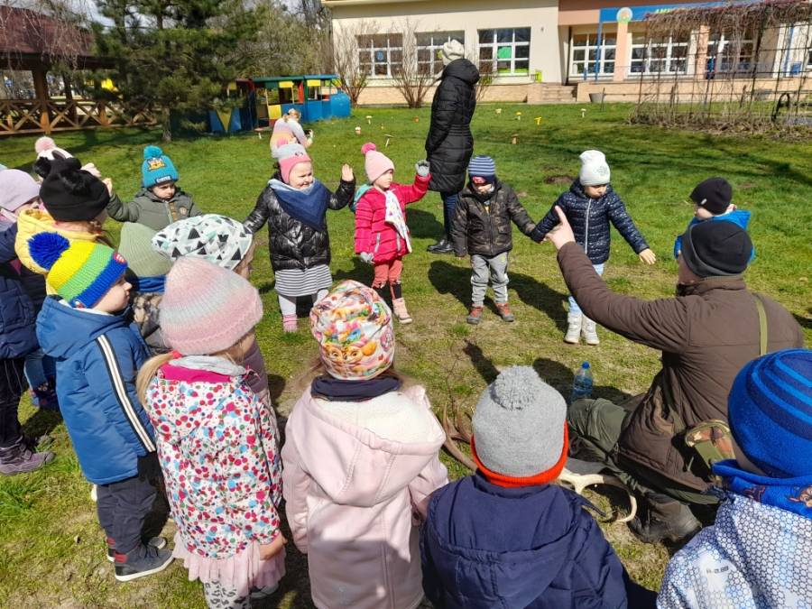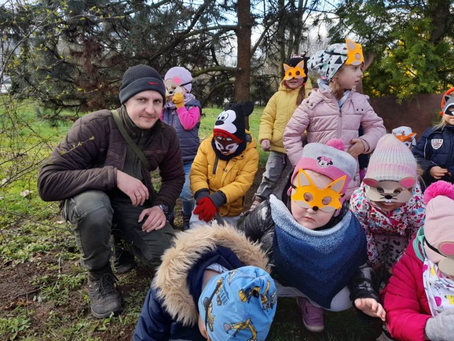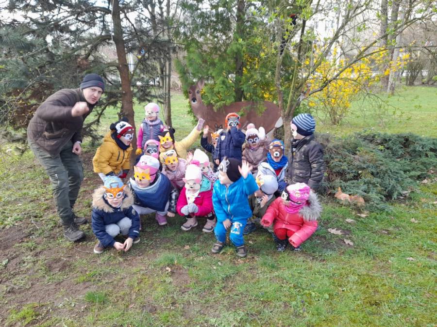 Dzisiejsze warsztaty to ciekawe wydarzenie. Odbyły się one w ogrodzie przedszkolnym imitującym las, gdzie ukryte były  zwierzęta leśne, a także grzyby /jadalne i niejadalne/.  Pan leśnik opowiadał o życiu zwierząt, ich warunkach bytowych i zwyczajach. Piękne sylwety zwierząt pobudziły wyobraźnię dzieci. Wysłuchały wielu ciekawostek o faunie i florze. Posadziły drzewko, nadając jodle imię Wioletta, którą obiecały doglądać i podlewać. Dziękujemy Panu leśnikowi za ciekawą lekcję przyrody.