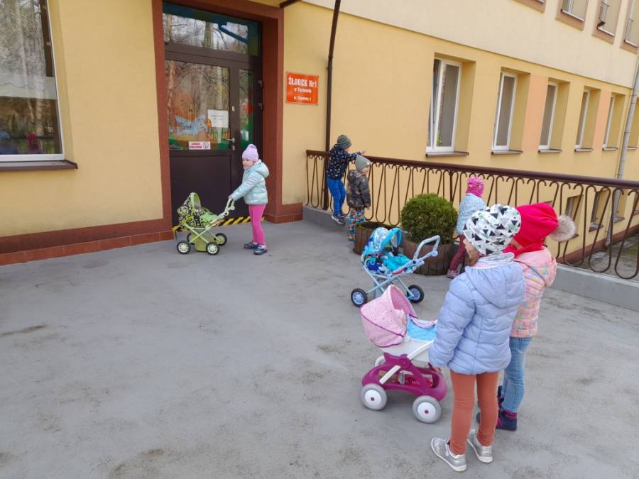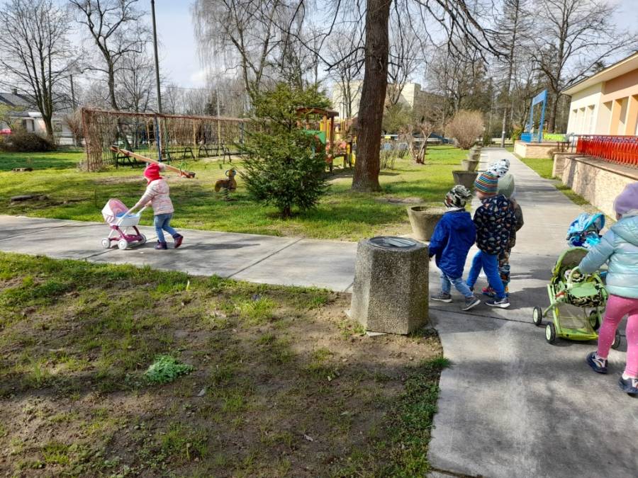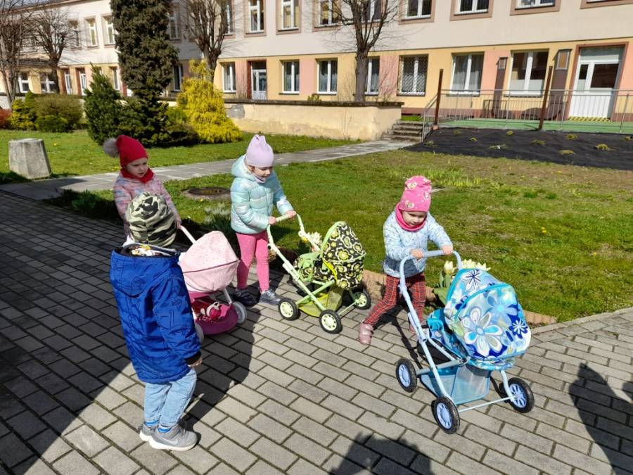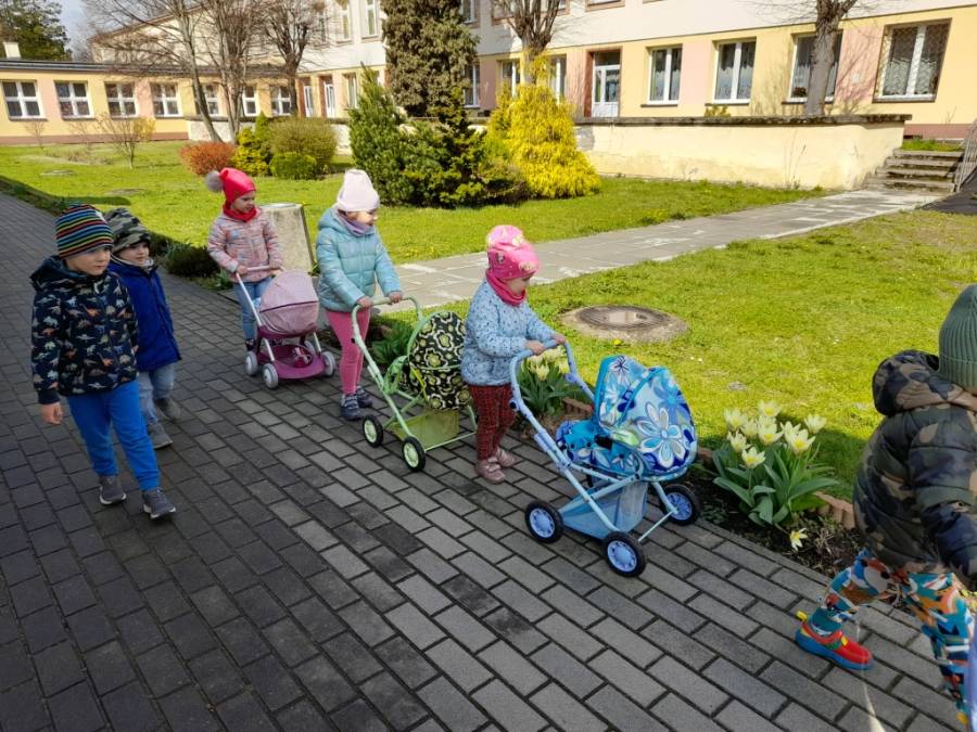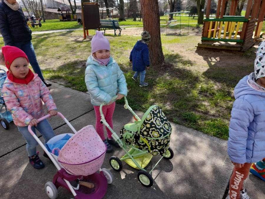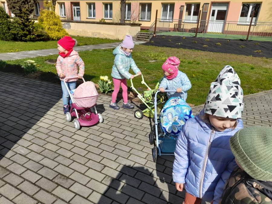 Dziś na spacer dzieci zabrały lalki, którymi troskliwie się opiekowały.