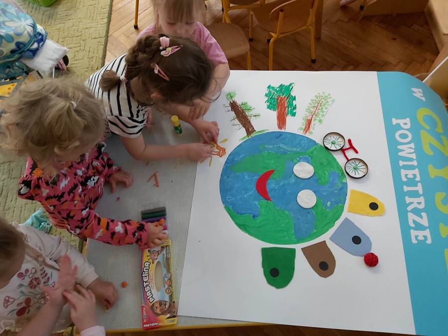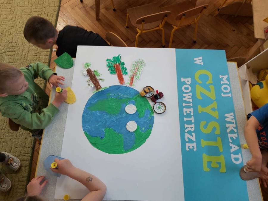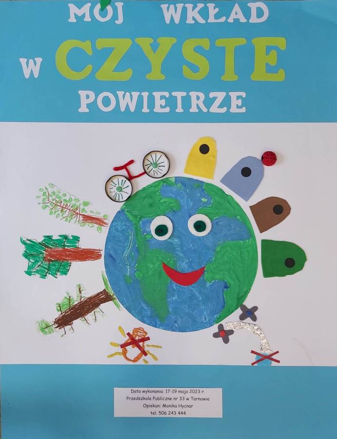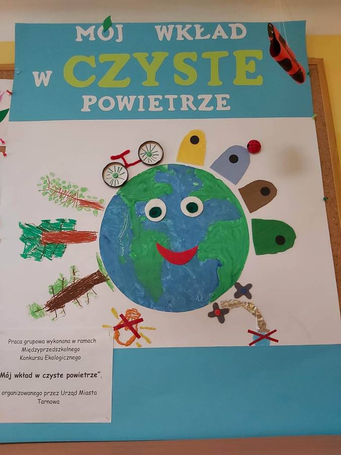 Chcąc rozbudzać u dzieci postawę poszanowania i ochrony przyrody, często sięgamy po treści związane z tematem ekologii. Tym razem grupa Misiów wykonała pracę plastyczną - konkursową pt. / Mój wkład w czyste powietrze/. Zadanie polegało na pokazaniu w jaki sposób dzieci mogą dbać o zmniejszenie zanieczyszczenia powietrza, a tym samym ochronę klimatu. Przedsięwzięcie organizowane jest przez Urząd Miasta Tarnowa w ramach Programu Regionalnego Wsparcia Edukacji Ekologicznej pt. /Razem stwórzmy lepszy klimat! - działania edukacyjne w zakresie przeciwdziałania emisjom/, dofinansowanego ze środków Wojewódzkiego Funduszu Ochrony Środowiska i Gospodarki Wodnej w Krakowie.
