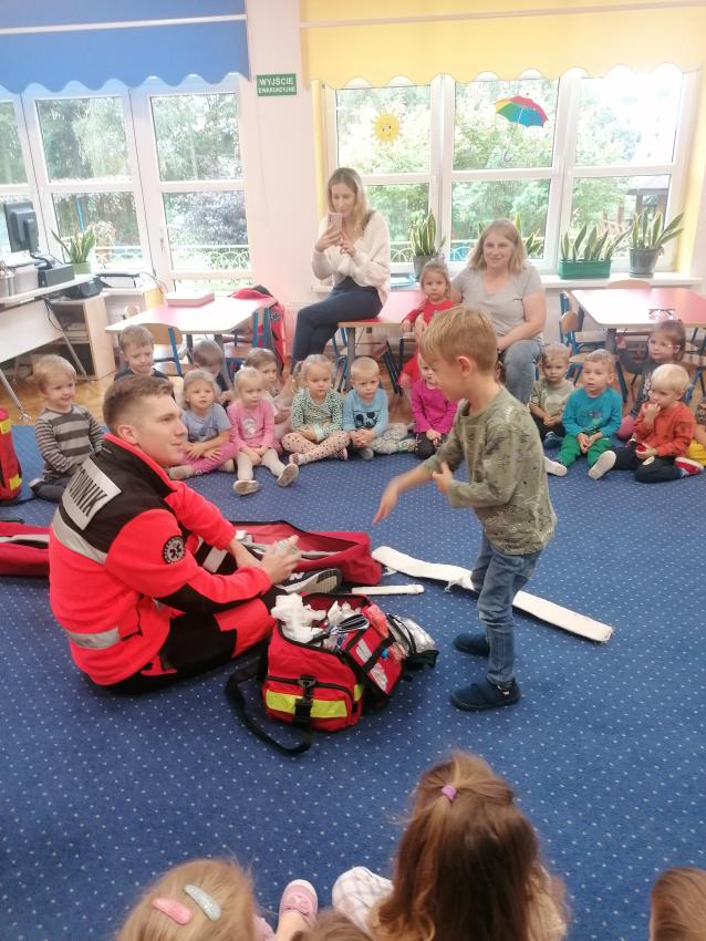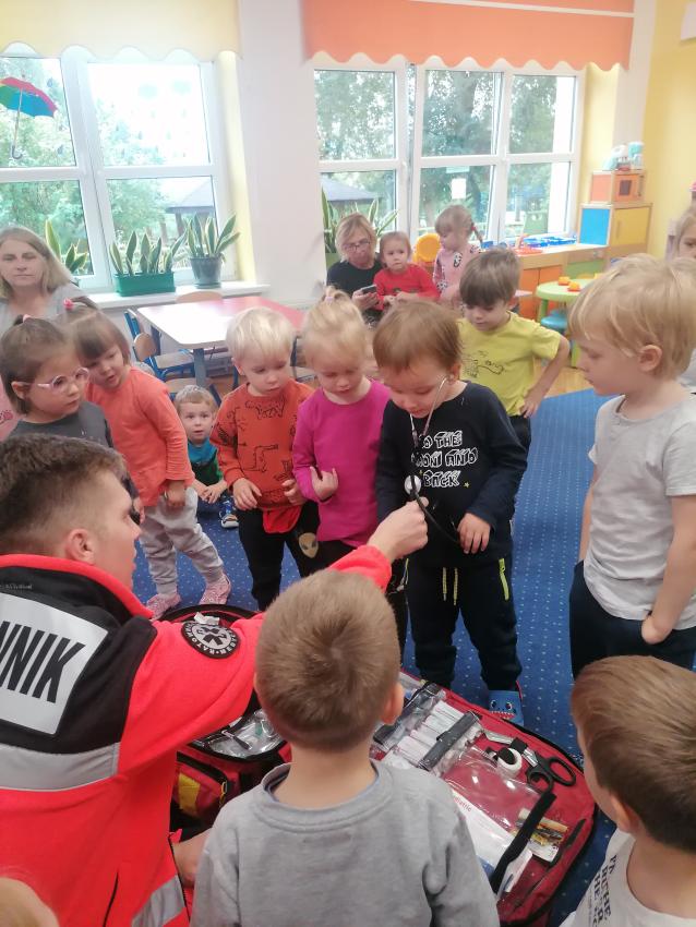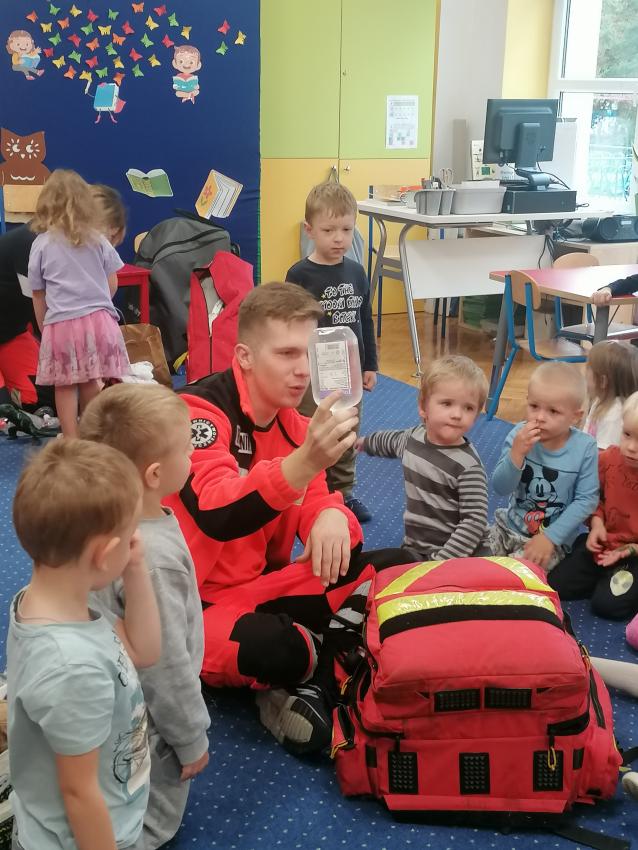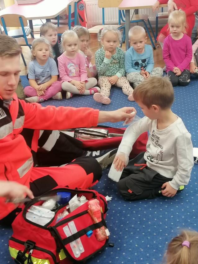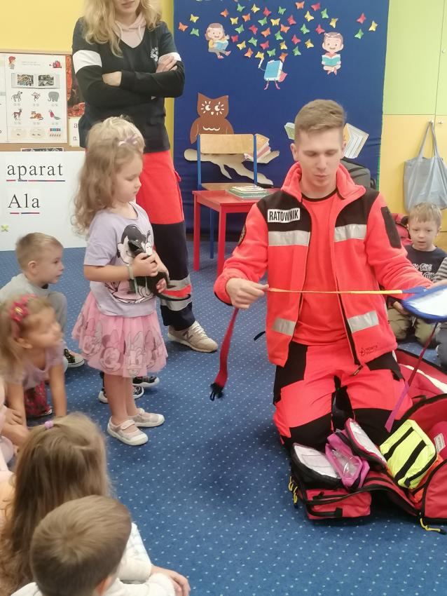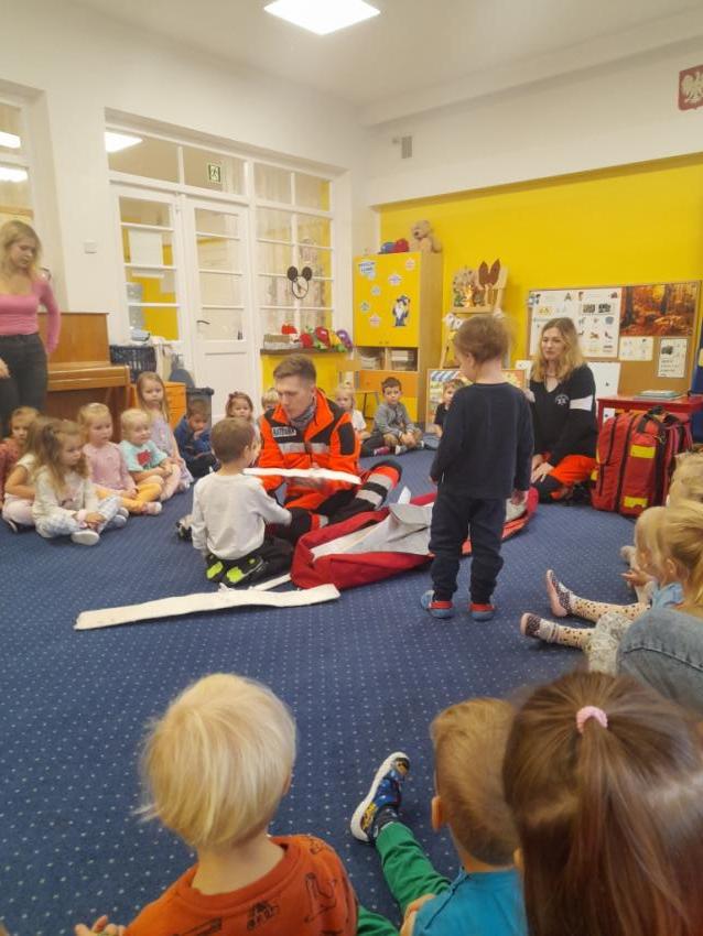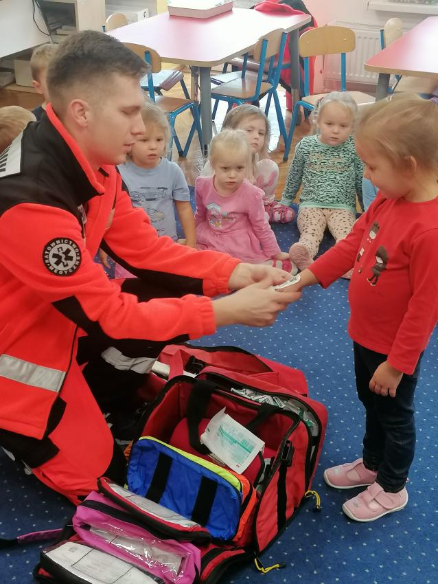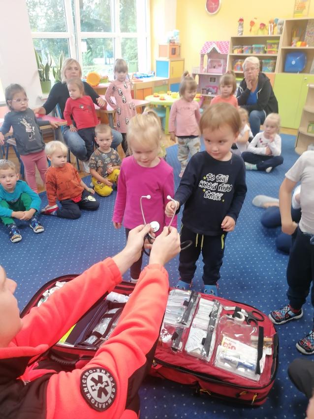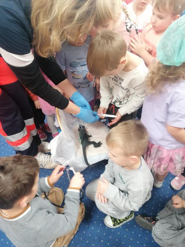 Gośćmi dzisiejszego spotkania z książką byli przedstawiciele pracowników służby zdrowia. Dzieci wysłuchały opowiadania o chorym Mietku. Poznały zawód pielęgniarki i ratownika medycznego. Bardzo dziękujemy za miłe spotkanie !