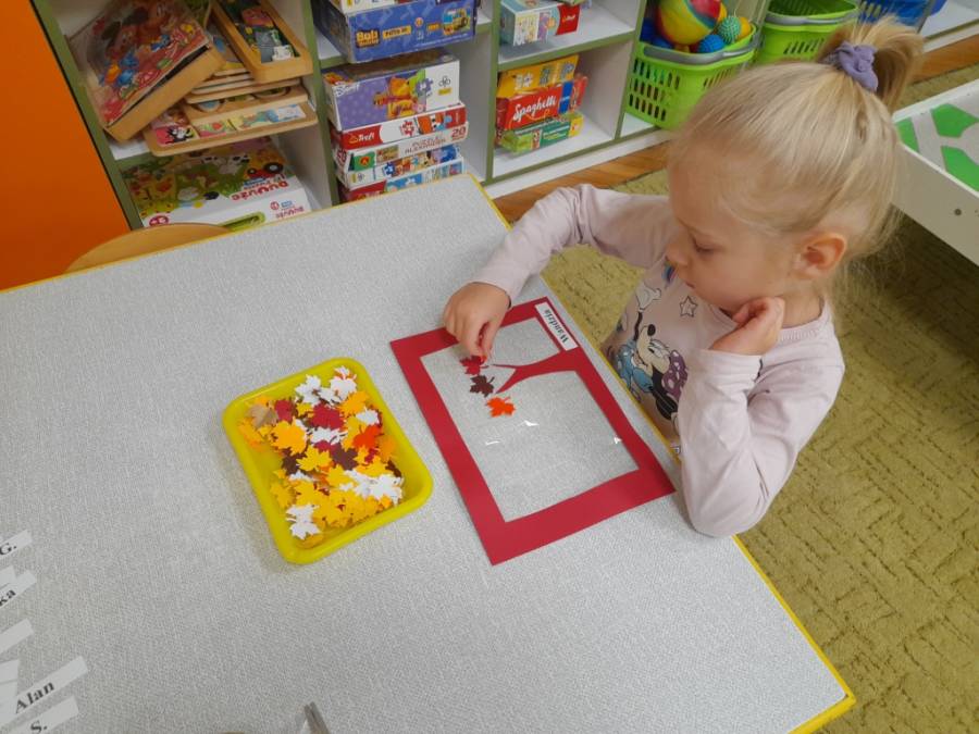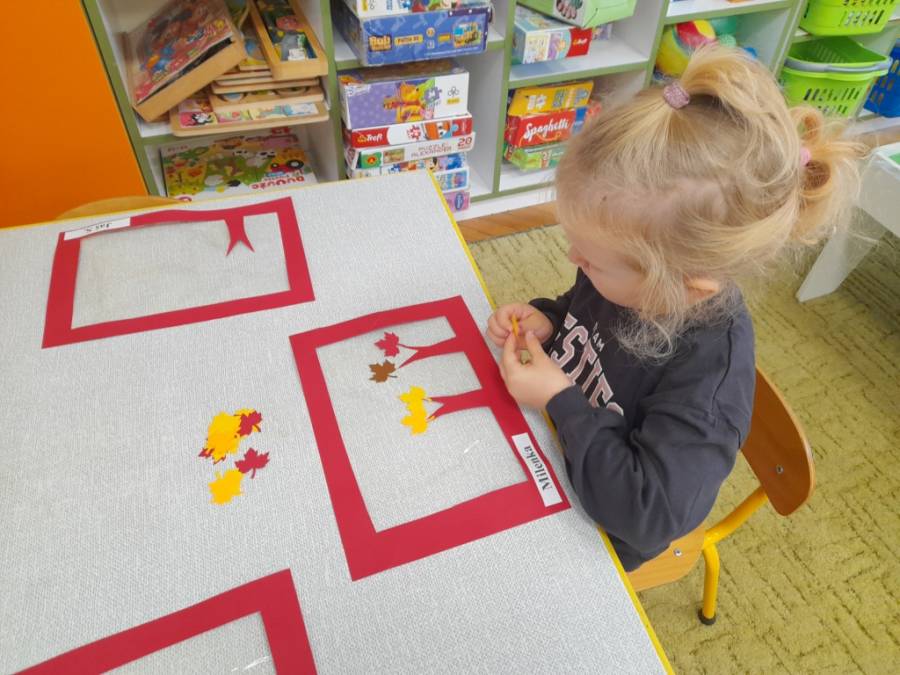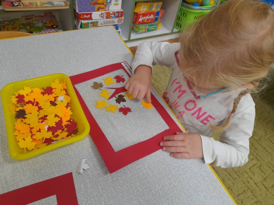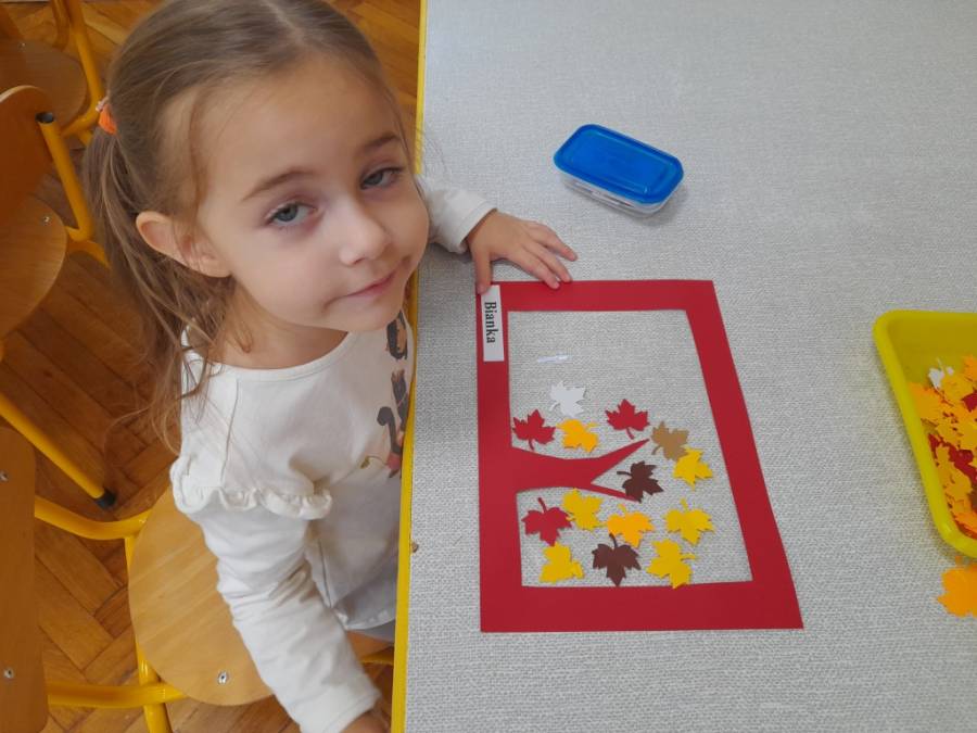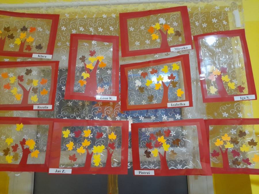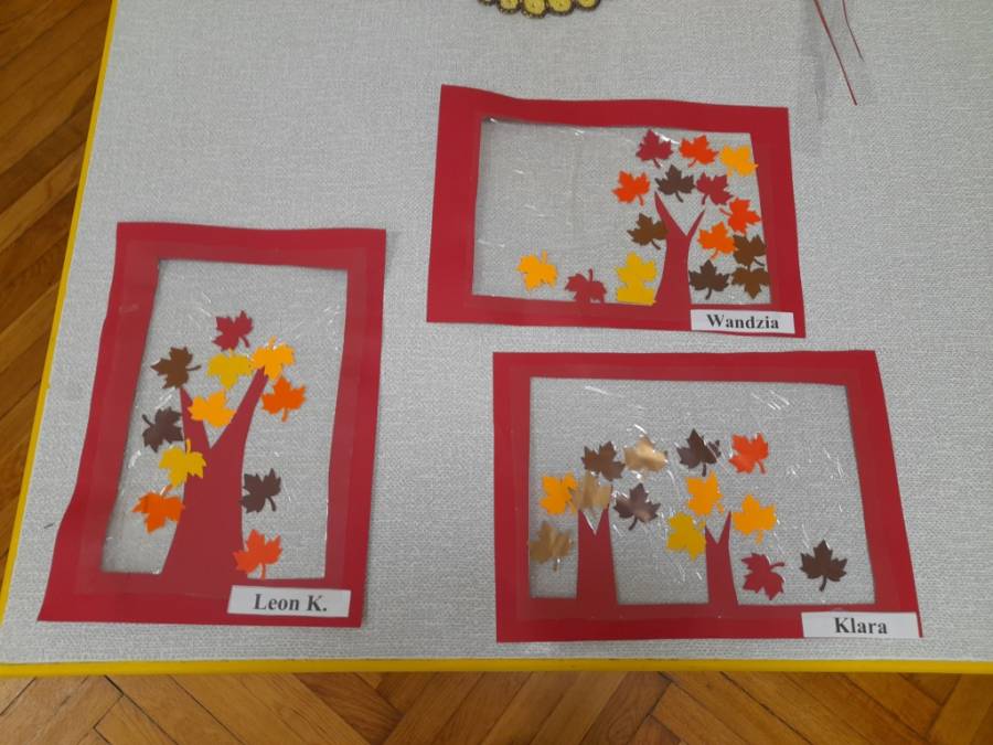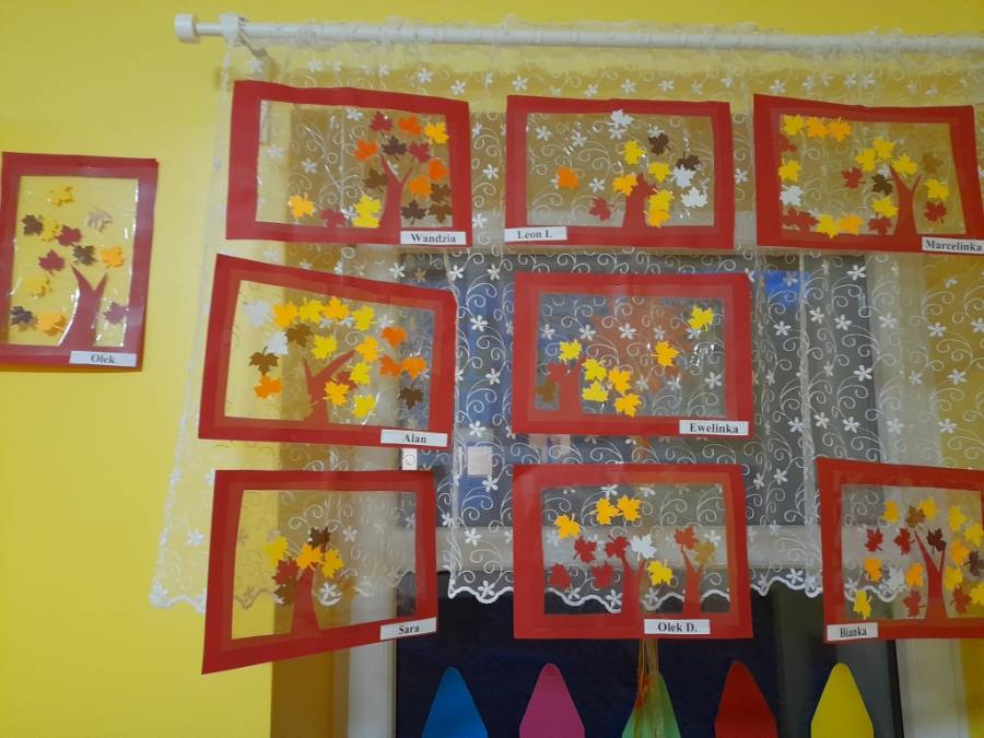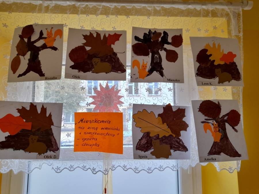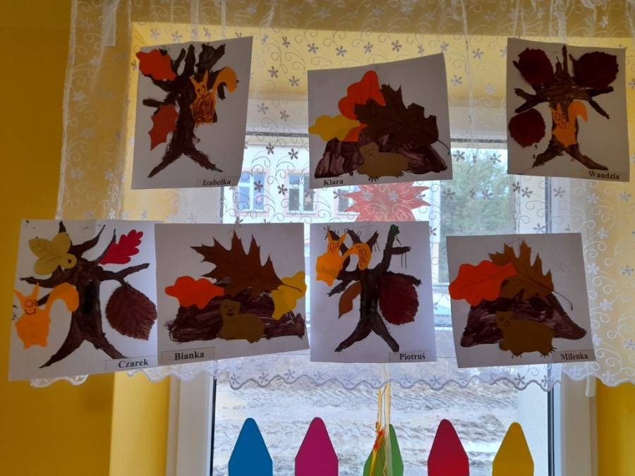 To cykl zajęć poświęconych jesieni i jej uroków. Dzieci słuchały wierszy i opowiadań dotyczących jesieni. Samodzielnie, pięknie opowiadały historyjki obrazkowe. By rozruszać dzieci zawsze towarzyszy nam zabawa ruchowa np. do piosenki /Ola i liście/w formie opowieści ruchowej, gdzie spacerowały, wirowały i zbierały rozrzucane liście. Później je przeliczały.  Do pracy plastycznej zatytułowanej /Las jesienią/ wykorzystano  szablony liści (imitujące drzewa). Innym pomysłem było wykonanie jesiennych witraży, gdzie na taśmie samoprzylepnej mogły naklejać listki i komponować swoje prace. W temacie jesiennym mówiono również o przygotowaniach leśnych zwierząt do zimy.