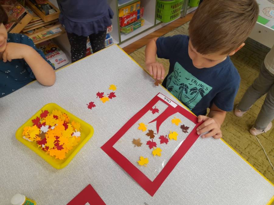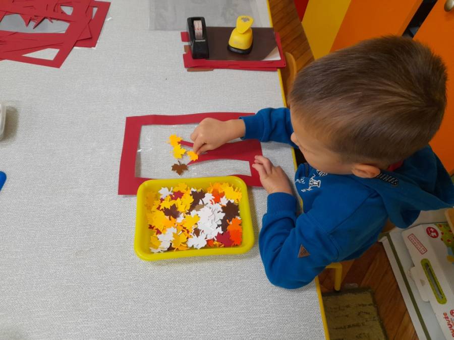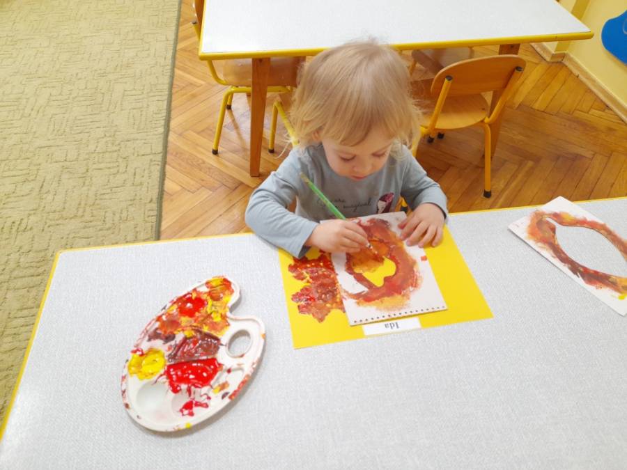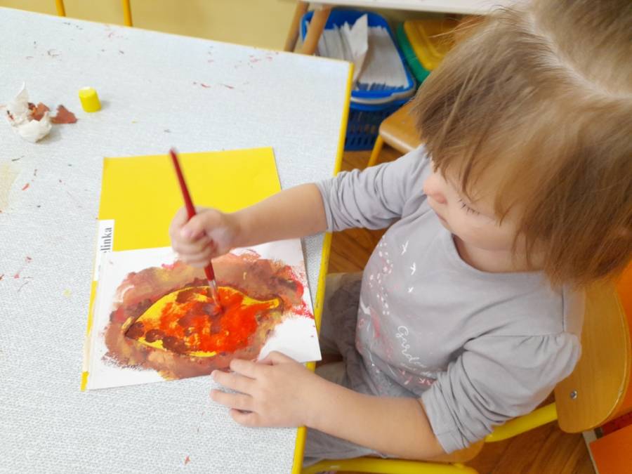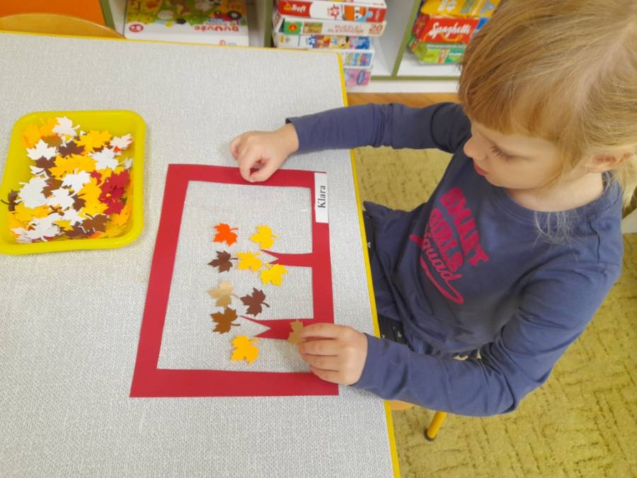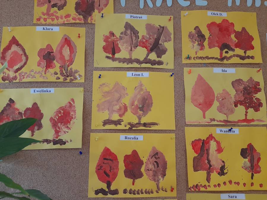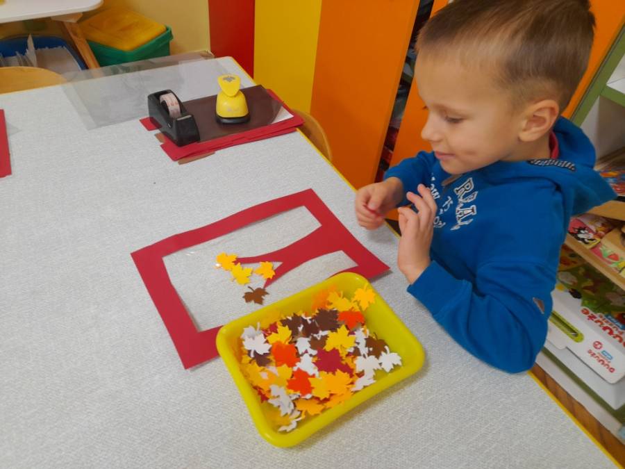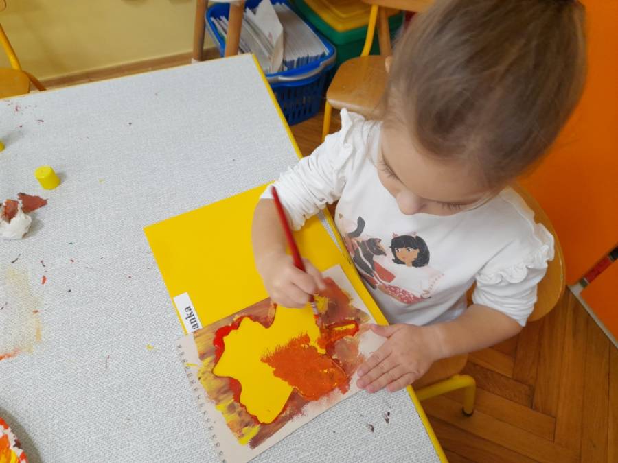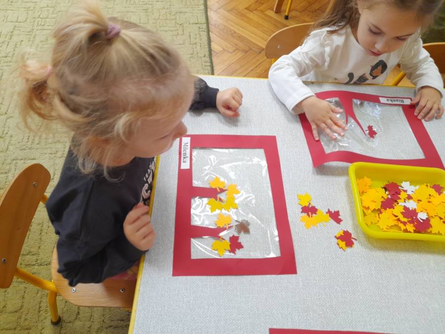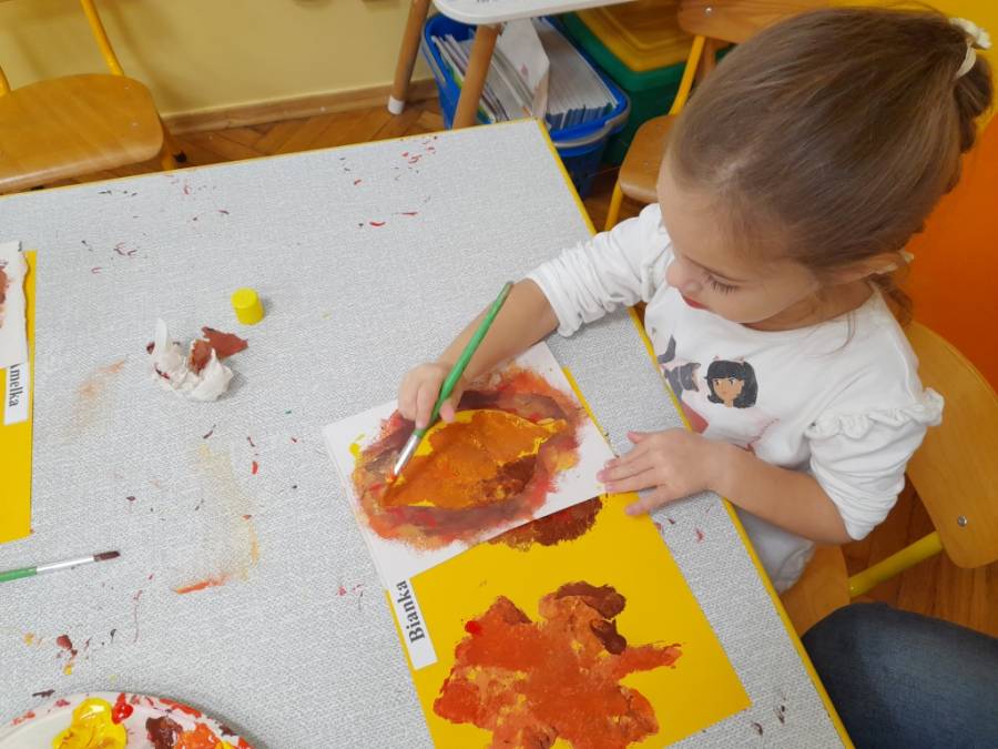 To cykl zajęć poświęconych jesieni i jej uroków. Dzieci słuchały wierszy i opowiadań dotyczących jesieni. Samodzielnie, pięknie opowiadały historyjki obrazkowe. By rozruszać dzieci zawsze towarzyszy nam zabawa ruchowa np. do piosenki /Ola i liście/w formie opowieści ruchowej, gdzie spacerowały, wirowały i zbierały rozrzucane liście. Później je przeliczały.  Do pracy plastycznej zatytułowanej /Las jesienią/ wykorzystano  szablony liści (imitujące drzewa). Innym pomysłem było wykonanie jesiennych witraży, gdzie na taśmie samoprzylepnej mogły naklejać listki i komponować swoje prace. W temacie jesiennym mówiono również o przygotowaniach leśnych zwierząt do zimy.
