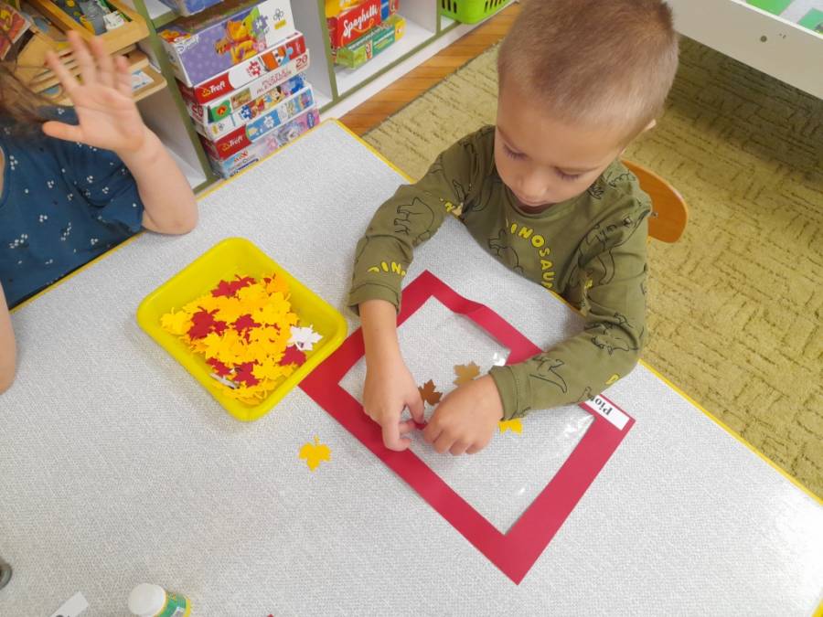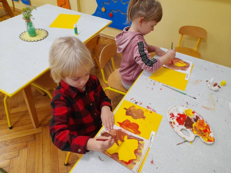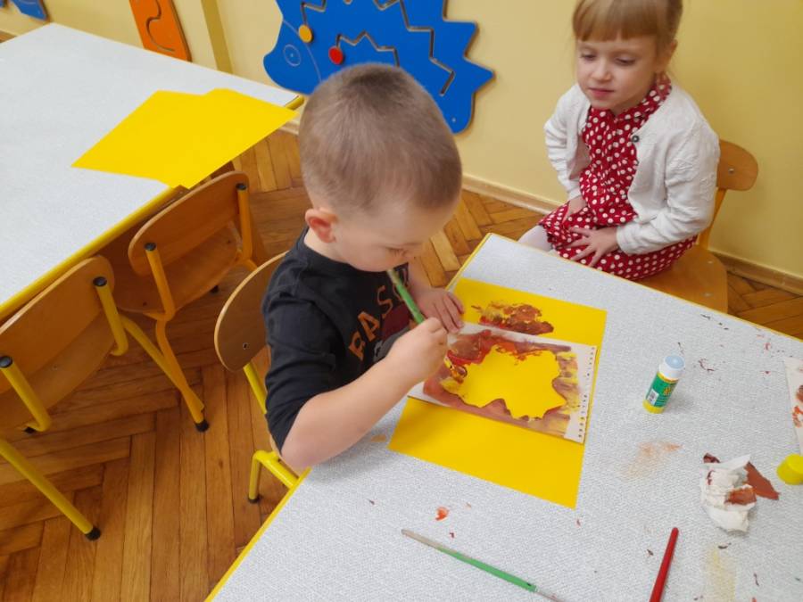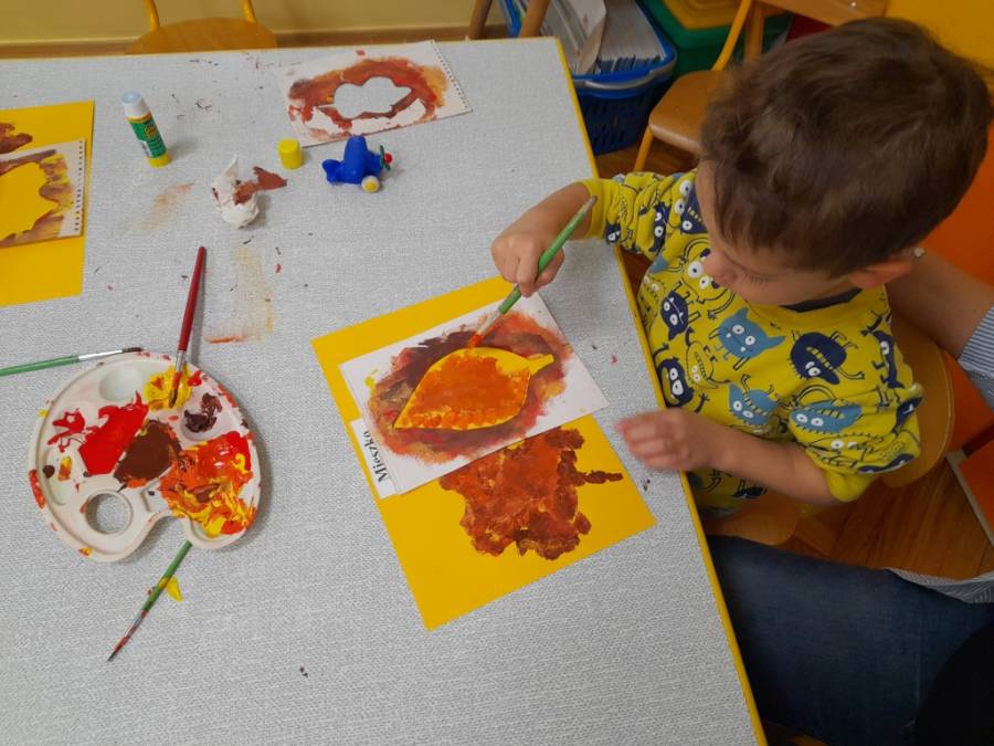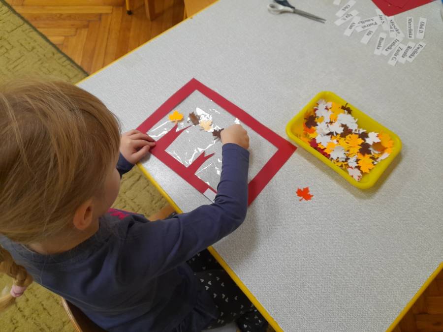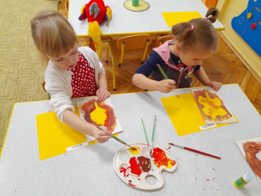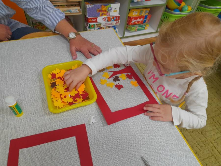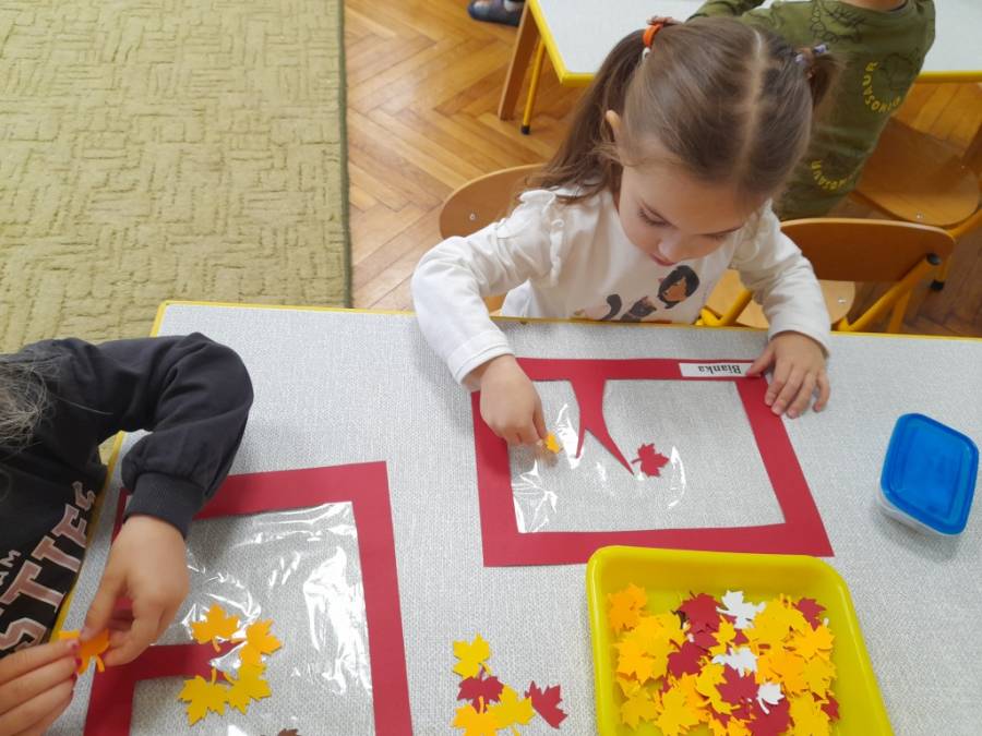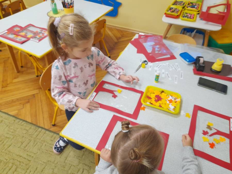 To cykl zajęć poświęconych jesieni i jej uroków. Dzieci słuchały wierszy i opowiadań dotyczących jesieni. Samodzielnie, pięknie opowiadały historyjki obrazkowe. By rozruszać dzieci zawsze towarzyszy nam zabawa ruchowa np. do piosenki /Ola i liście/w formie opowieści ruchowej, gdzie spacerowały, wirowały i zbierały rozrzucane liście. Później je przeliczały.  Do pracy plastycznej zatytułowanej /Las jesienią/ wykorzystano  szablony liści (imitujące drzewa). Innym pomysłem było wykonanie jesiennych witraży, gdzie na taśmie samoprzylepnej mogły naklejać listki i komponować swoje prace. W temacie jesiennym mówiono również o przygotowaniach leśnych zwierząt do zimy.