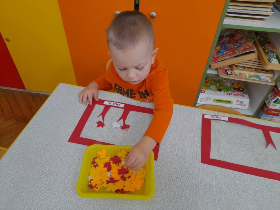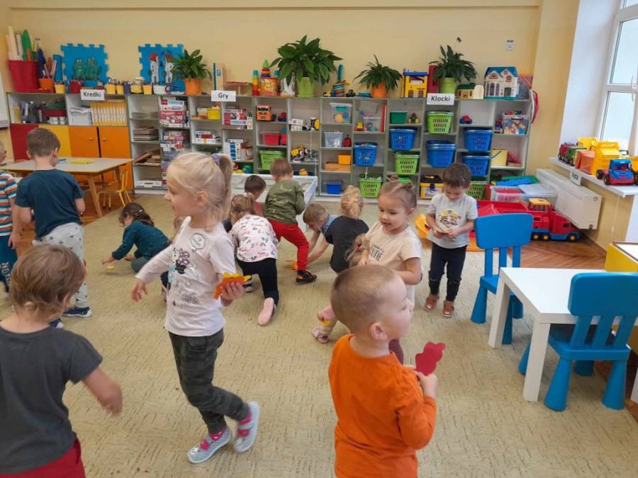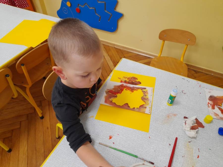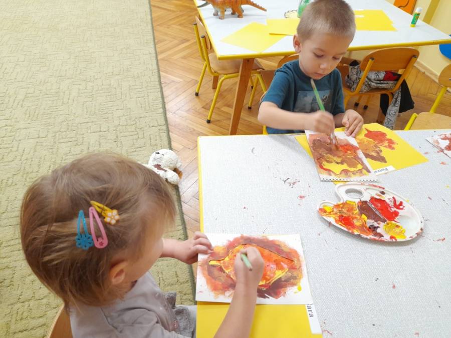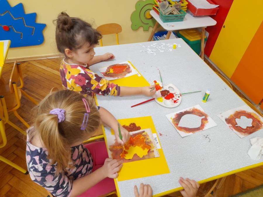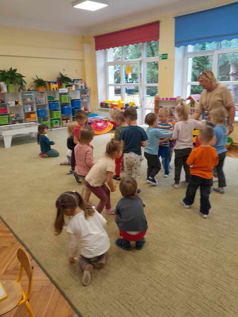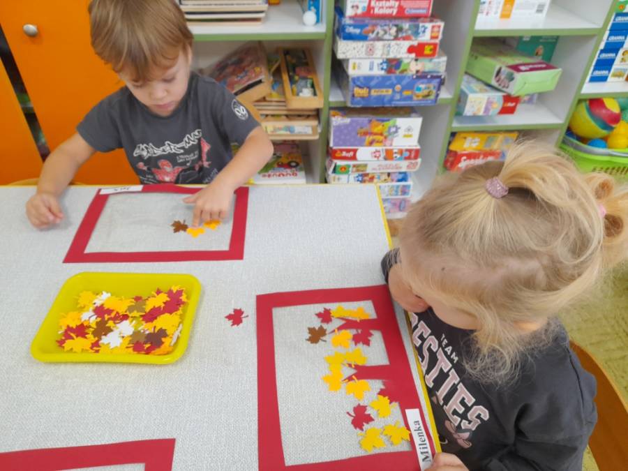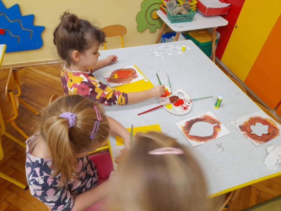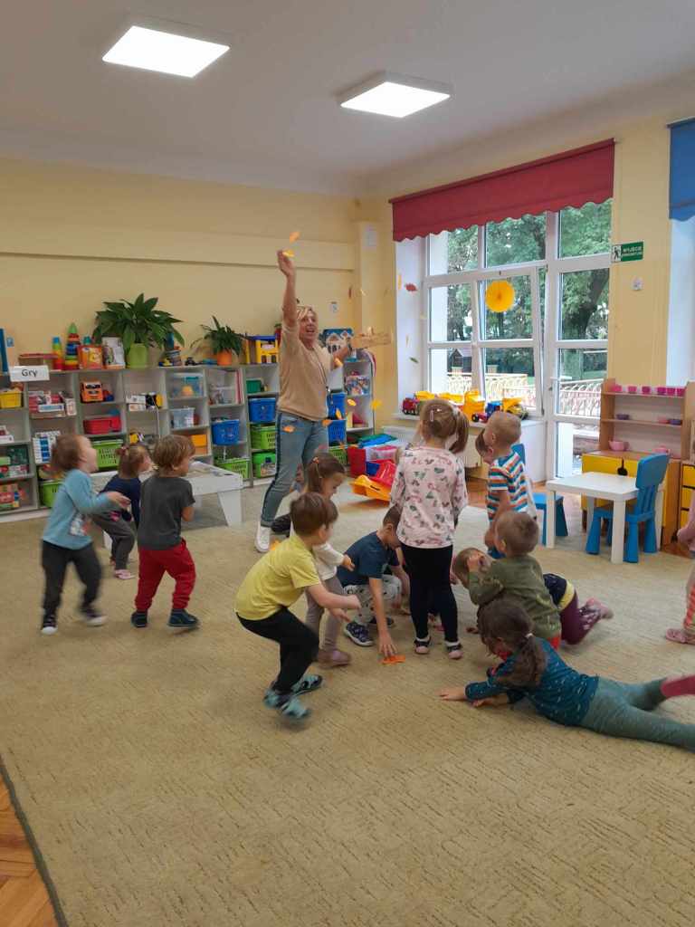 To cykl zajęć poświęconych jesieni i jej uroków. Dzieci słuchały wierszy i opowiadań dotyczących jesieni. Samodzielnie, pięknie opowiadały historyjki obrazkowe. By rozruszać dzieci zawsze towarzyszy nam zabawa ruchowa np. do piosenki /Ola i liście/w formie opowieści ruchowej, gdzie spacerowały, wirowały i zbierały rozrzucane liście. Później je przeliczały.  Do pracy plastycznej zatytułowanej /Las jesienią/ wykorzystano  szablony liści (imitujące drzewa). Innym pomysłem było wykonanie jesiennych witraży, gdzie na taśmie samoprzylepnej mogły naklejać listki i komponować swoje prace. W temacie jesiennym mówiono również o przygotowaniach leśnych zwierząt do zimy.