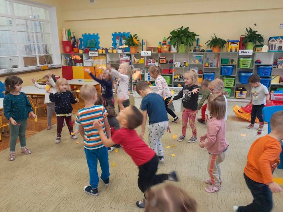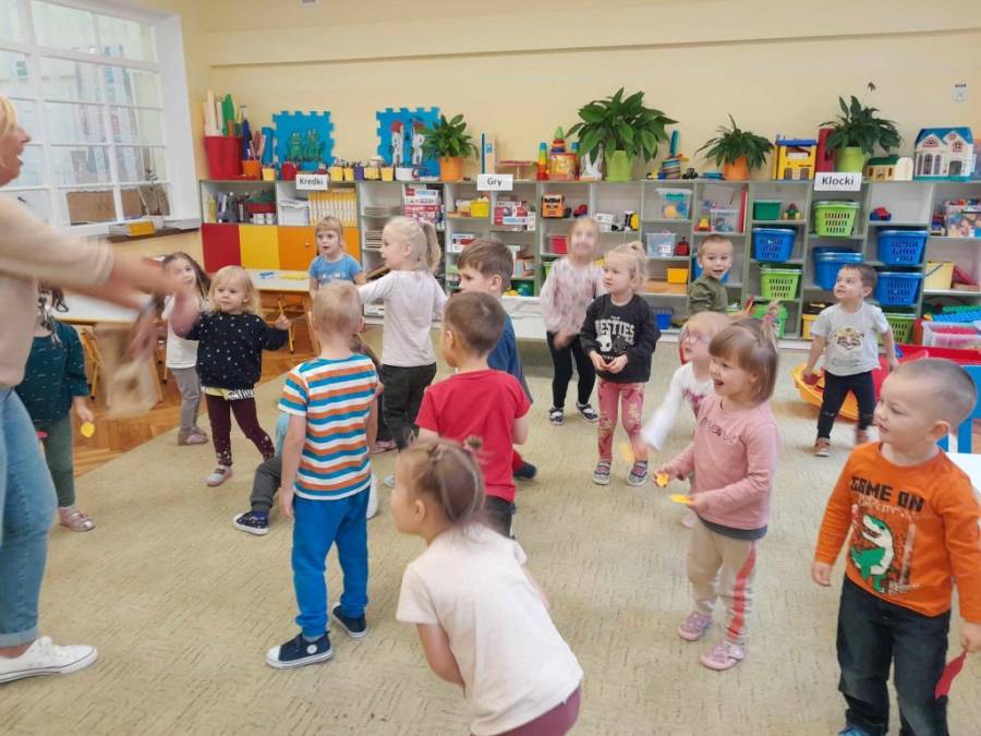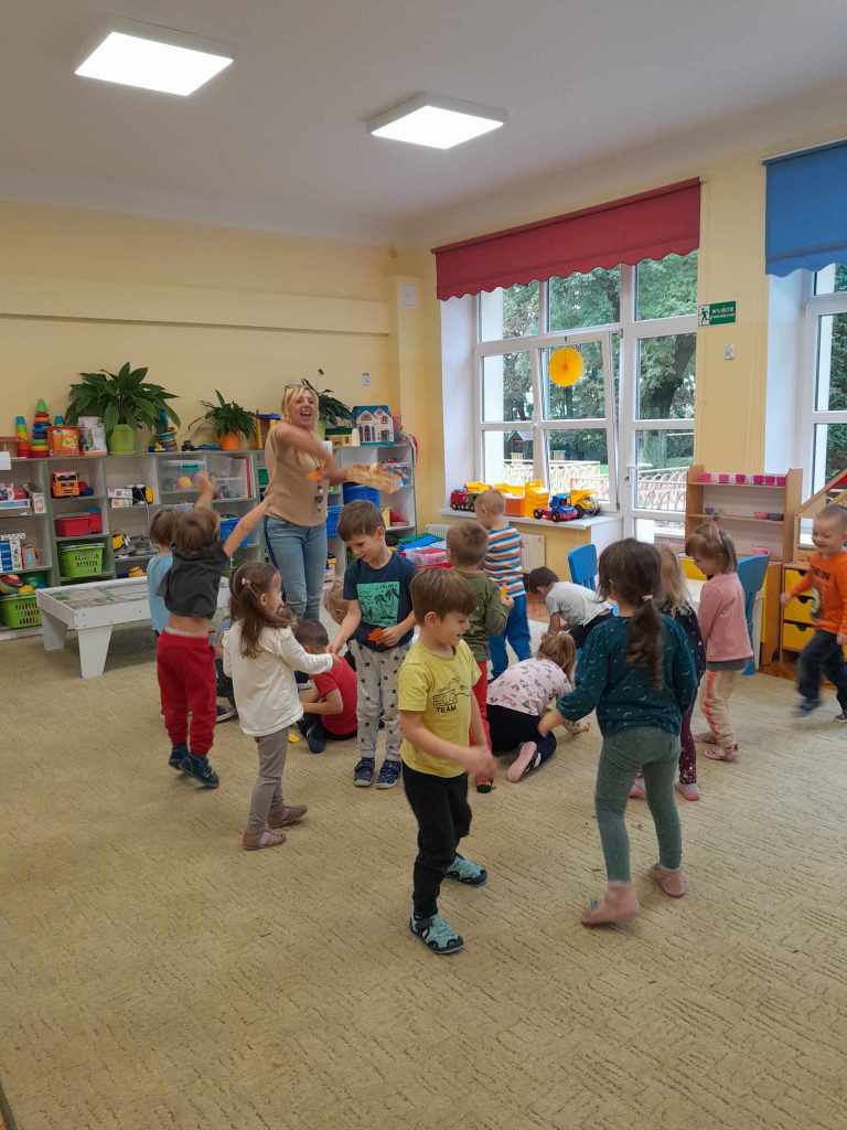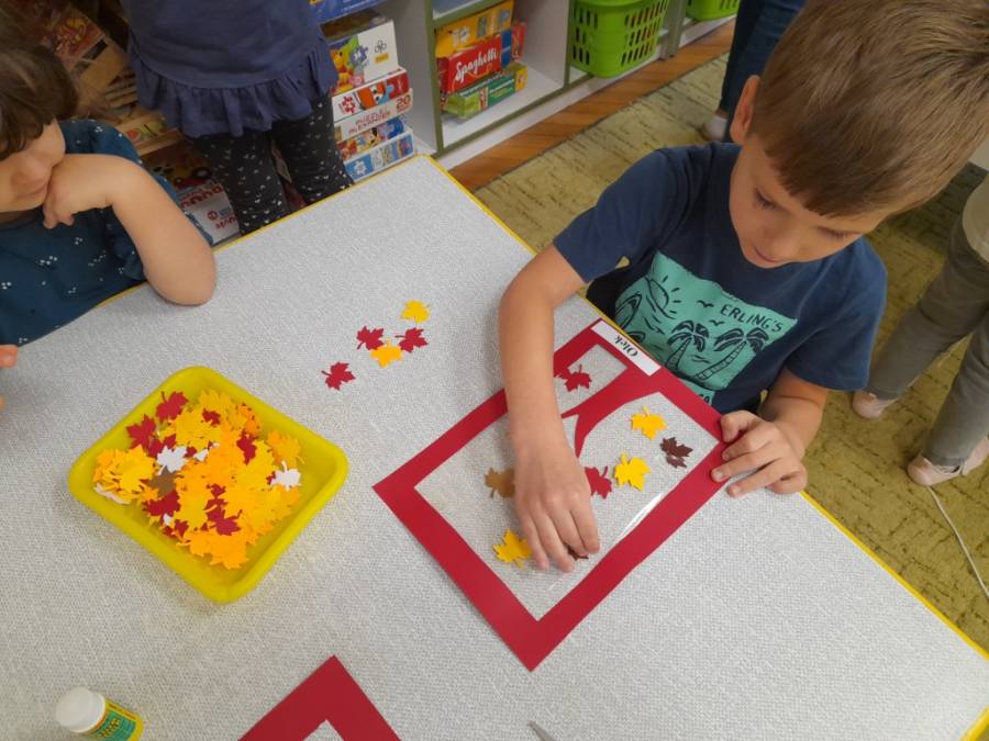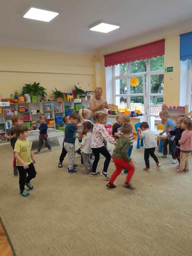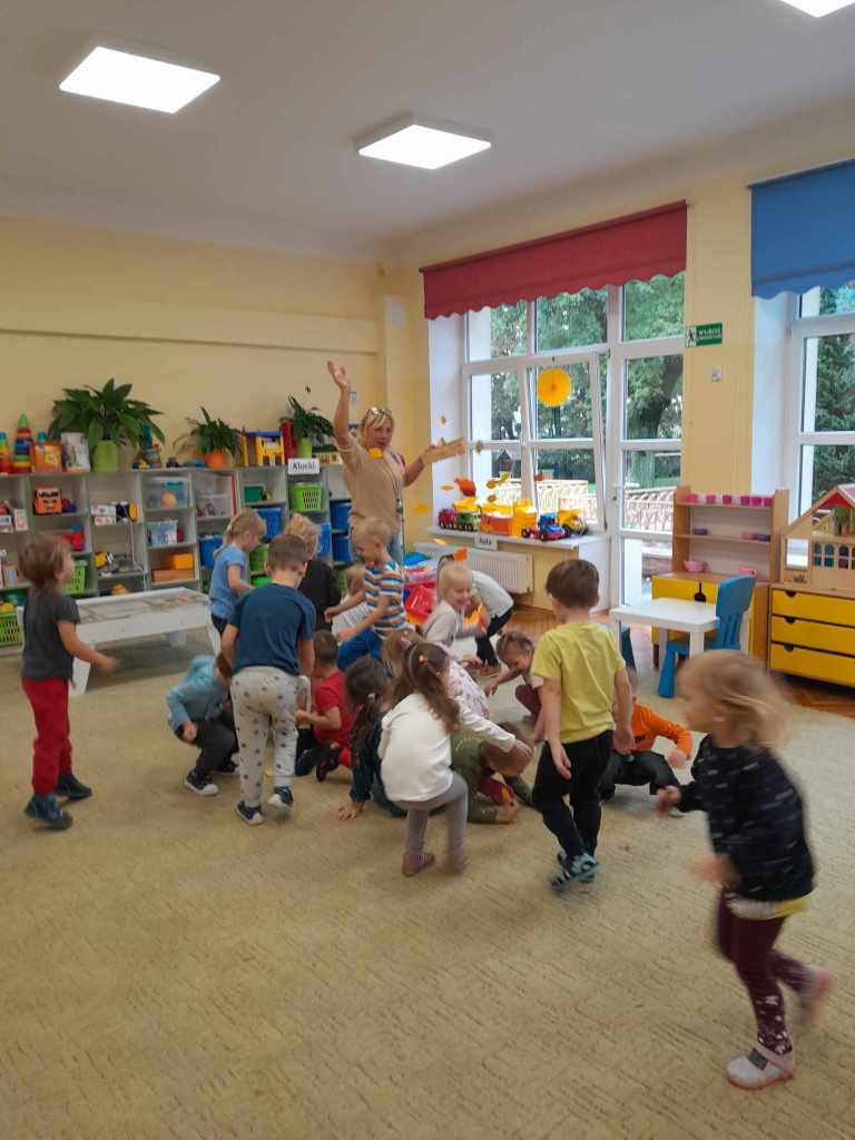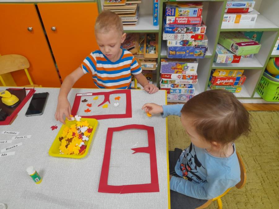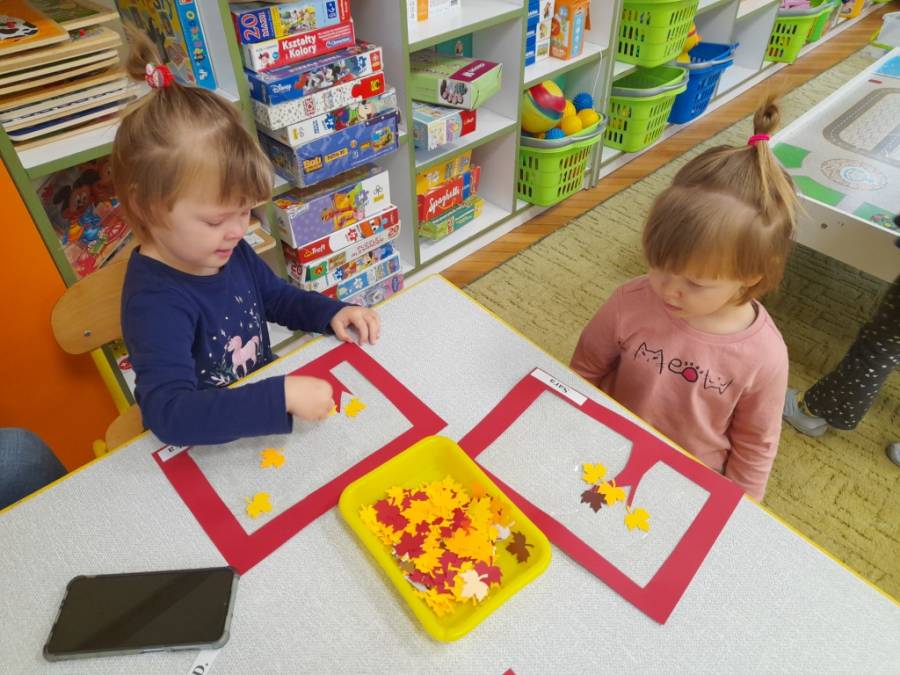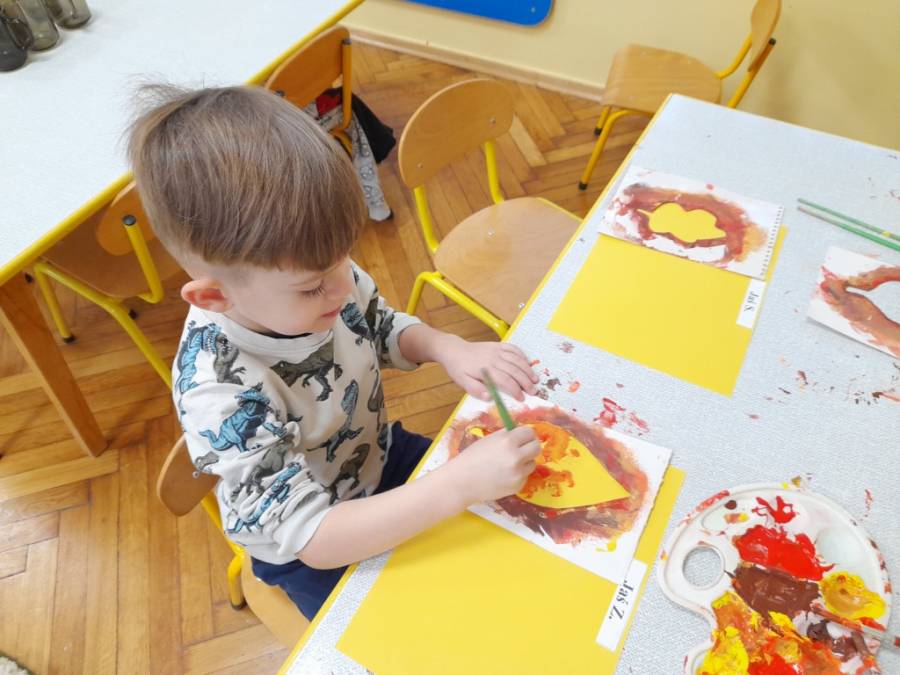 To cykl zajęć poświęconych jesieni i jej uroków. Dzieci słuchały wierszy i opowiadań dotyczących jesieni. Samodzielnie, pięknie opowiadały historyjki obrazkowe. By rozruszać dzieci zawsze towarzyszy nam zabawa ruchowa np. do piosenki /Ola i liście/w formie opowieści ruchowej, gdzie spacerowały, wirowały i zbierały rozrzucane liście. Później je przeliczały.  Do pracy plastycznej zatytułowanej /Las jesienią/ wykorzystano  szablony liści (imitujące drzewa). Innym pomysłem było wykonanie jesiennych witraży, gdzie na taśmie samoprzylepnej mogły naklejać listki i komponować swoje prace. W temacie jesiennym mówiono również o przygotowaniach leśnych zwierząt do zimy.