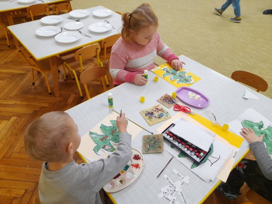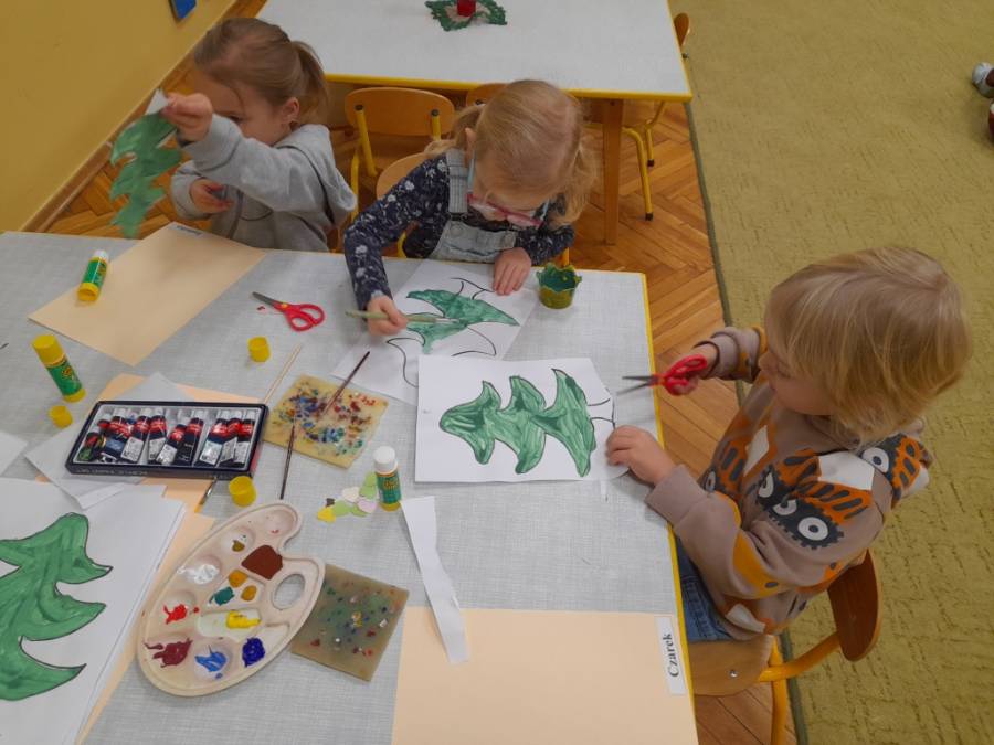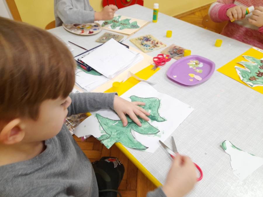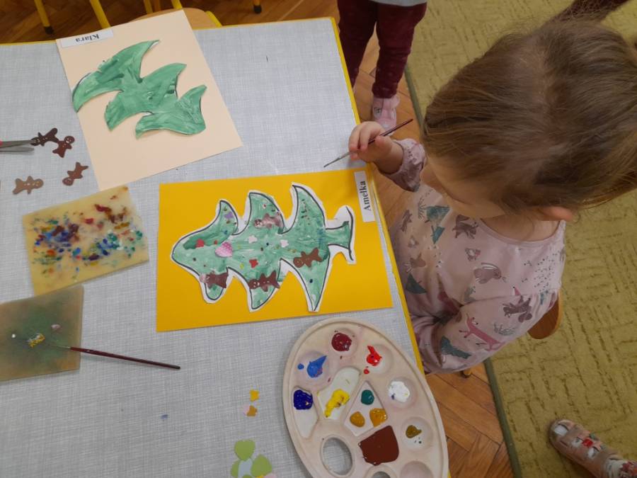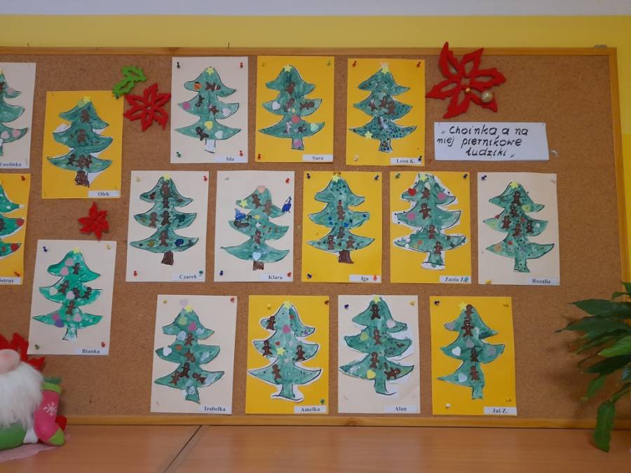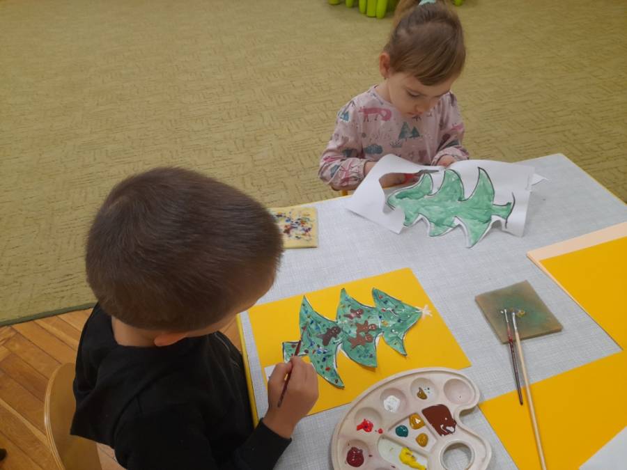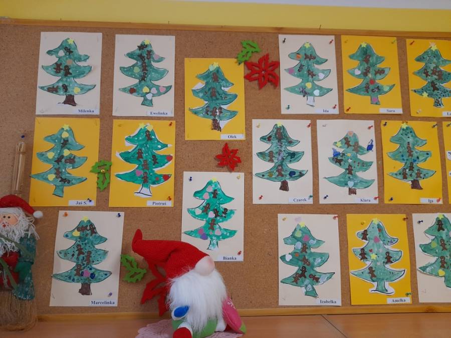 Program zajęć twórczych w grupie, to nie tylko malowanie, ale zdobywanie różnych umiejętności w wielu dziedzinach. Inspiracją jest zawsze tekst literacki, rozmowy, różne wydarzenia przedszkolne oraz doświadczenia dzieci. Zbliżające się Święta, to temat bardzo szeroki, gdzie pomysłów na nowe ciekawe prace nie brakuje. Dziecięce portfolio powiększa się o kolejne prace związane z przedświątecznymi zakupami oraz zdobieniem choinki w piernikowe ludziki.
