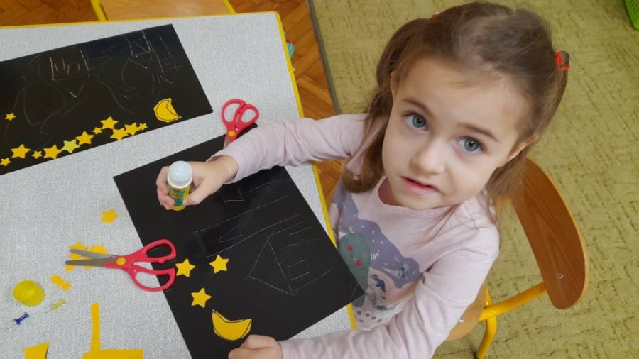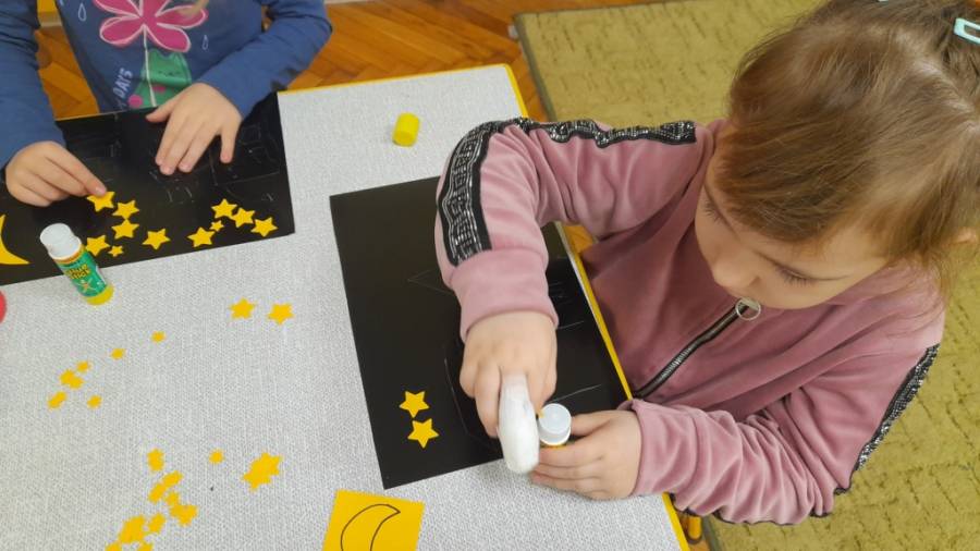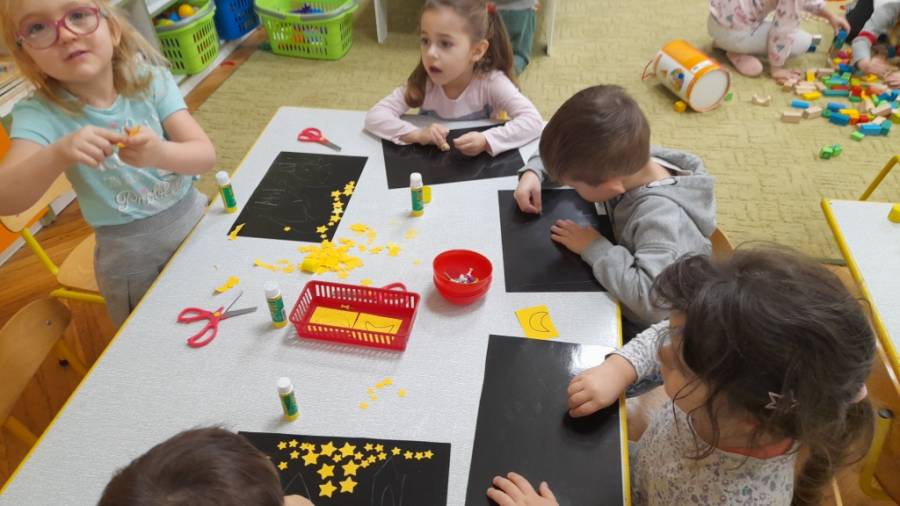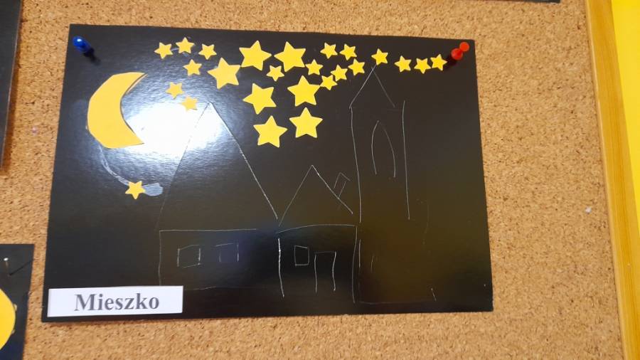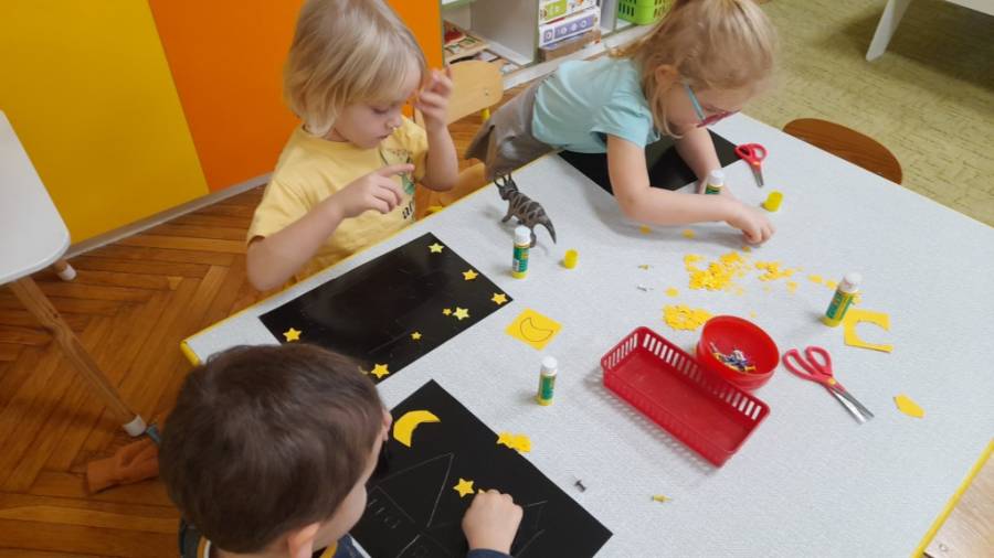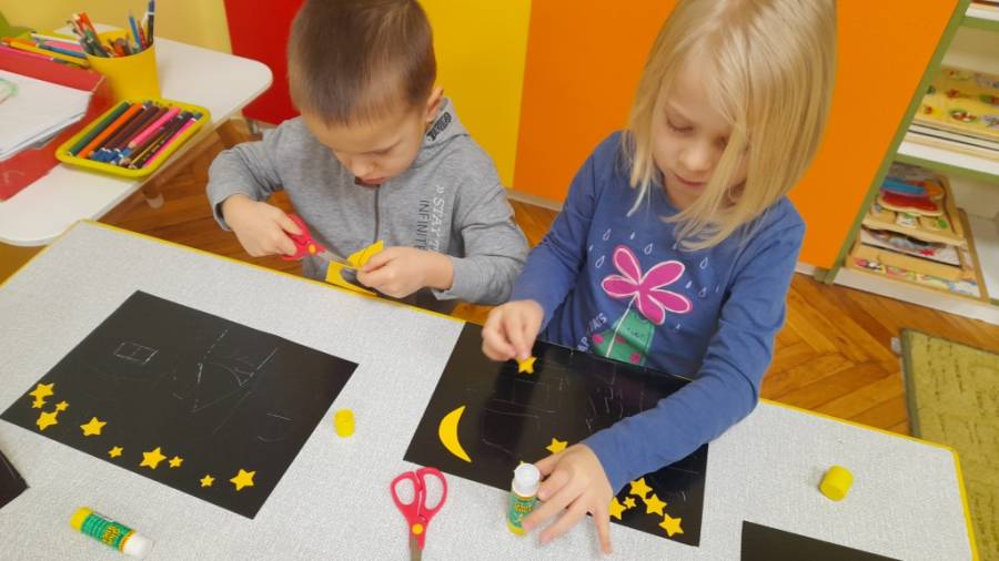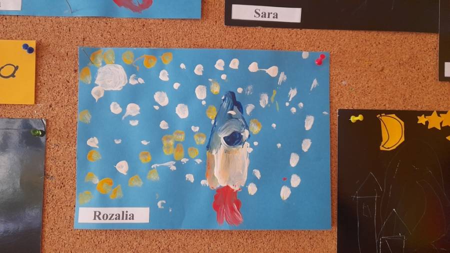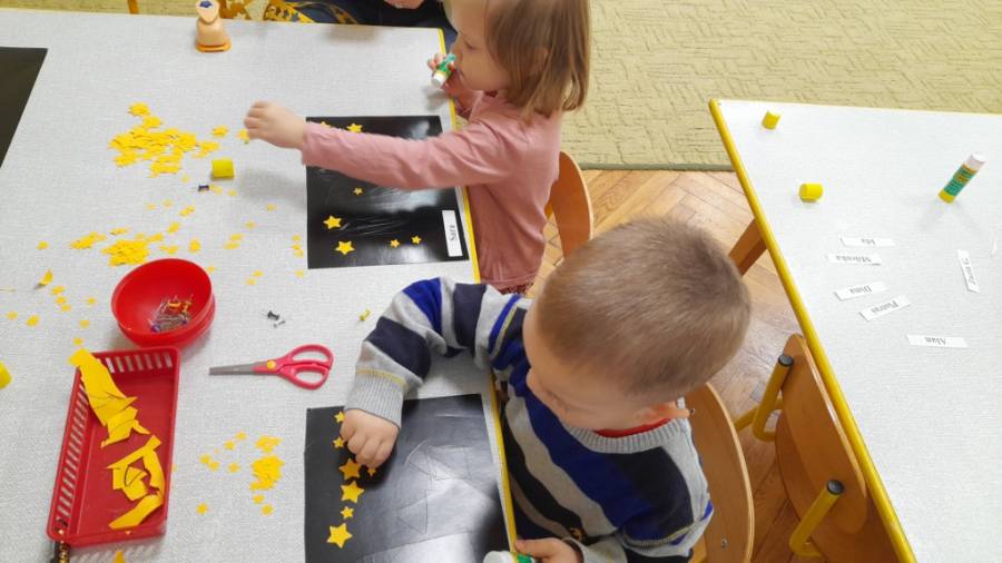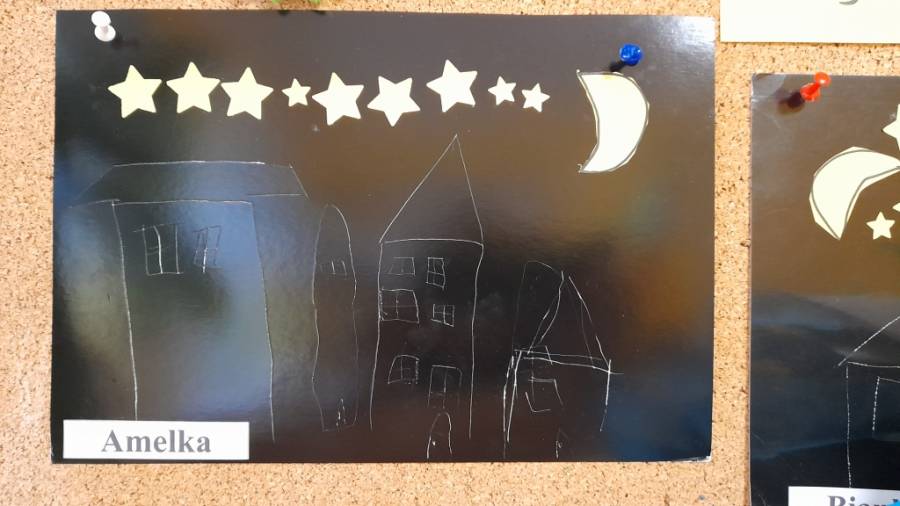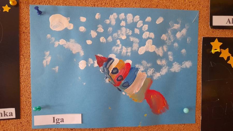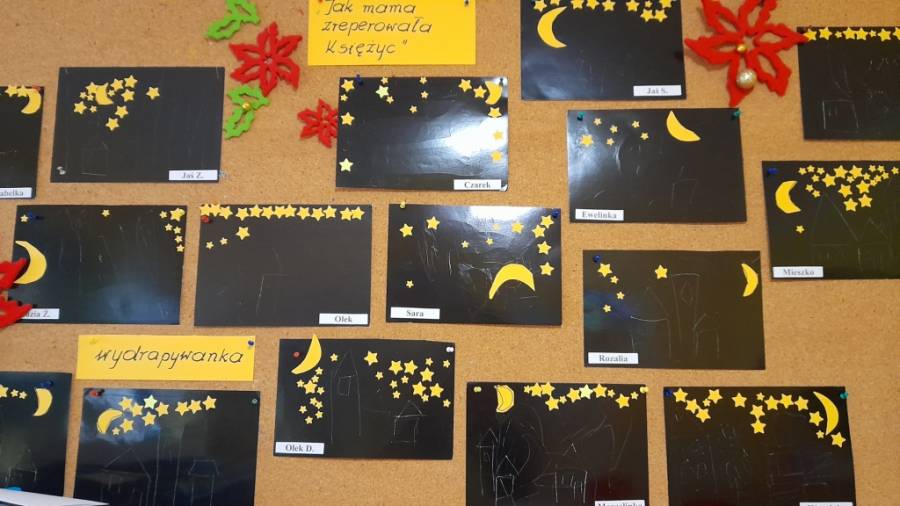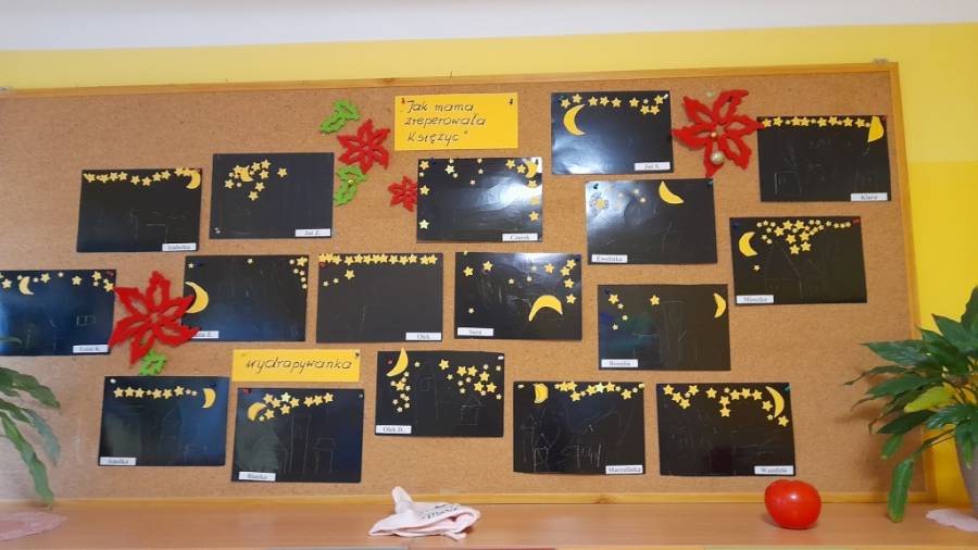 Zajęcia poświęcone omawianiu planet krążących wokół Słońca. Dzieci oglądały książki i ilustracje związane z Kosmosem. Z uwagą słuchały opowiadania Joanny Papuzińskiej pt. /Jak mama zreperowała księżyc/, popartej historyjką obrazkową. Powstały ilustracje wykonane nową techniką. Za pomocą pinezki dzieci wydrapywały domy i wieże miast. Na koniec wycinały Księżyc i łącznie z gwiazdkami naklejały na kartkę. Innym zadaniem, było malowanie gwiazd i księżyca, na który leci rakieta. Zajęcia połączone były z zabawami ruchowymi przy muzyce /w Kosmosie/