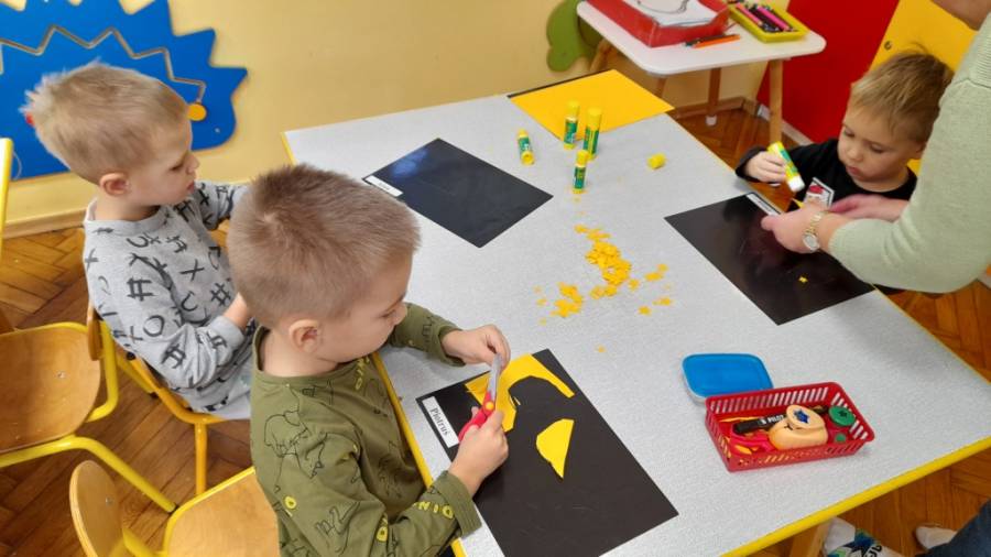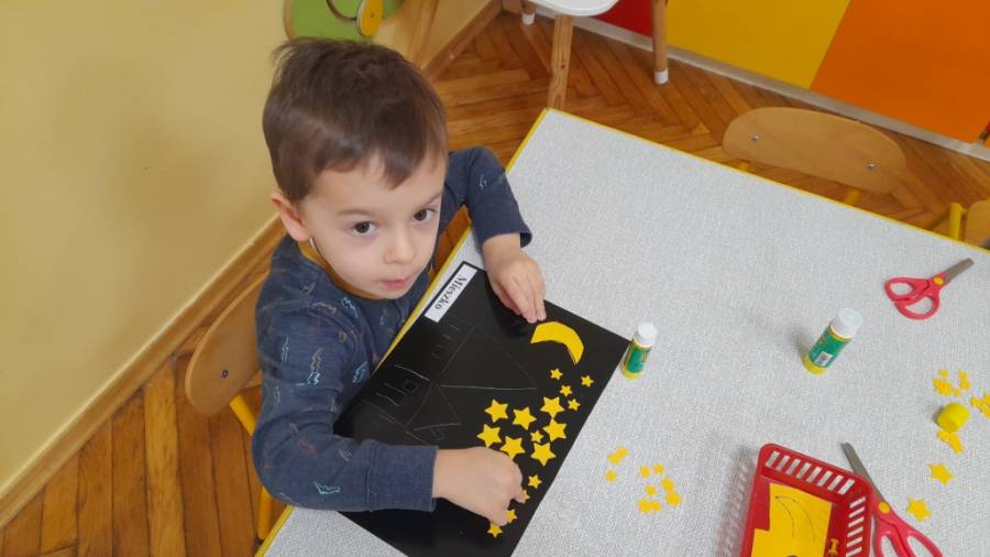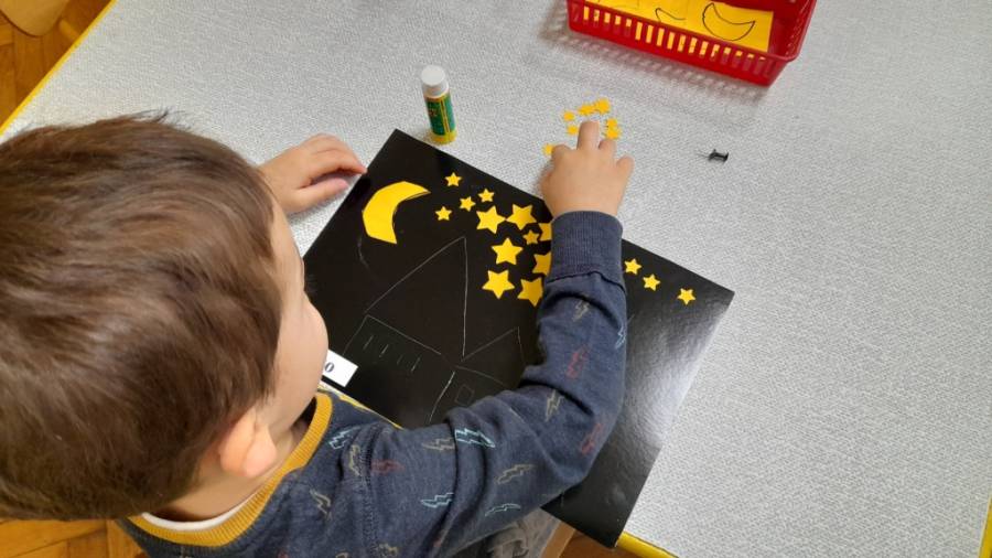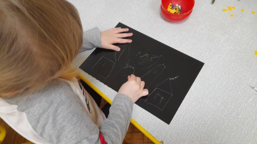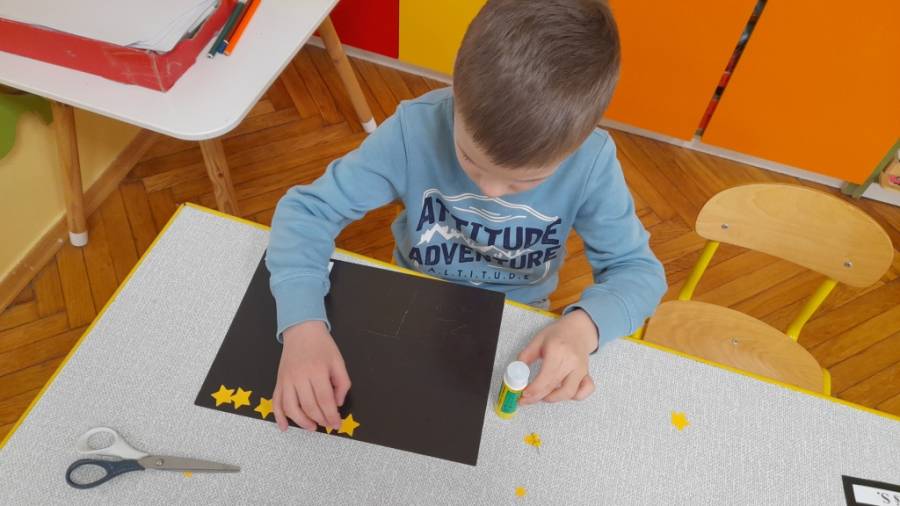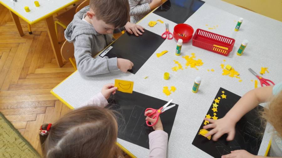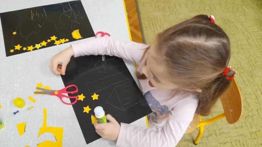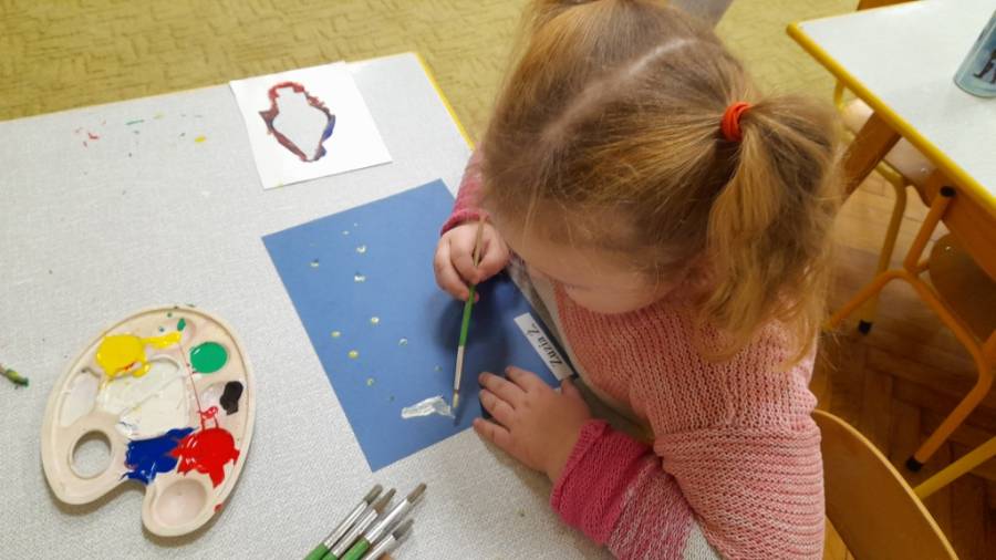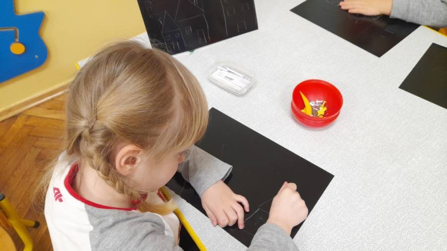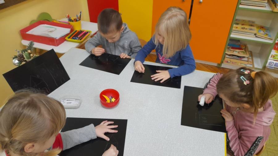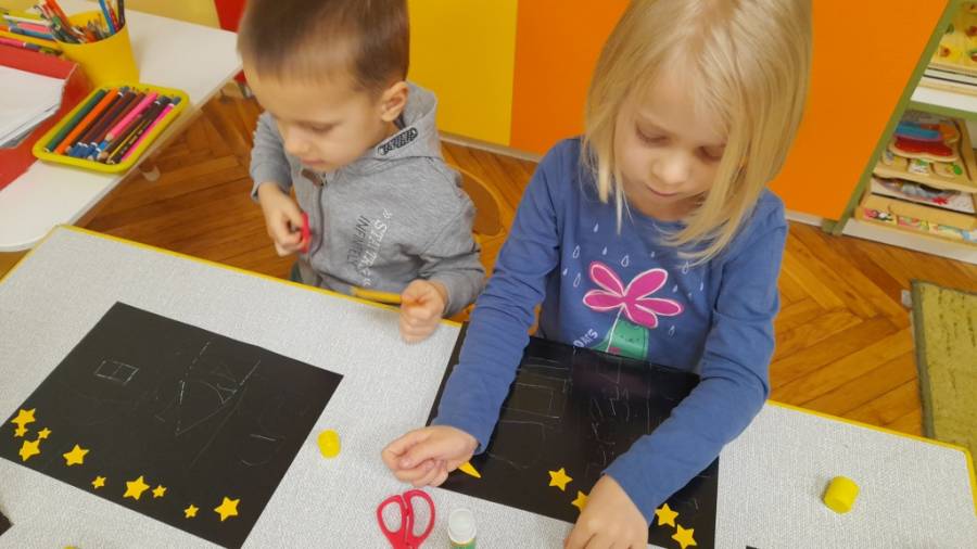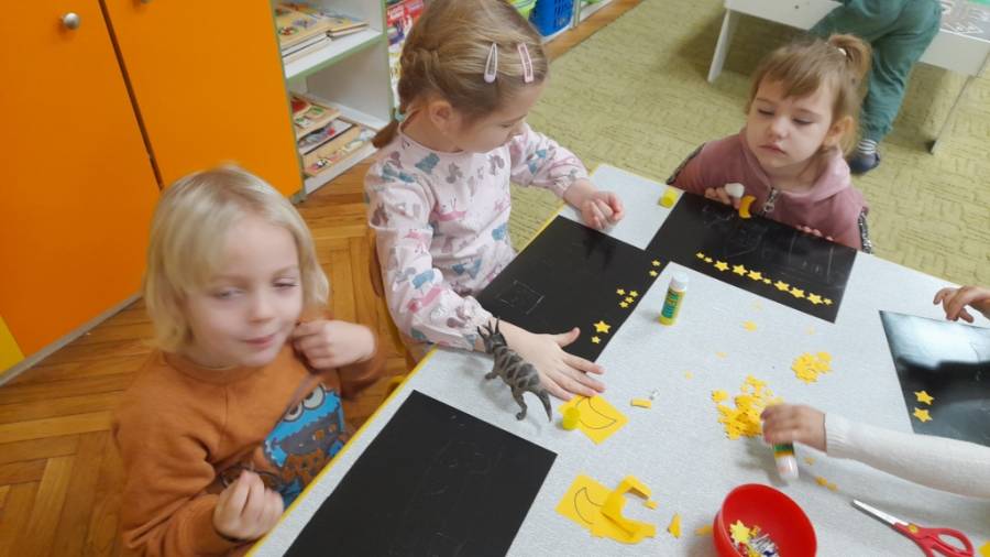 Zajęcia poświęcone omawianiu planet krążących wokół Słońca. Dzieci oglądały książki i ilustracje związane z Kosmosem. Z uwagą słuchały opowiadania Joanny Papuzińskiej pt. /Jak mama zreperowała księżyc/, popartej historyjką obrazkową. Powstały ilustracje wykonane nową techniką. Za pomocą pinezki dzieci wydrapywały domy i wieże miast. Na koniec wycinały Księżyc i łącznie z gwiazdkami naklejały na kartkę. Innym zadaniem, było malowanie gwiazd i księżyca, na który leci rakieta. Zajęcia połączone były z zabawami ruchowymi przy muzyce /w Kosmosie/