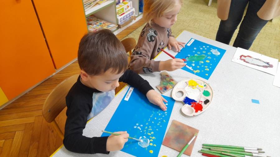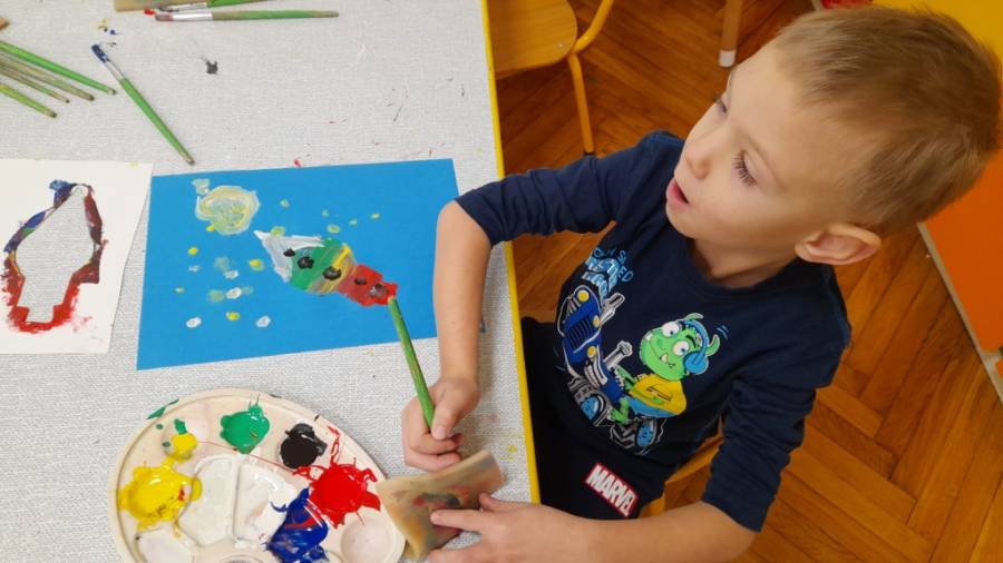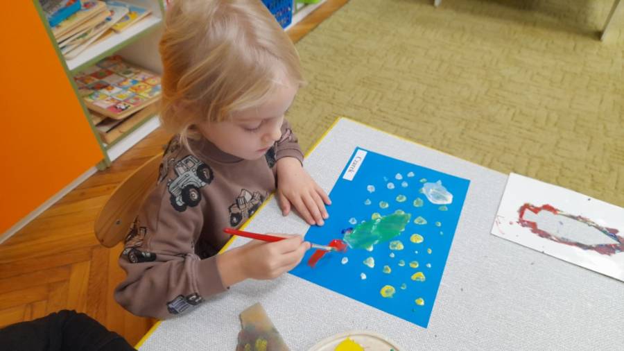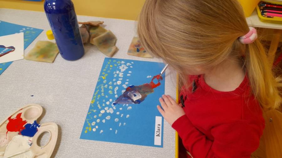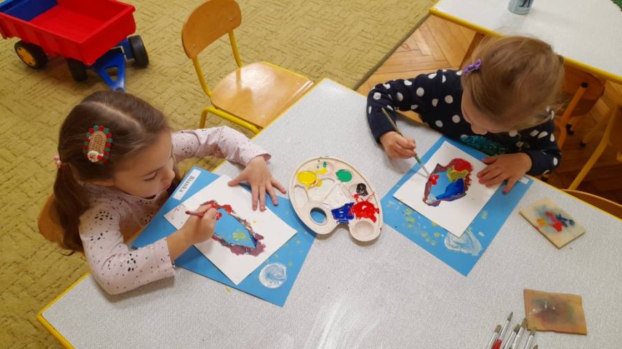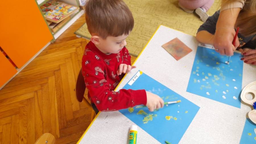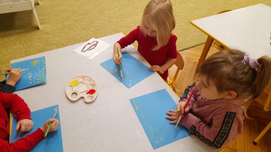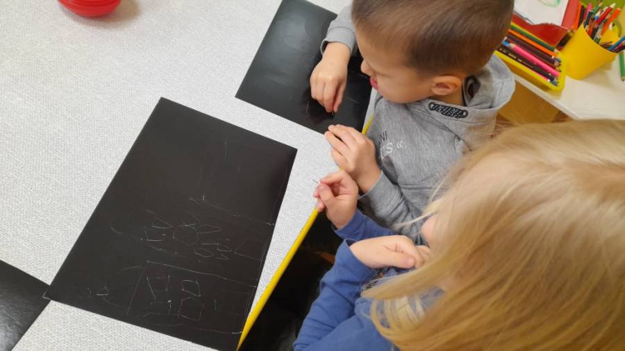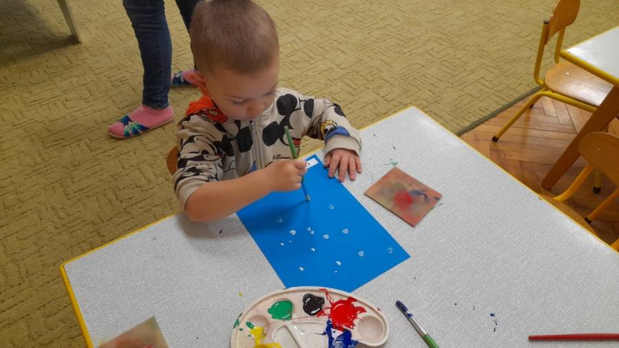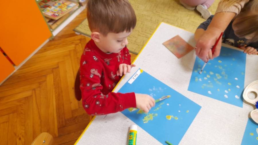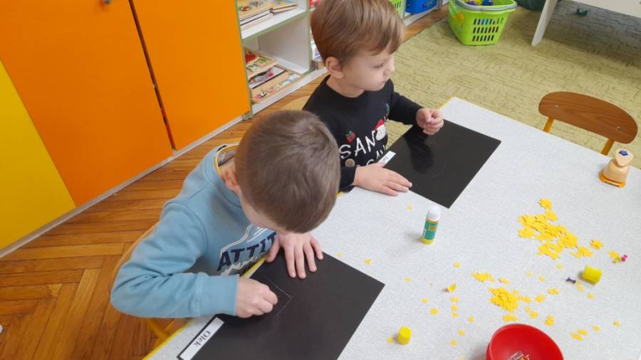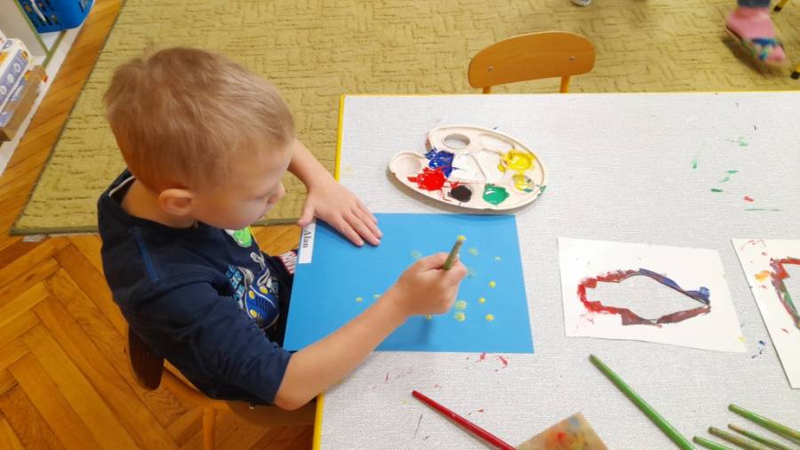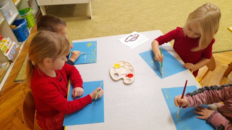 Zajęcia poświęcone omawianiu planet krążących wokół Słońca. Dzieci oglądały książki i ilustracje związane z Kosmosem. Z uwagą słuchały opowiadania Joanny Papuzińskiej pt. /Jak mama zreperowała księżyc/, popartej historyjką obrazkową. Powstały ilustracje wykonane nową techniką. Za pomocą pinezki dzieci wydrapywały domy i wieże miast. Na koniec wycinały Księżyc i łącznie z gwiazdkami naklejały na kartkę. Innym zadaniem, było malowanie gwiazd i księżyca, na który leci rakieta. Zajęcia połączone były z zabawami ruchowymi przy muzyce /w Kosmosie/