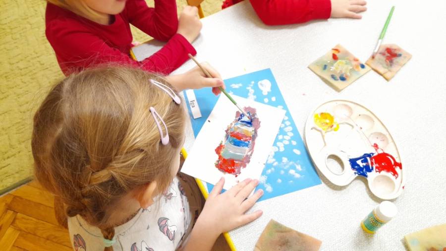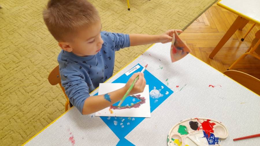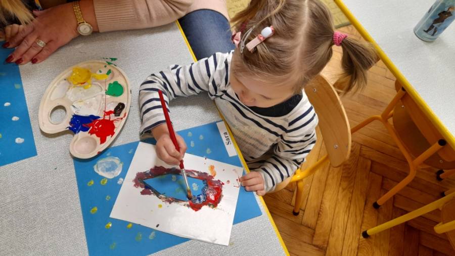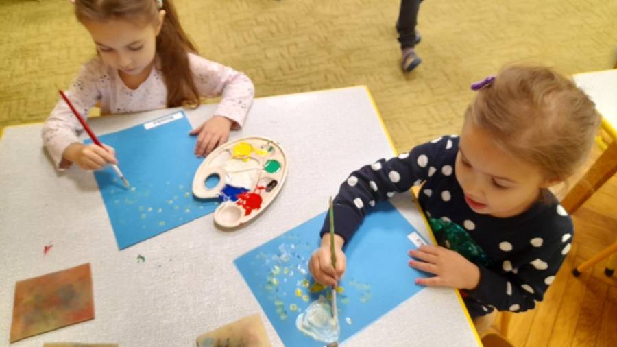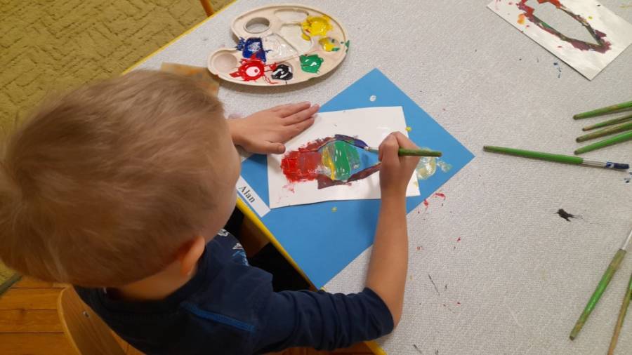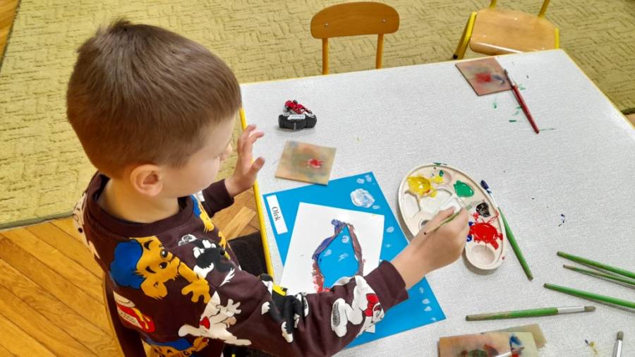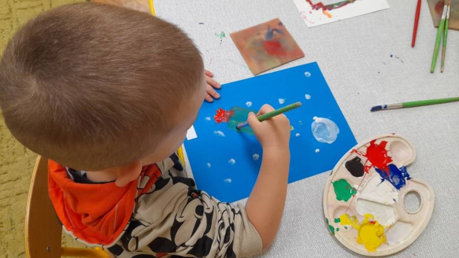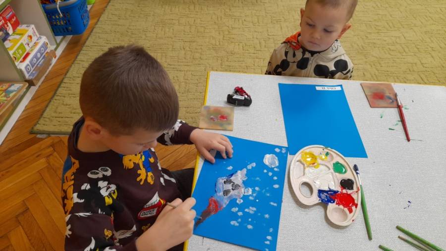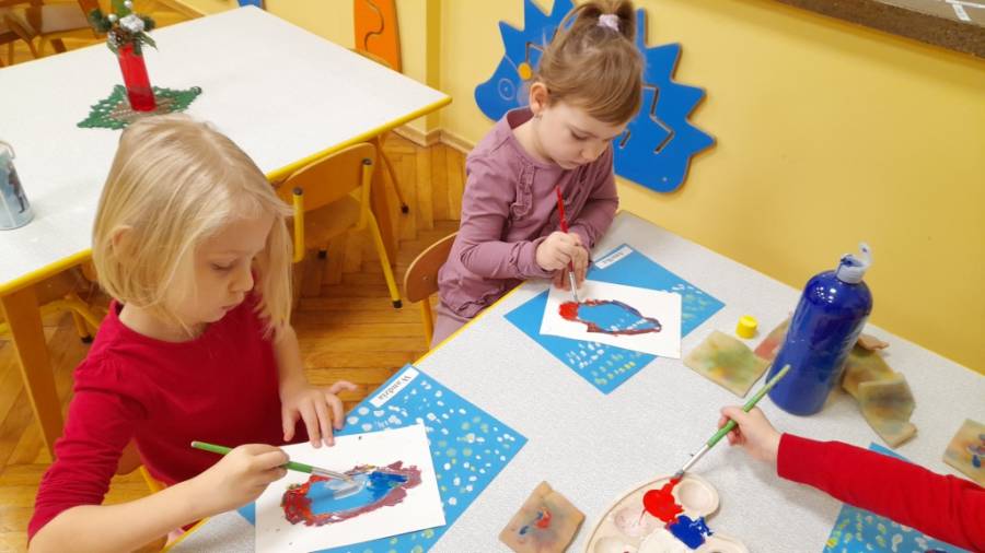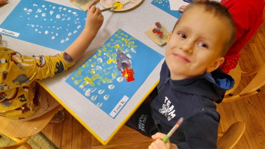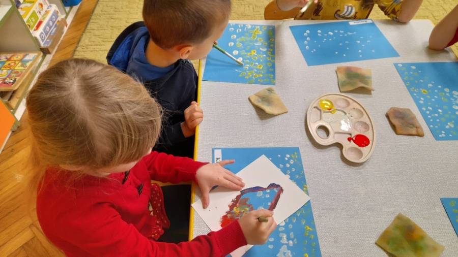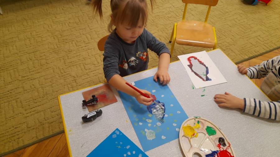 Zajęcia poświęcone omawianiu planet krążących wokół Słońca. Dzieci oglądały książki i ilustracje związane z Kosmosem. Z uwagą słuchały opowiadania Joanny Papuzińskiej pt. /Jak mama zreperowała księżyc/, popartej historyjką obrazkową. Powstały ilustracje wykonane nową techniką. Za pomocą pinezki dzieci wydrapywały domy i wieże miast. Na koniec wycinały Księżyc i łącznie z gwiazdkami naklejały na kartkę. Innym zadaniem, było malowanie gwiazd i księżyca, na który leci rakieta. Zajęcia połączone były z zabawami ruchowymi przy muzyce /w Kosmosie/