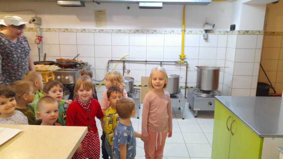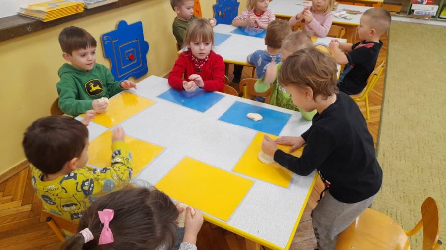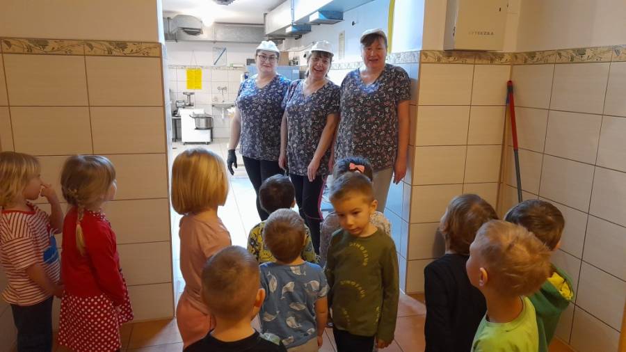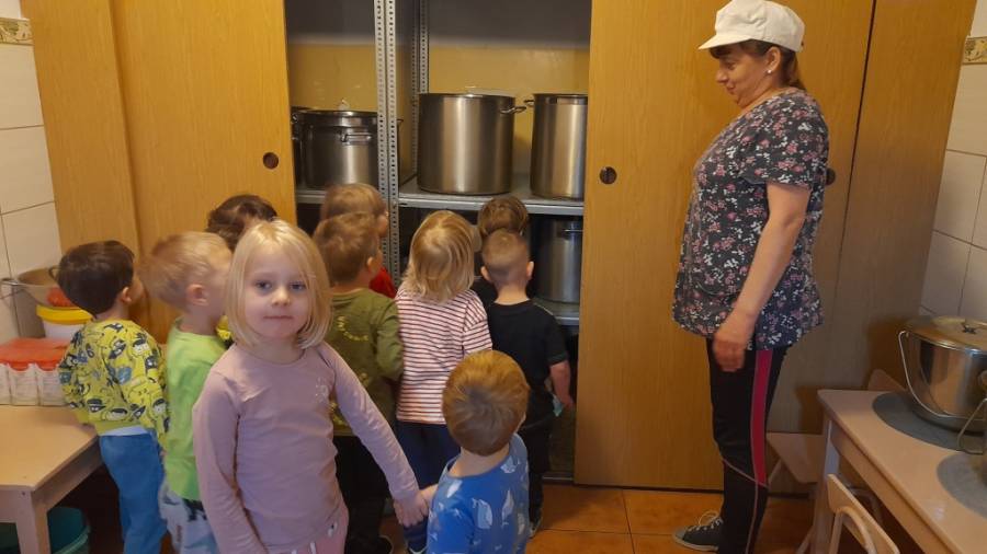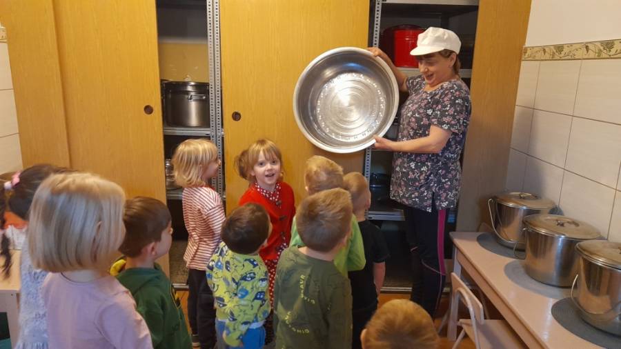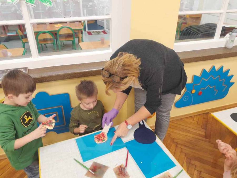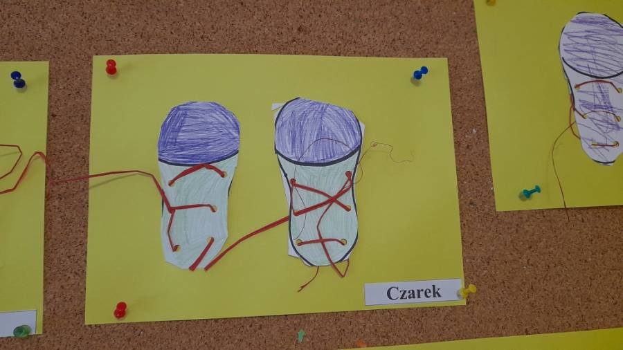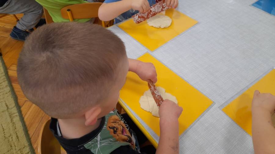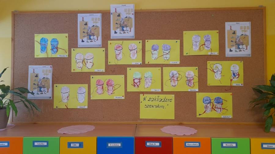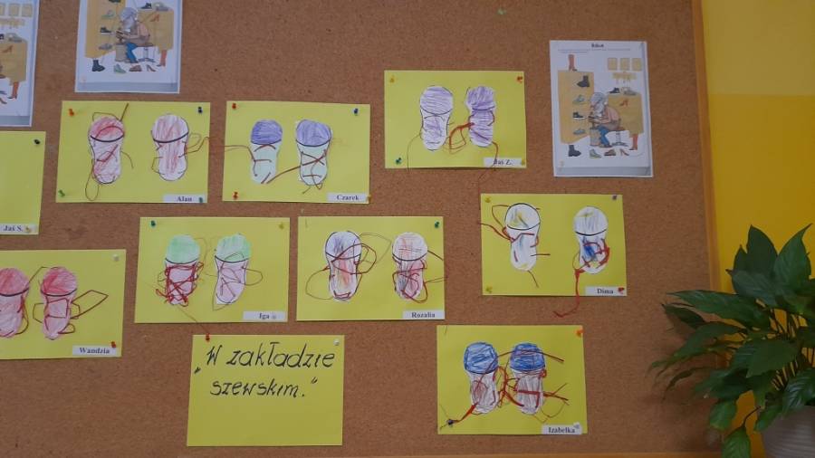 To obszerny temat, który zaplanowano na dwa tygodnie. Dzieci dowiedziały się, jaką pracę wykonuje szewc. /Szyły buty/ przewlekając sznurek przez dziurkę.  Odwiedziły również Panie Kucharki, które chętnie opowiedziały dzieciom o swojej pracy.  Powstały mini pizze.